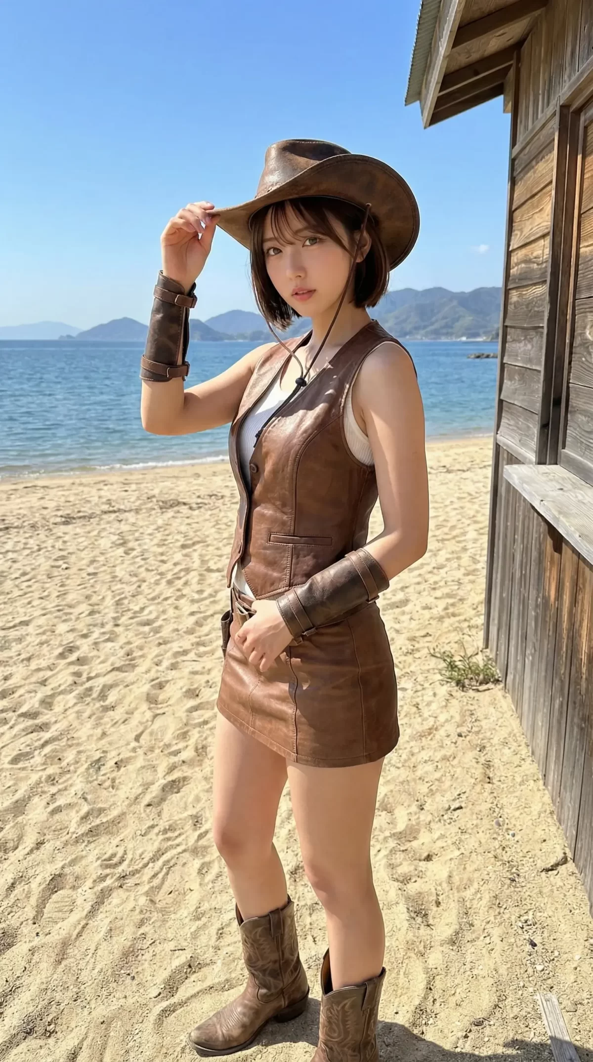 【AI美女】海辺で出会った小悪魔?レザーとミニスカのギャップ萌えが反則級に可愛い