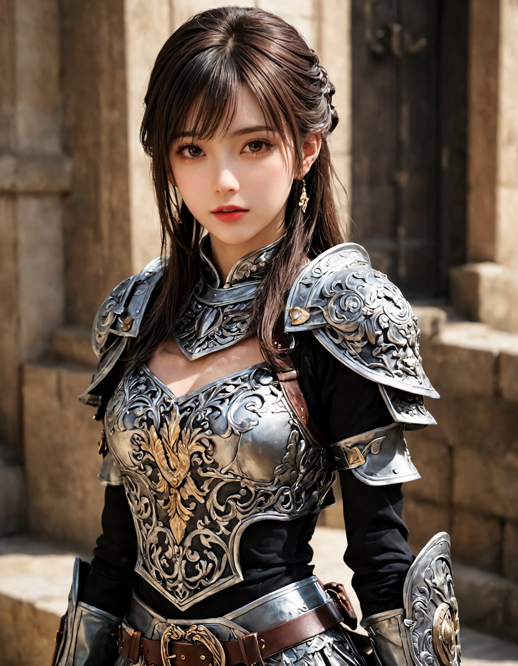 見てくれよ、この美しくも猛々しい鋼の鎧を。 緻密な装飾が施された鎧は、彼女の高貴さと強さの象徴だ。背負った巨大な剣や斧が、彼女がただのお飾りじゃないことを静かに物語っている。