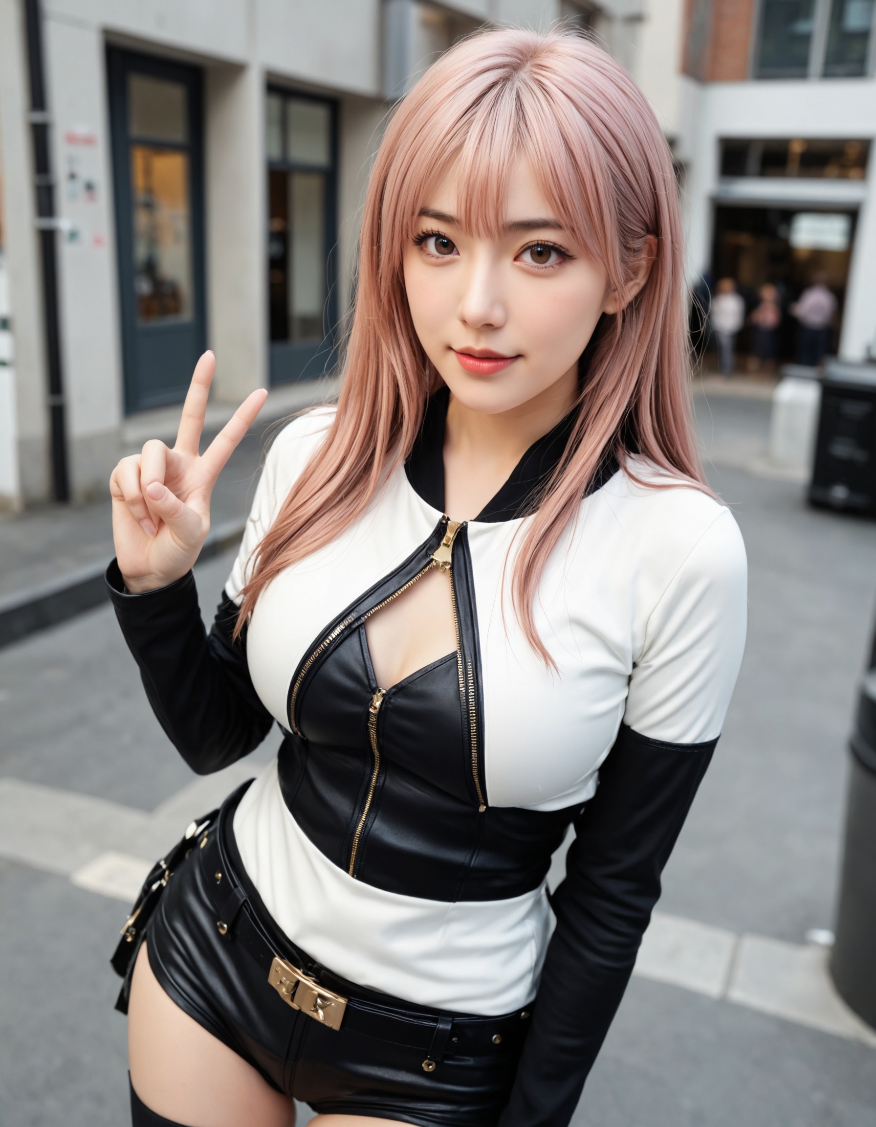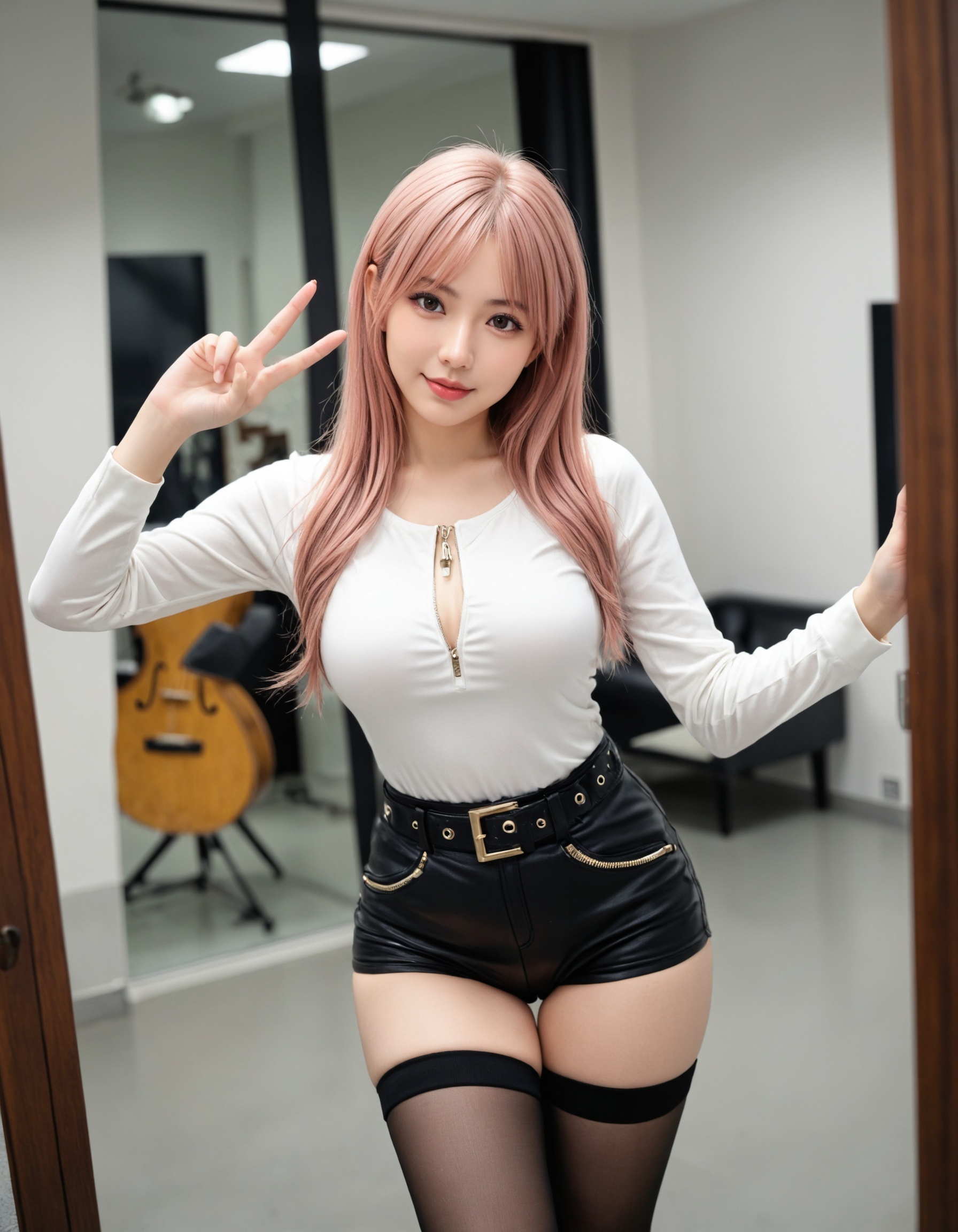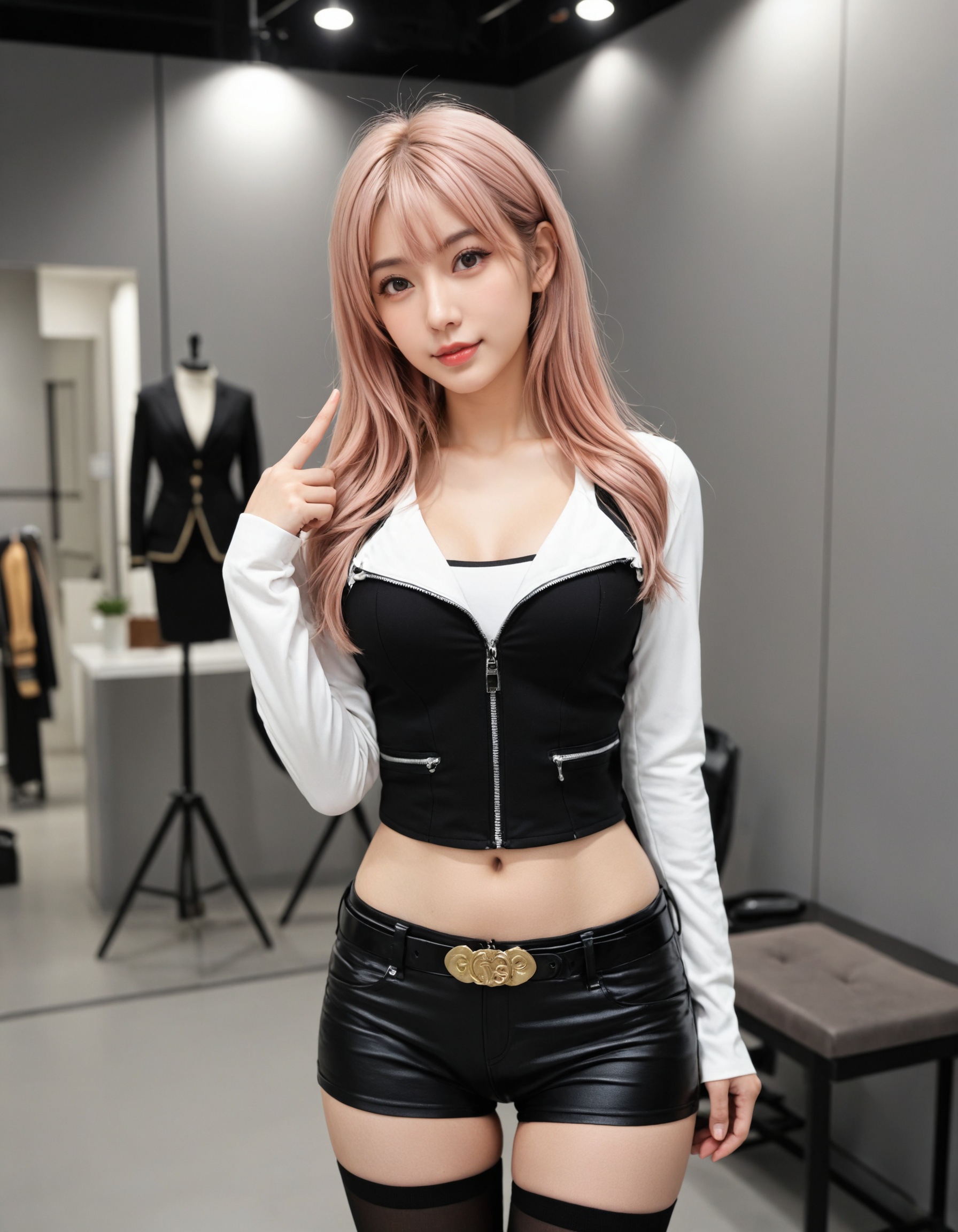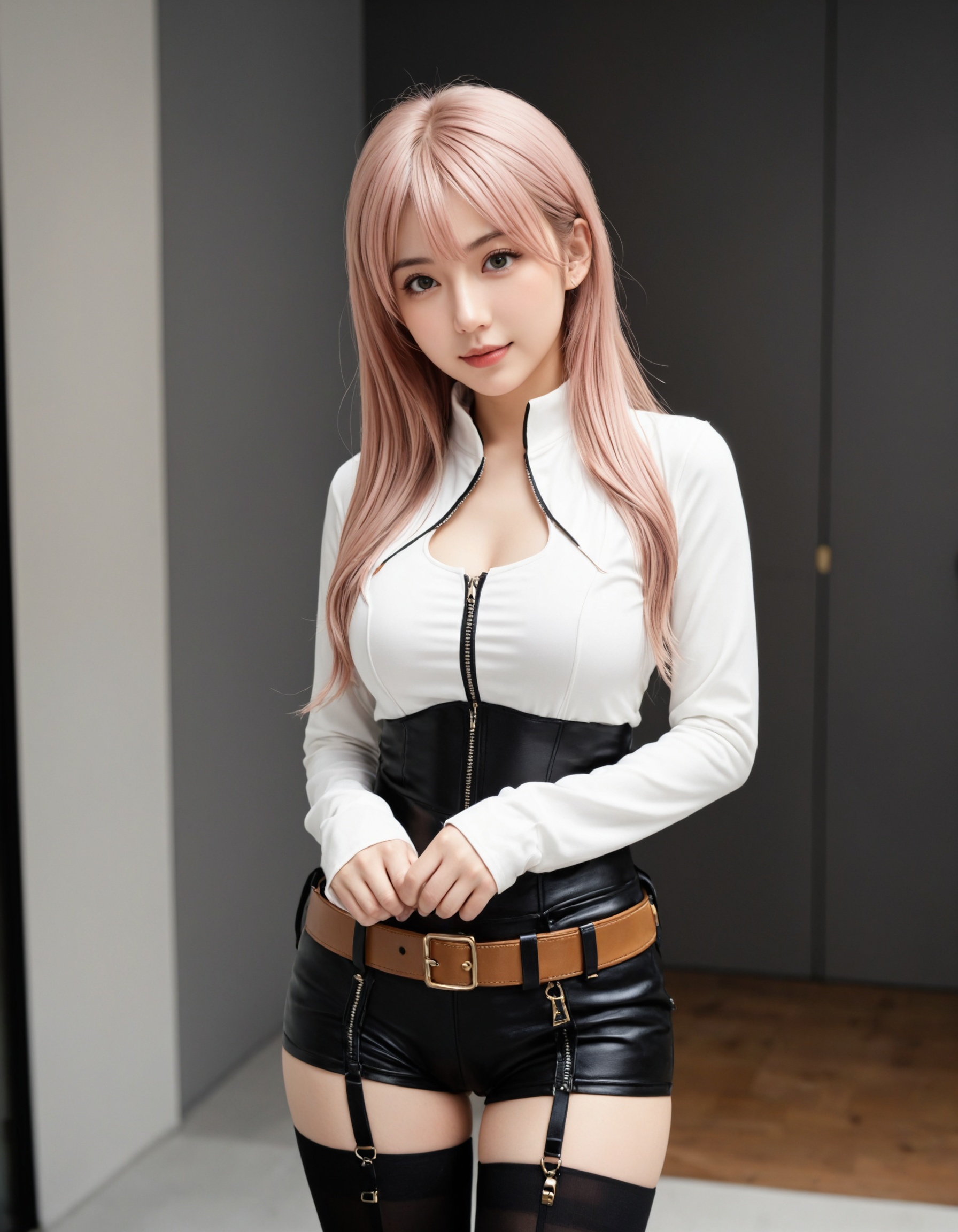そして何より、このファッションセンス! タイトな革パンに、ボディラインが際立つトップス。黒と白を基調にしたコーデが、ピンクの髪を最高に引き立ててるんだよな。ベルトやサイハイソックスの小物使いも完璧で、マジでカリスマモデルかK-POPアイドルにしか見えん…。