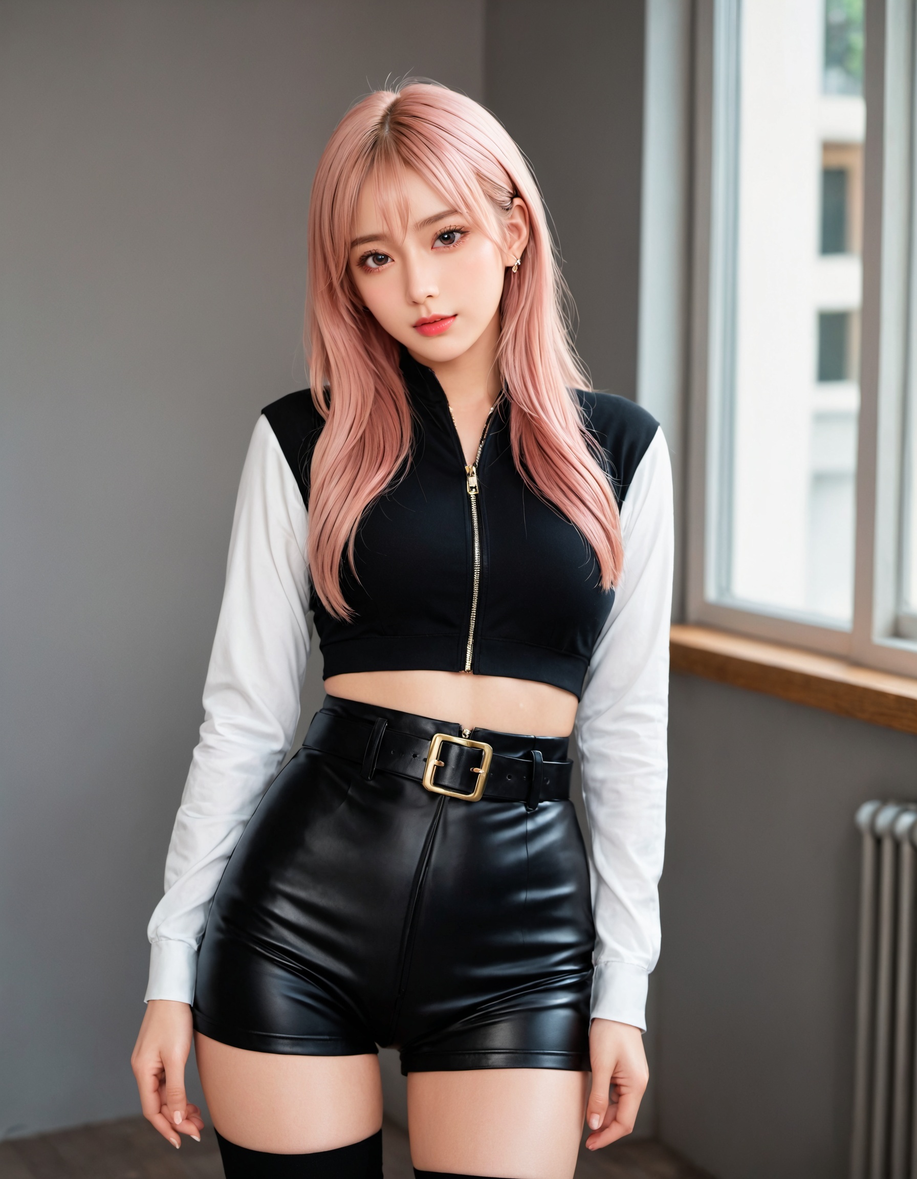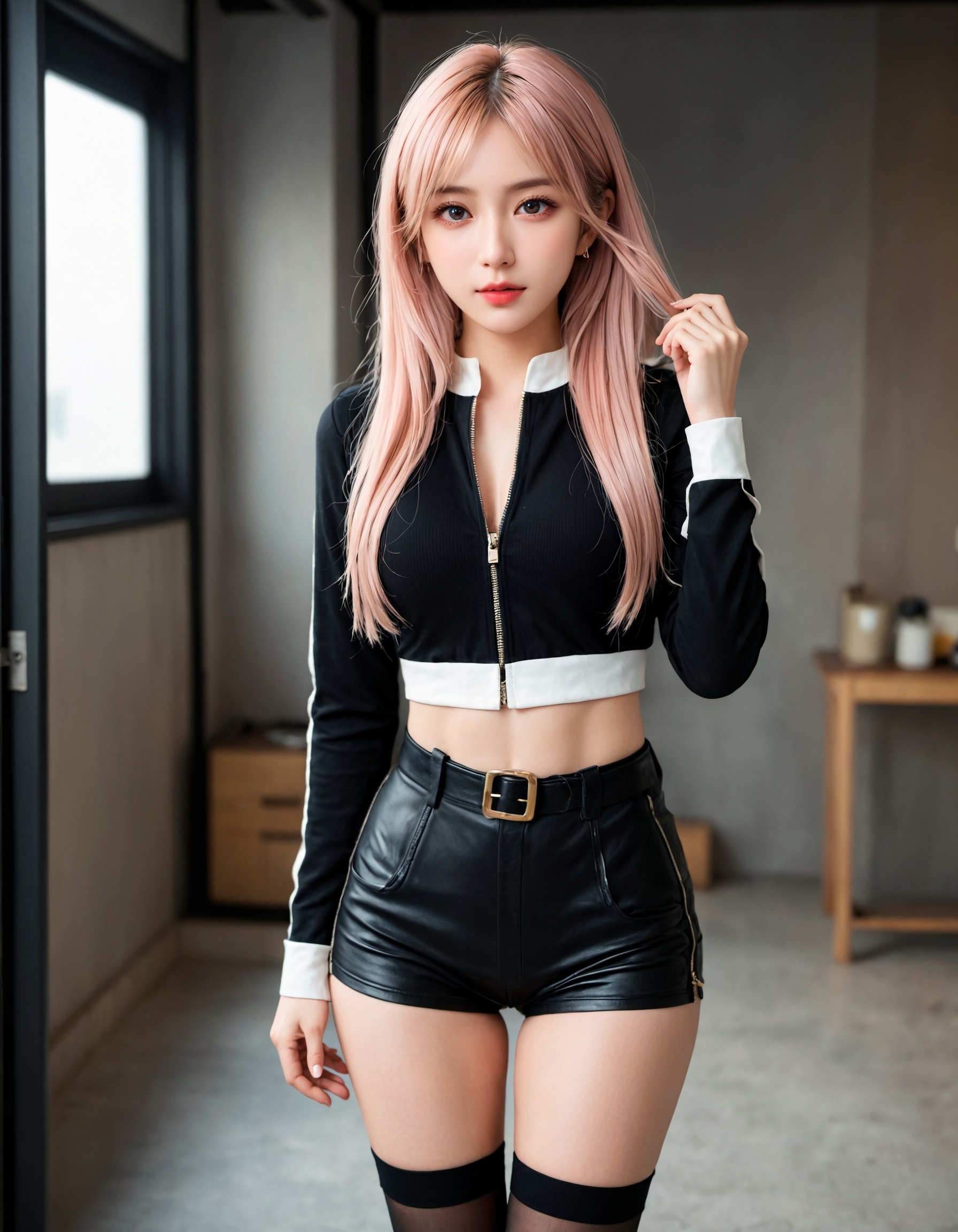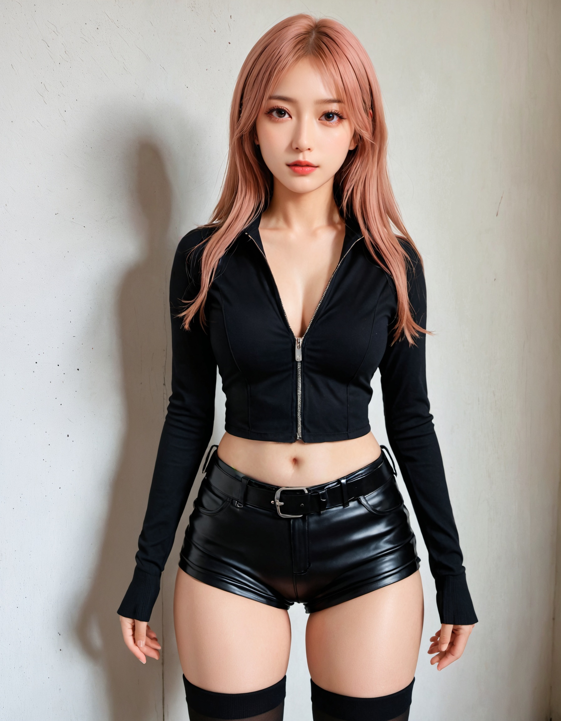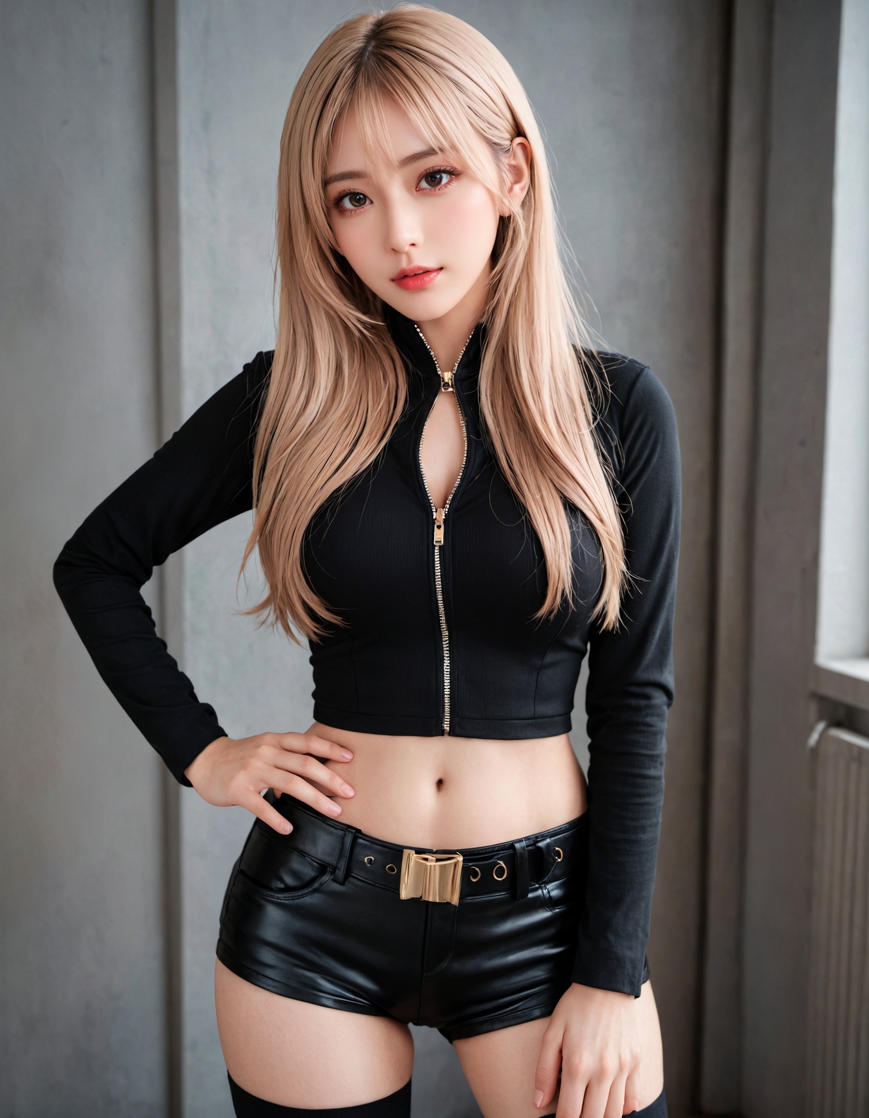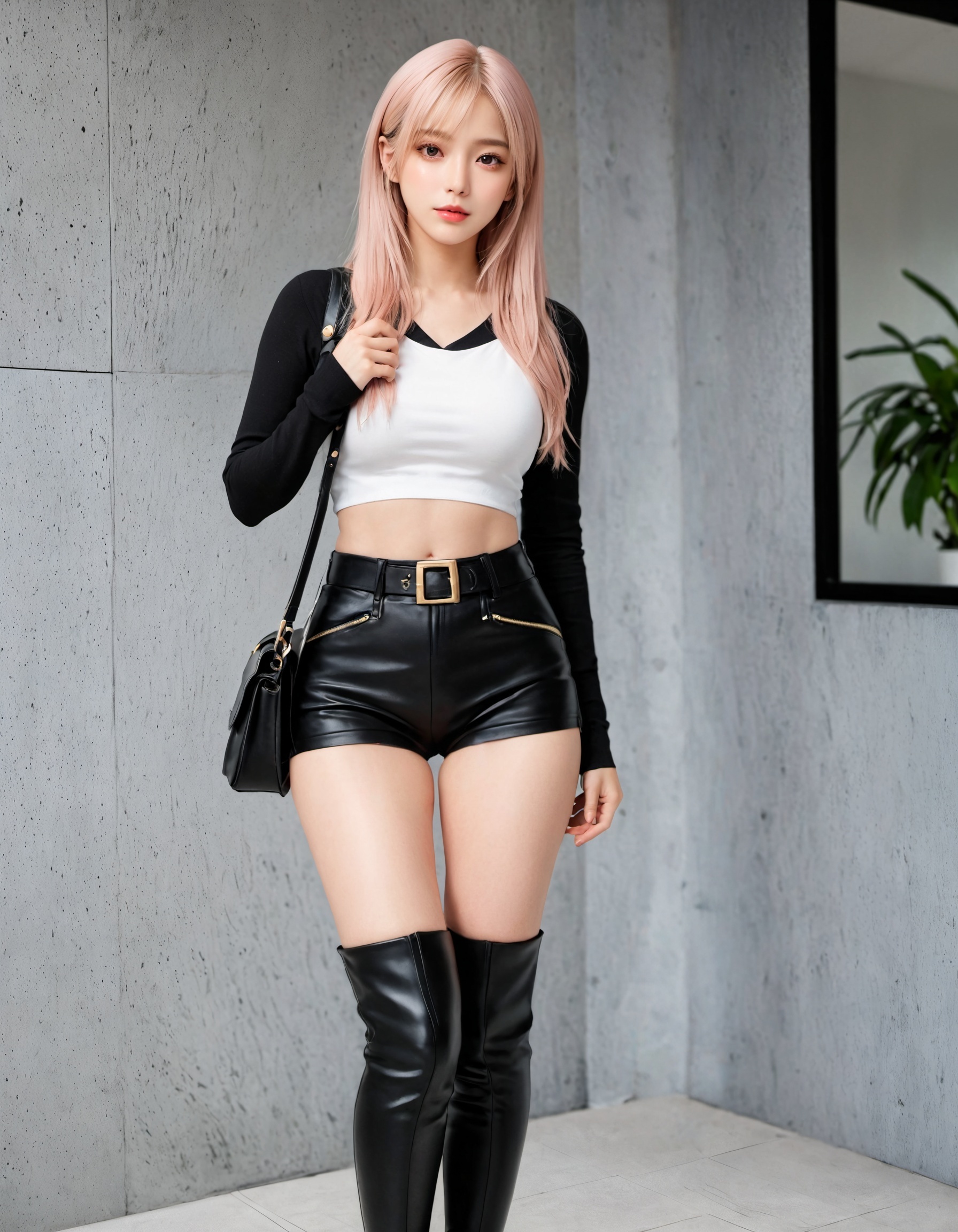 今回は黒を基調としたコーデで、前回よりもさらにクールで大人な魅力がマシマシになってないか? 革パン&サイハイの最強コンボはそのままに、トップスを黒に変えるだけで、ここまで雰囲気が変わるとは…!
