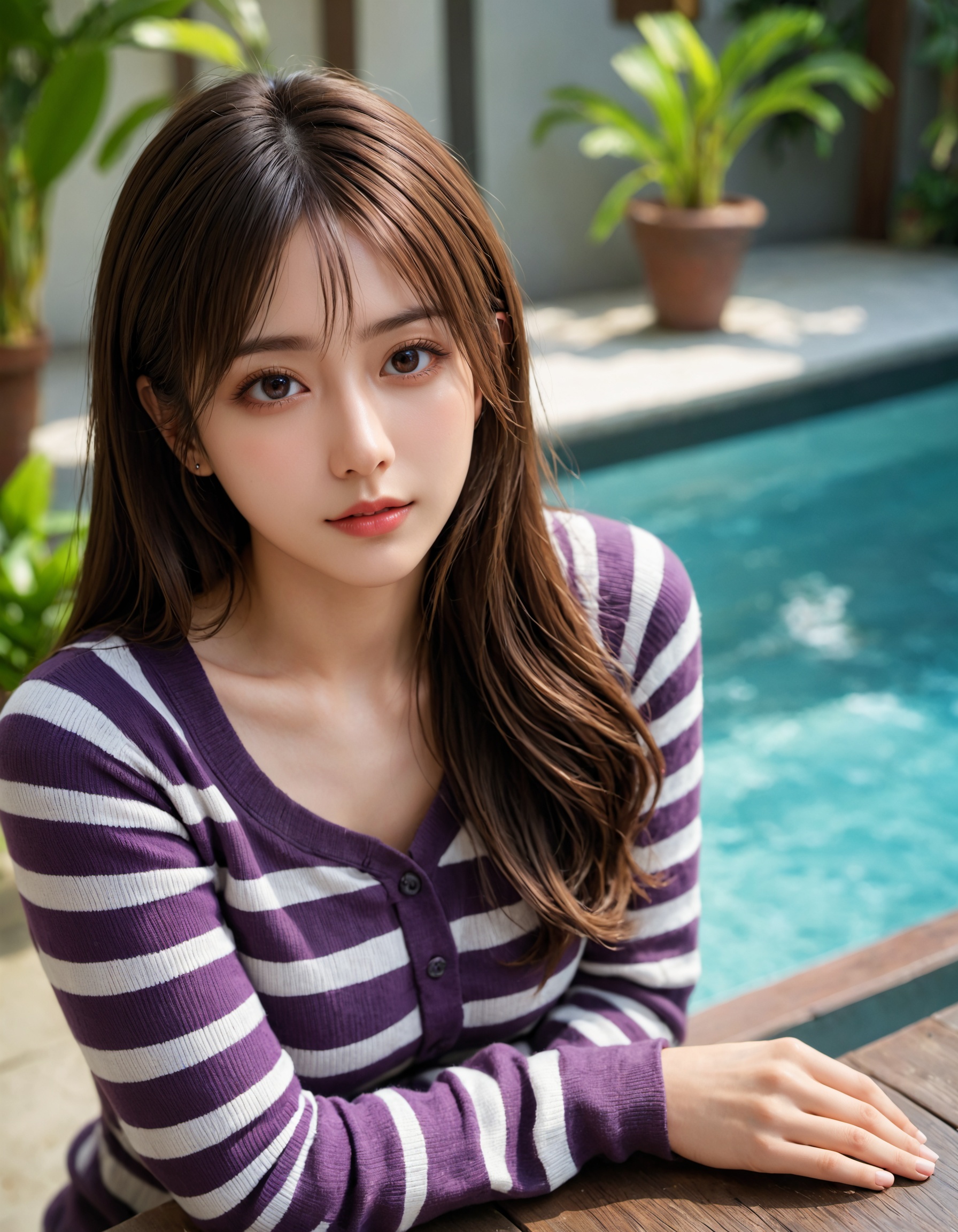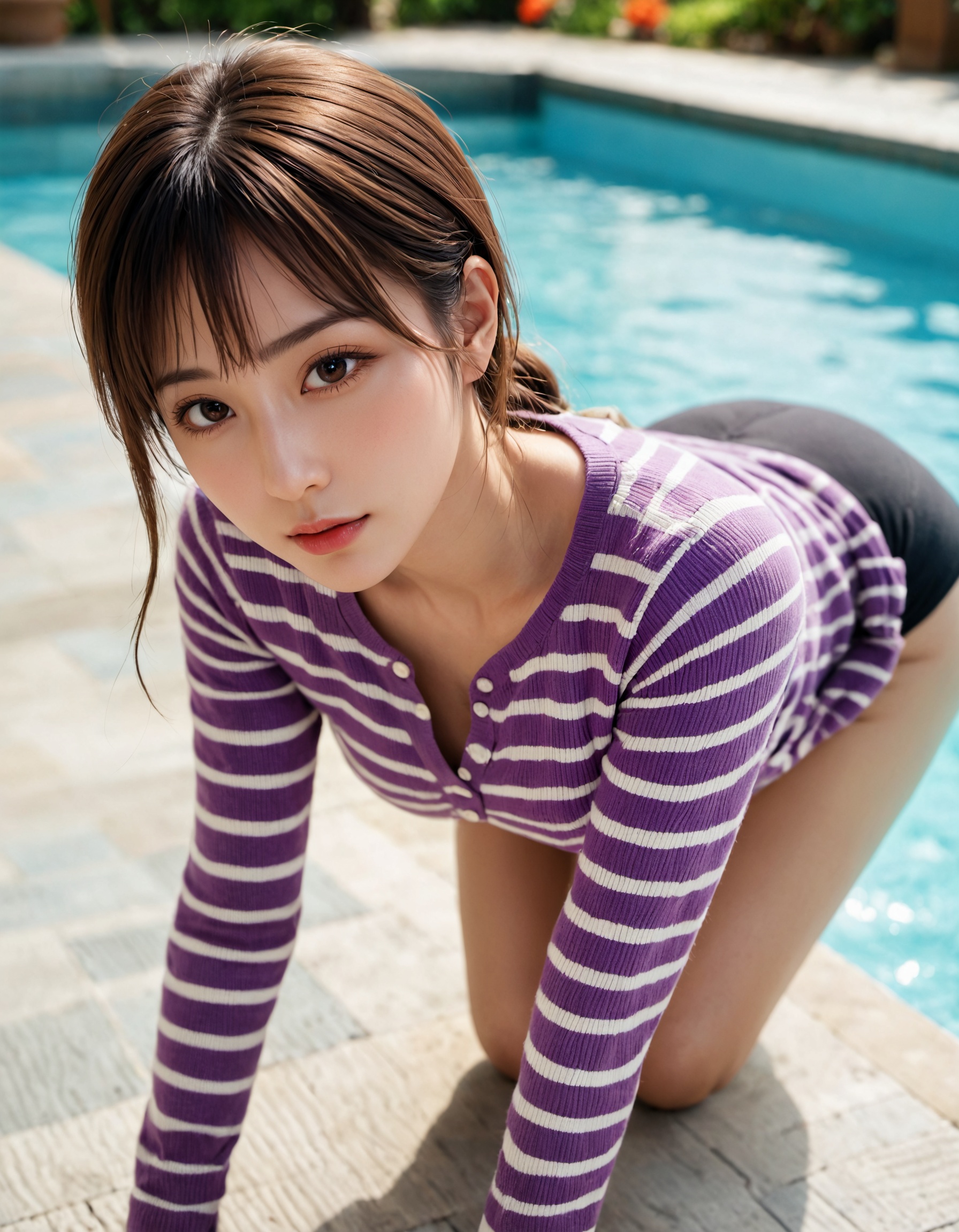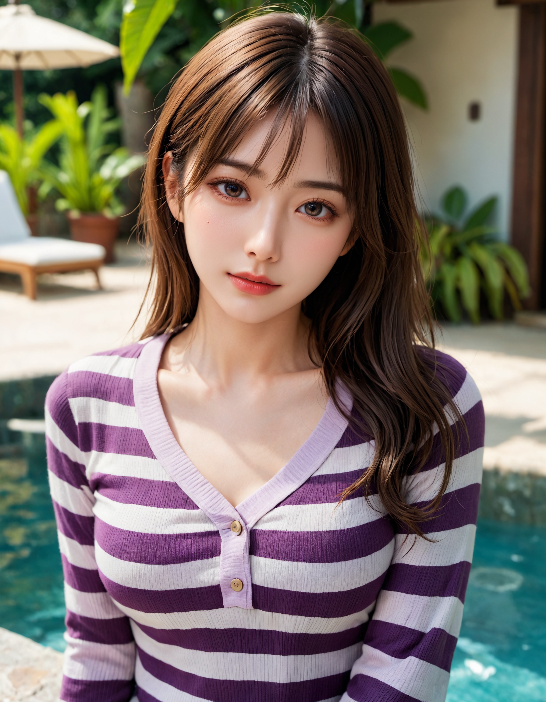 シンプルな紫のボーダーシャツが、逆に彼女の素の魅力を引き出してるよな。 しまいには服のままプールに入っちゃう、お茶目な一面まで見せてくれるとか…もうサービスの精神が旺盛すぎる!