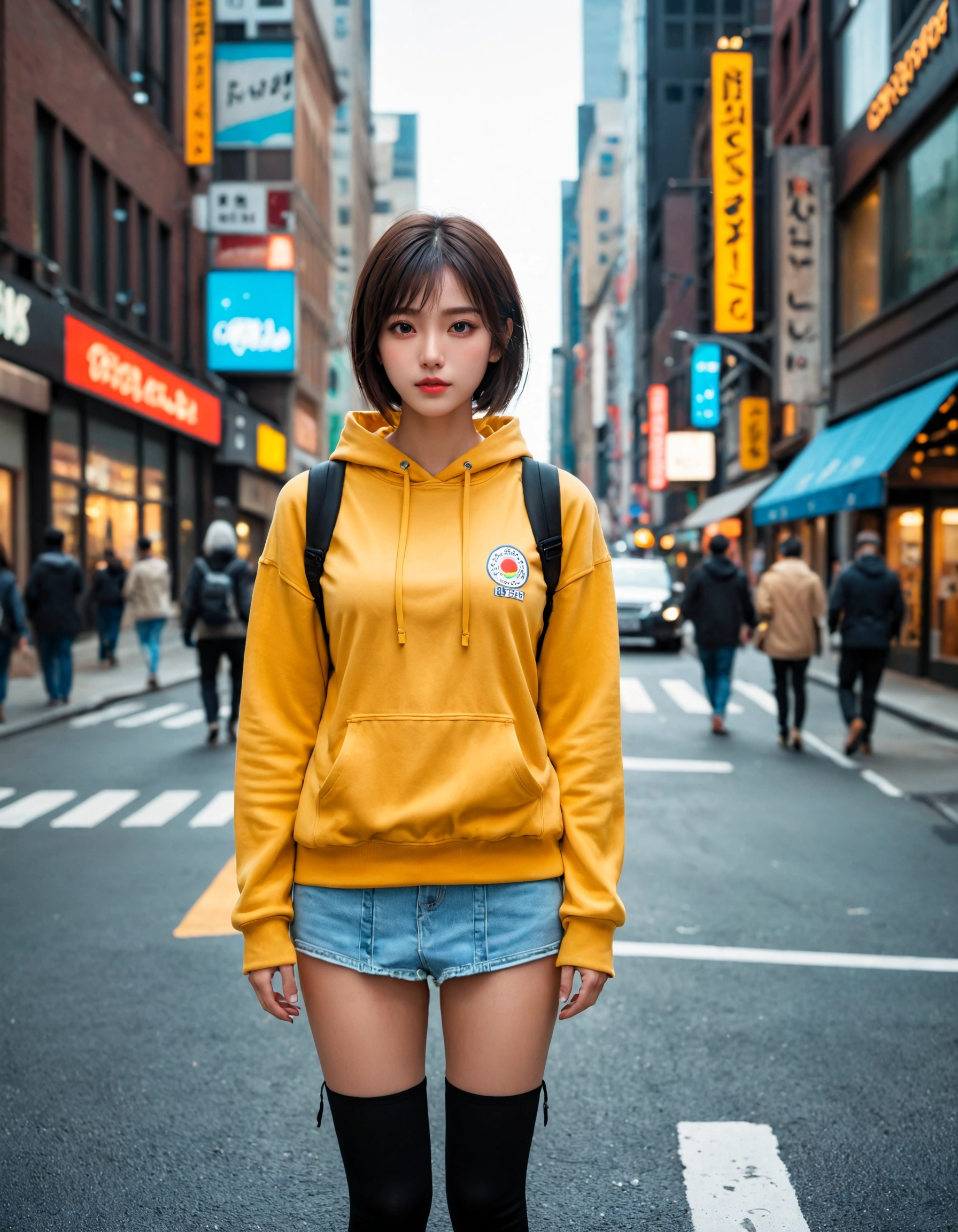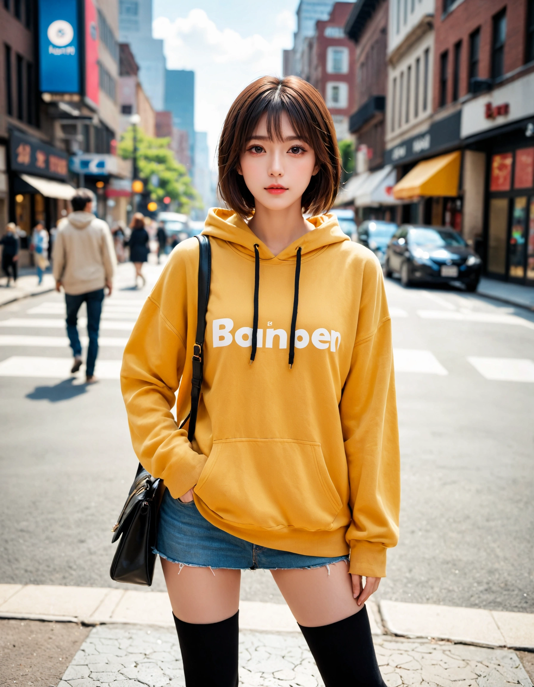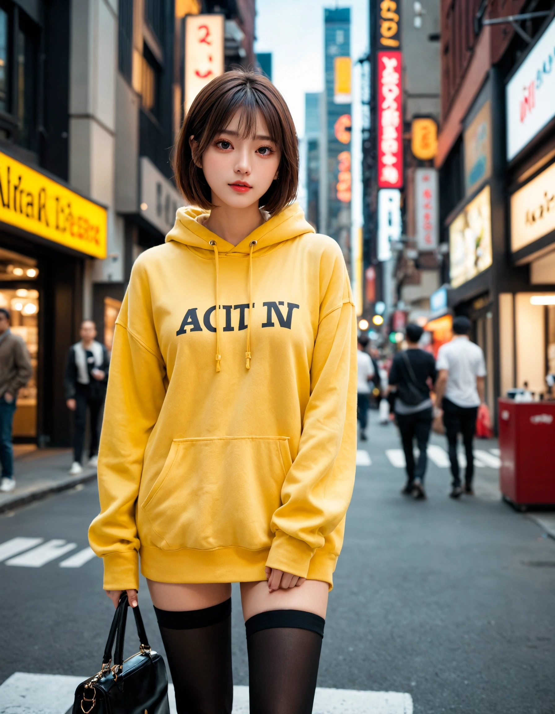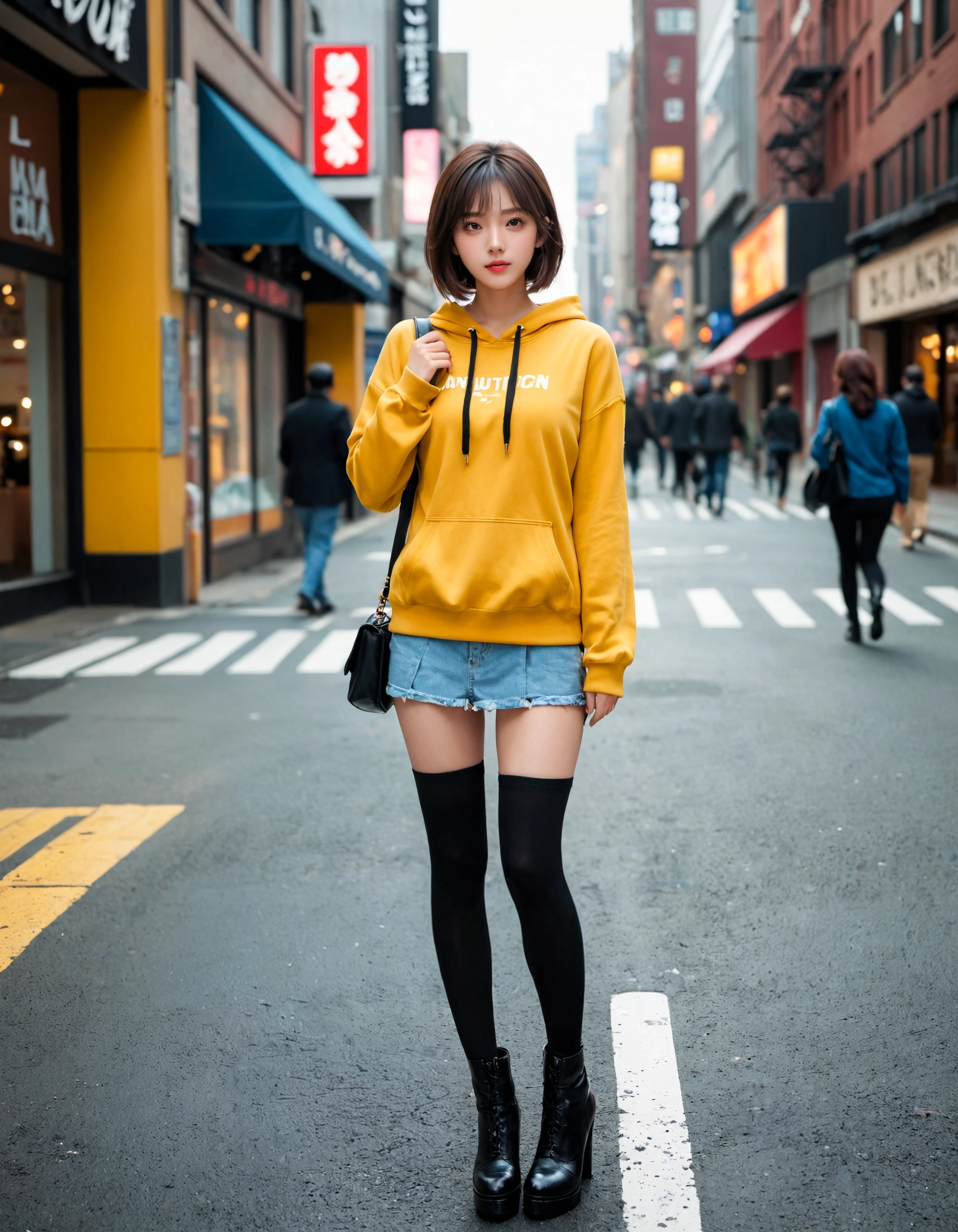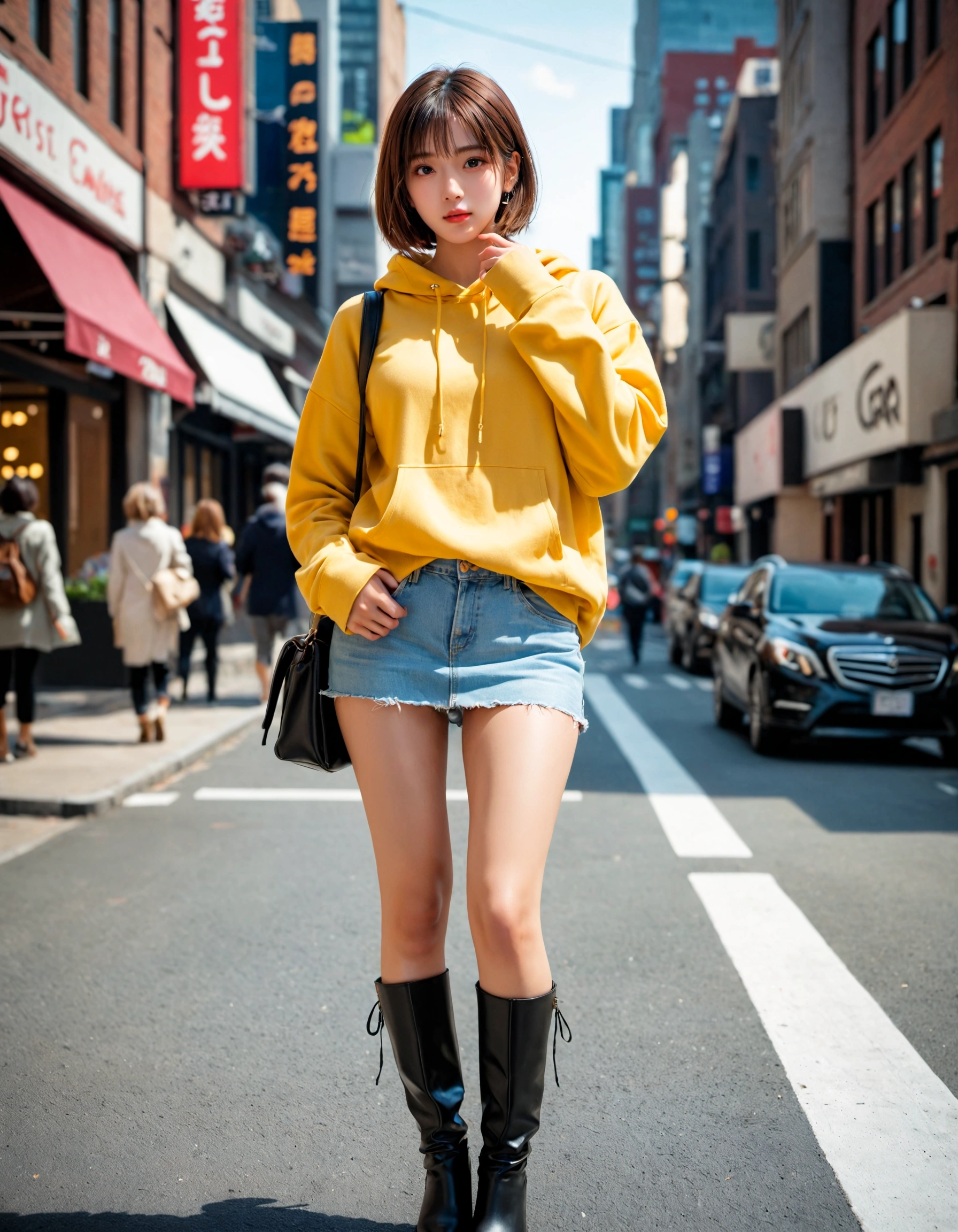 そして何より、このファッション! 鮮やかな黄色のオーバーサイズのパーカーが、まず目に飛び込んでくるよな。元気なカラーが最高に似合ってる!
