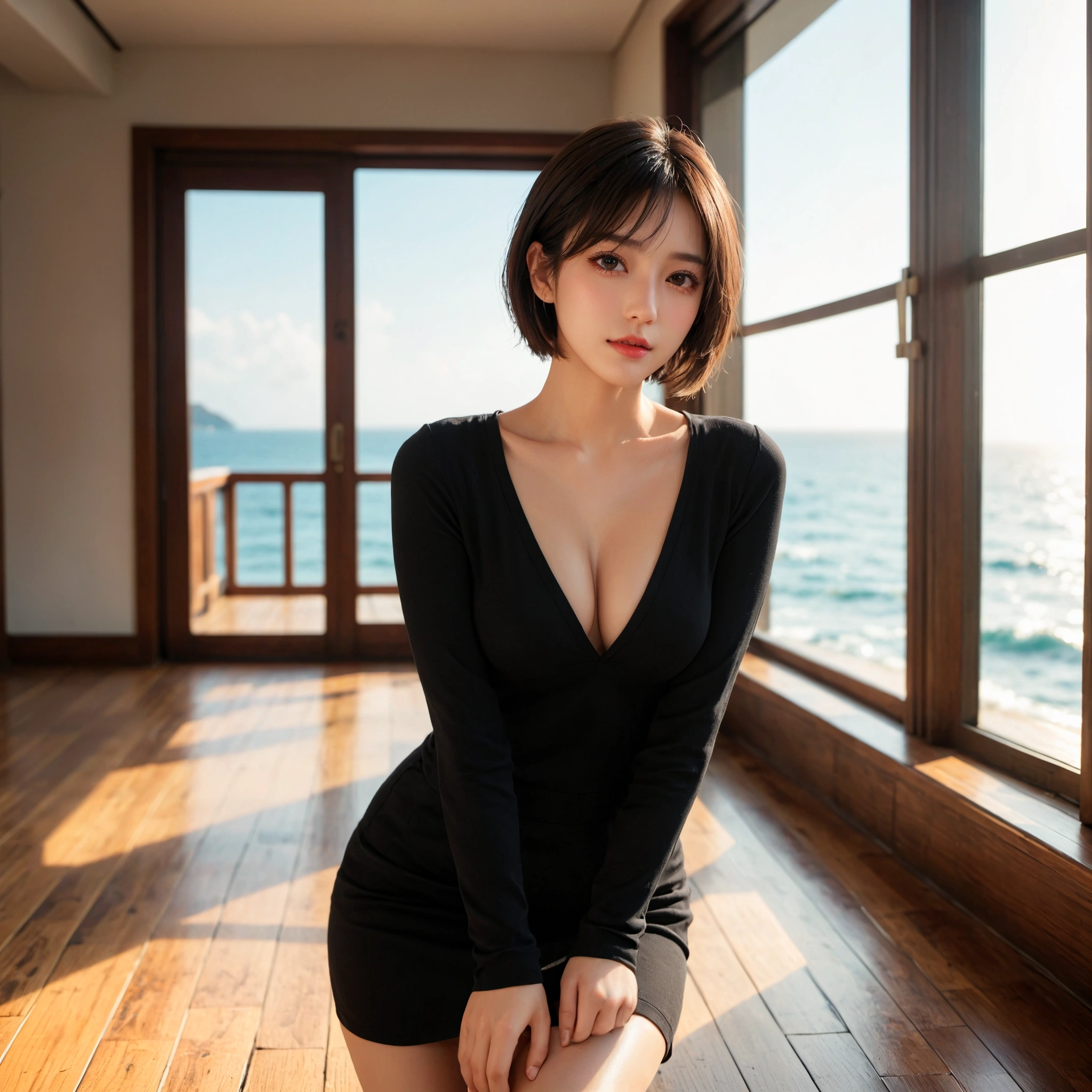 見てくれ…! 体にぴったりフィットした、シンプルな黒いミニドレス。大胆に開いた胸元から覗く、柔らかな曲線美。 これはもう「可愛い」じゃない。「美しく、色気に満ちた大人の女性」だ。