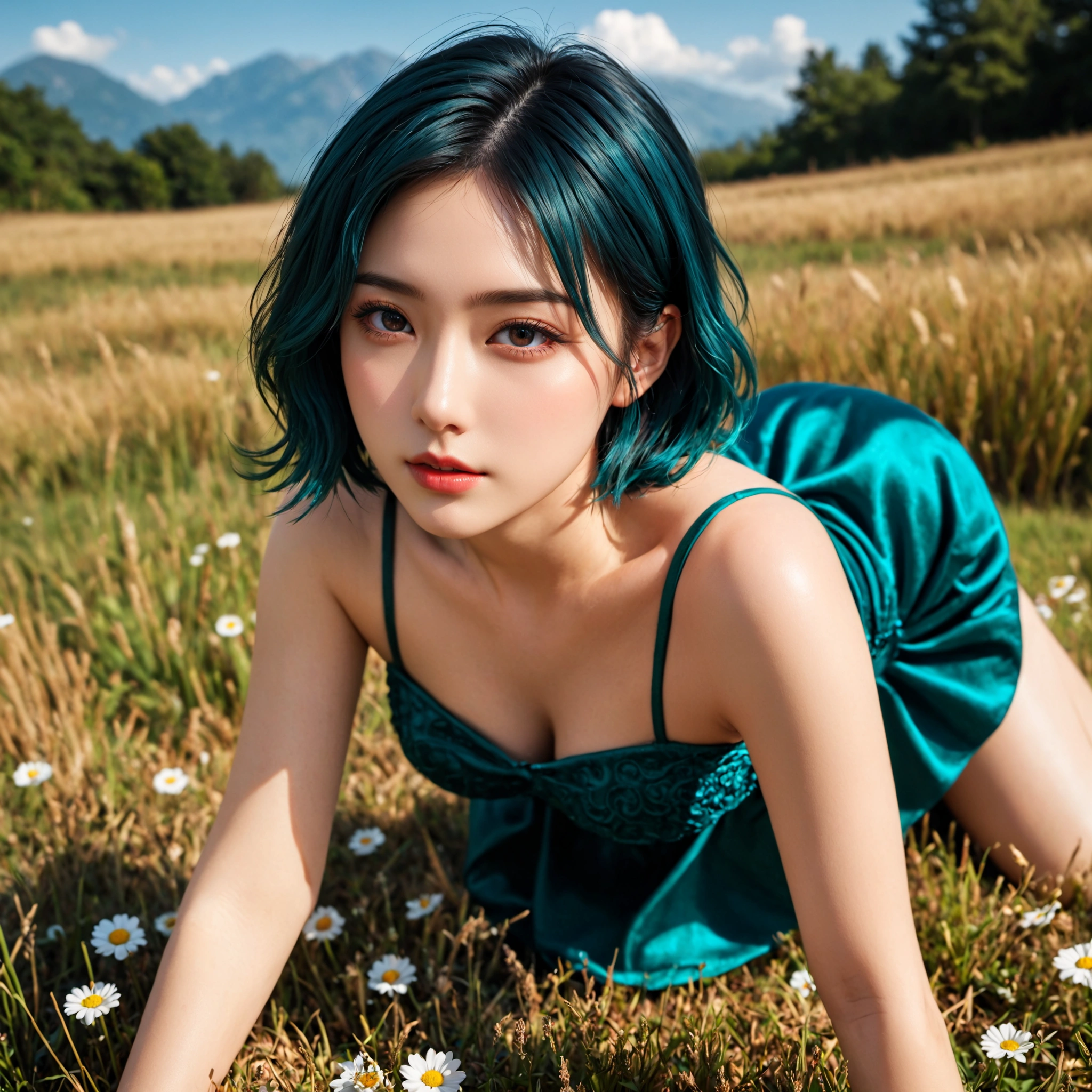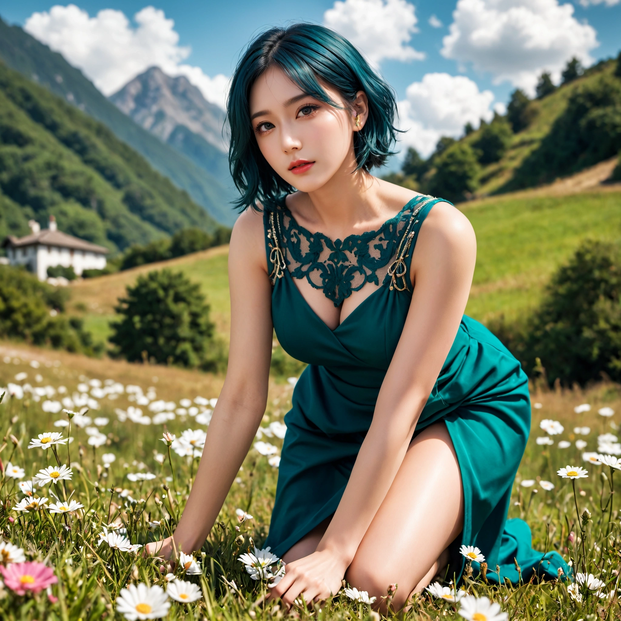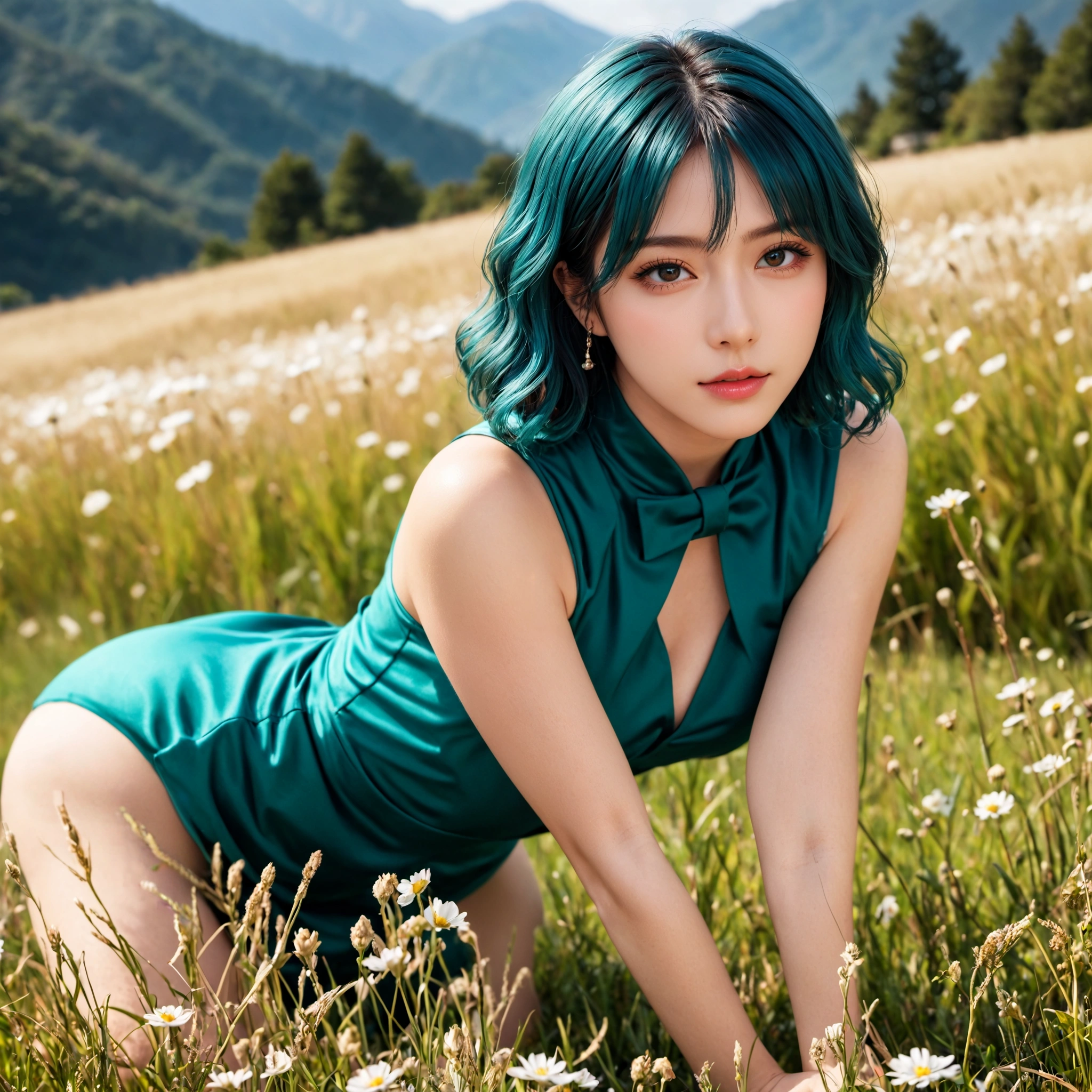 見てくれよ、この神秘的な美女を! 舞台は、どこまでも続くかのような草原や、白い花が咲き乱れる野原だ。 そして、そこにいるのは、人間離れした美しさを持つ、青緑の髪の彼女…。