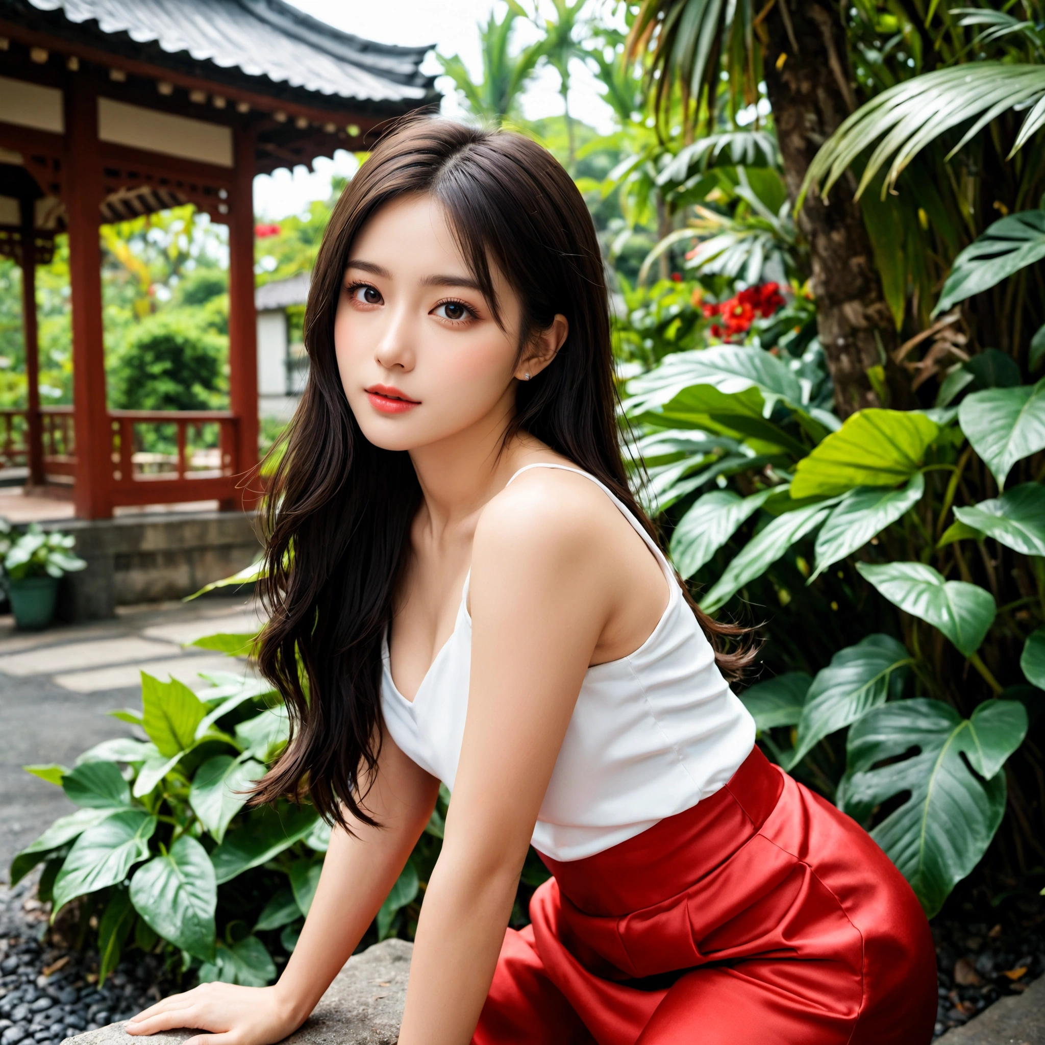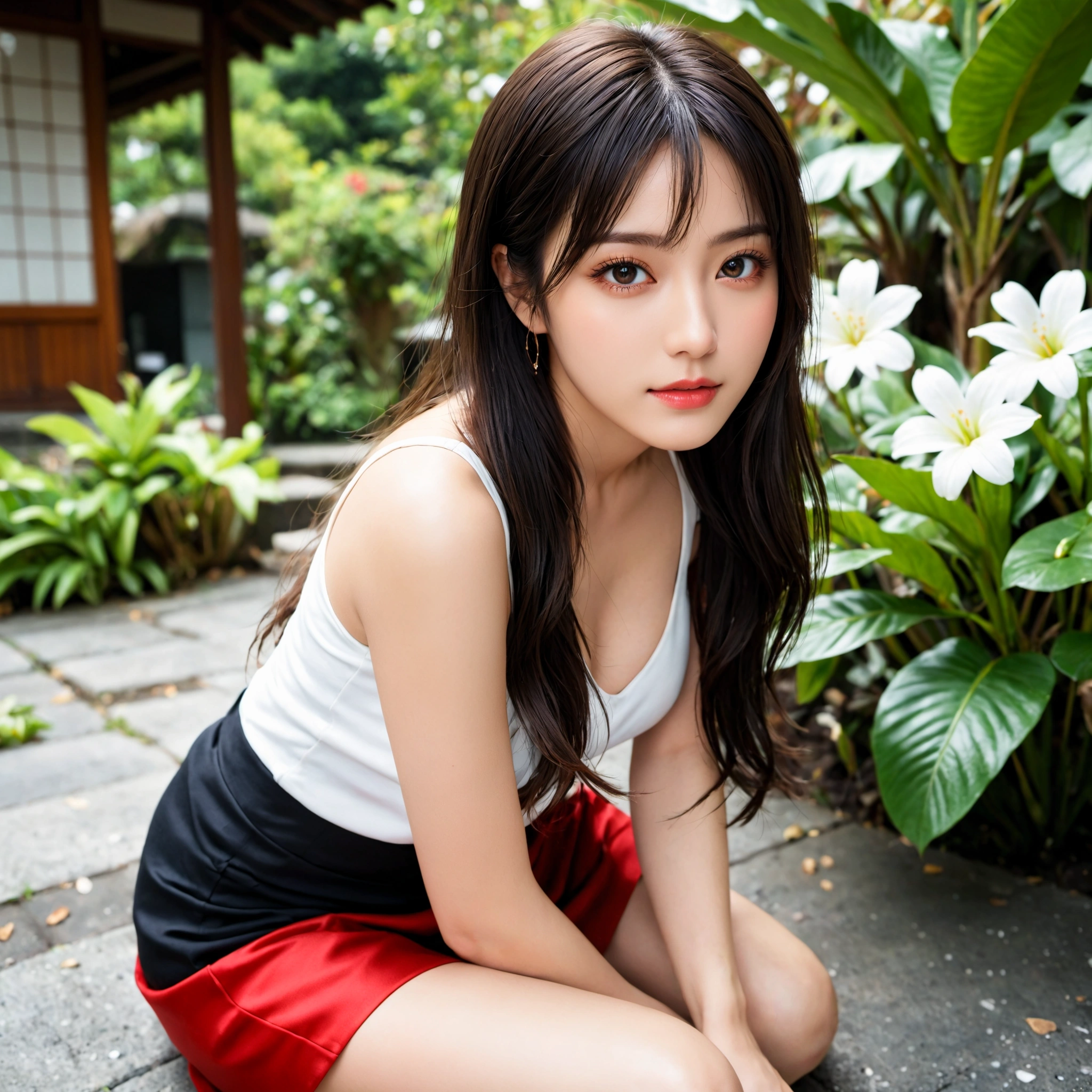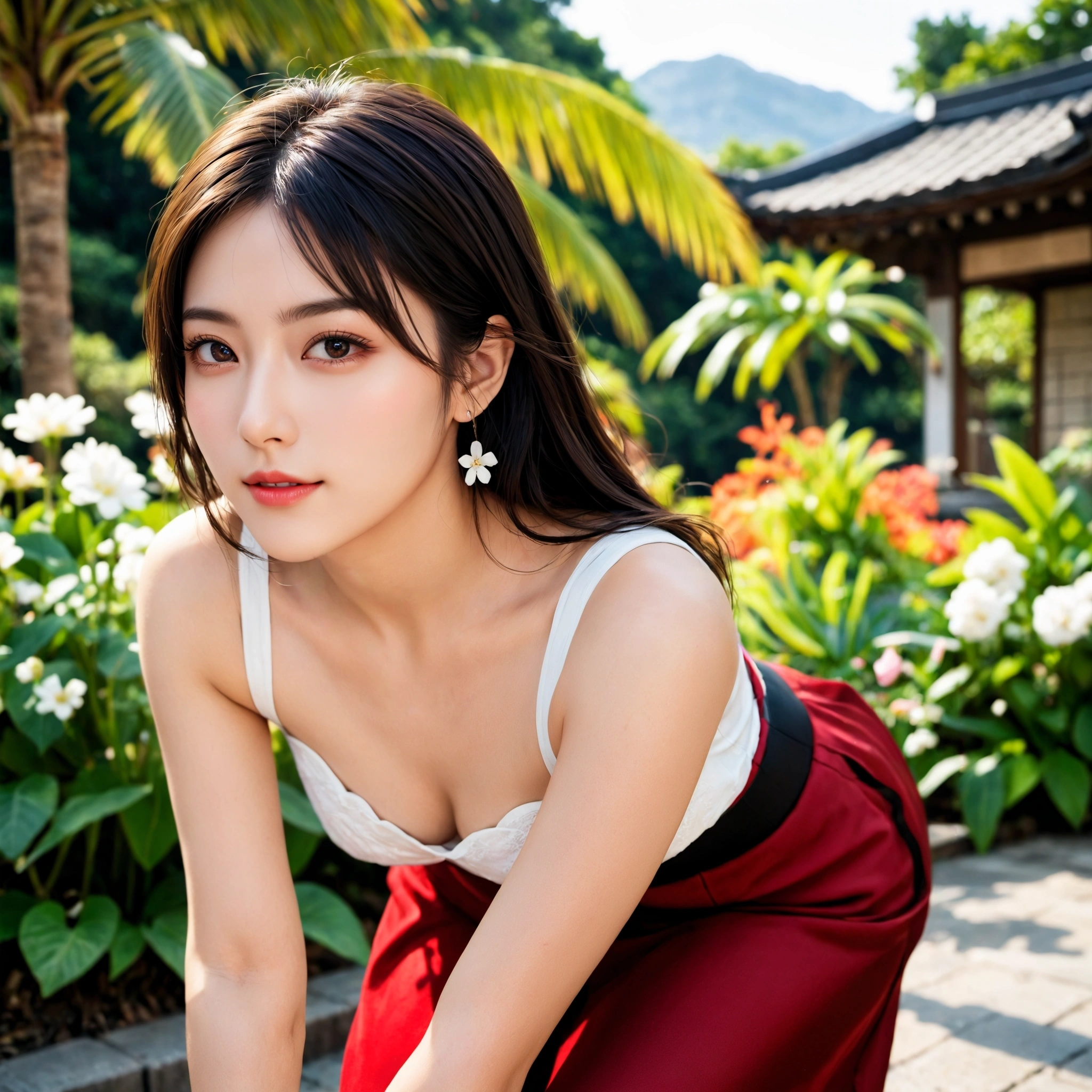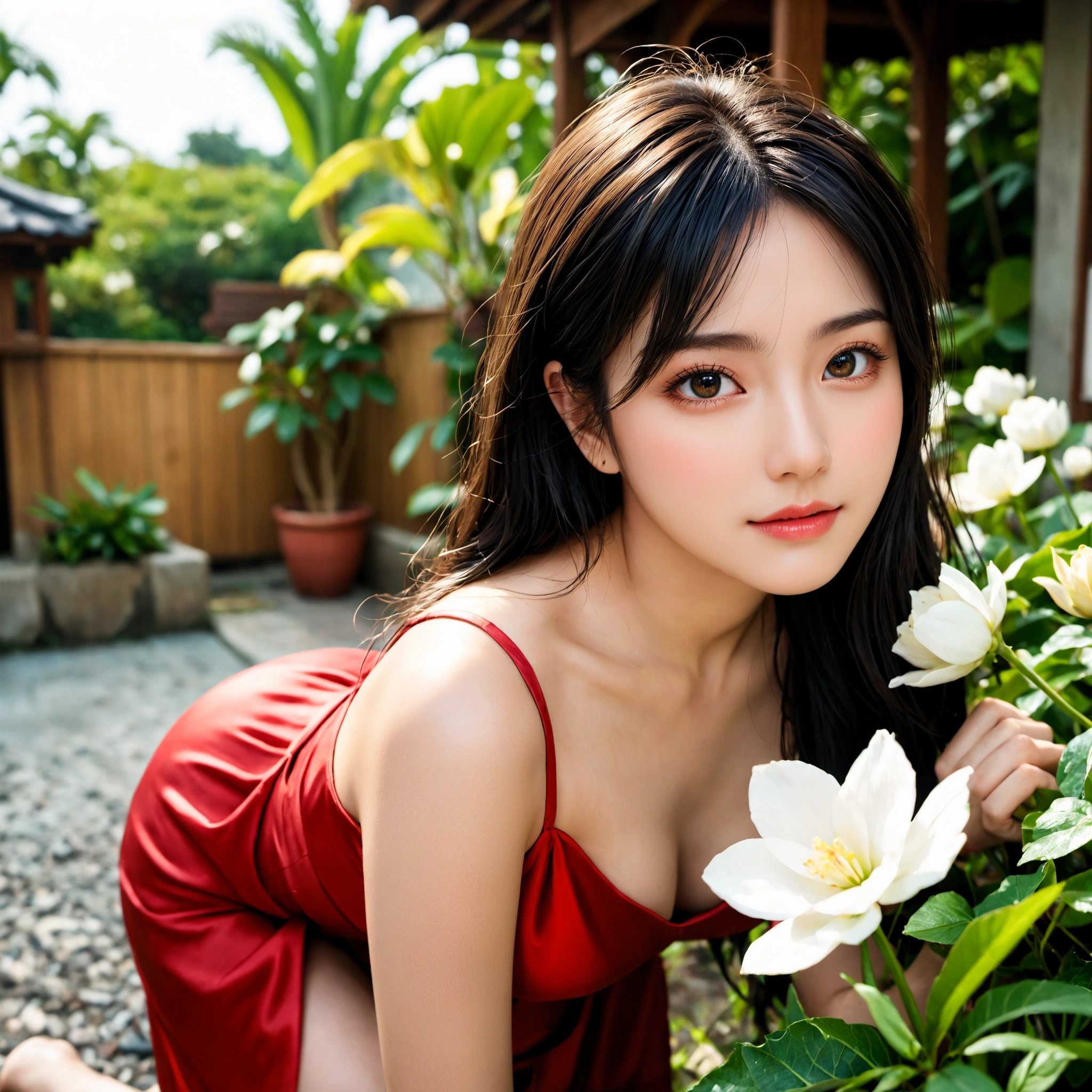 ラフなキャミソール姿も、艶やかなリゾートドレス姿も、どっちも最高に似合ってるよな。 花々の前で屈んで、こっちをじっと見つめる姿なんて、もうドキッとするなって方が無理だろ…。 彼女の優しい眼差しを見てると、日々のストレスなんて全部どうでもよくなって、心が浄化されていくようだぜ。