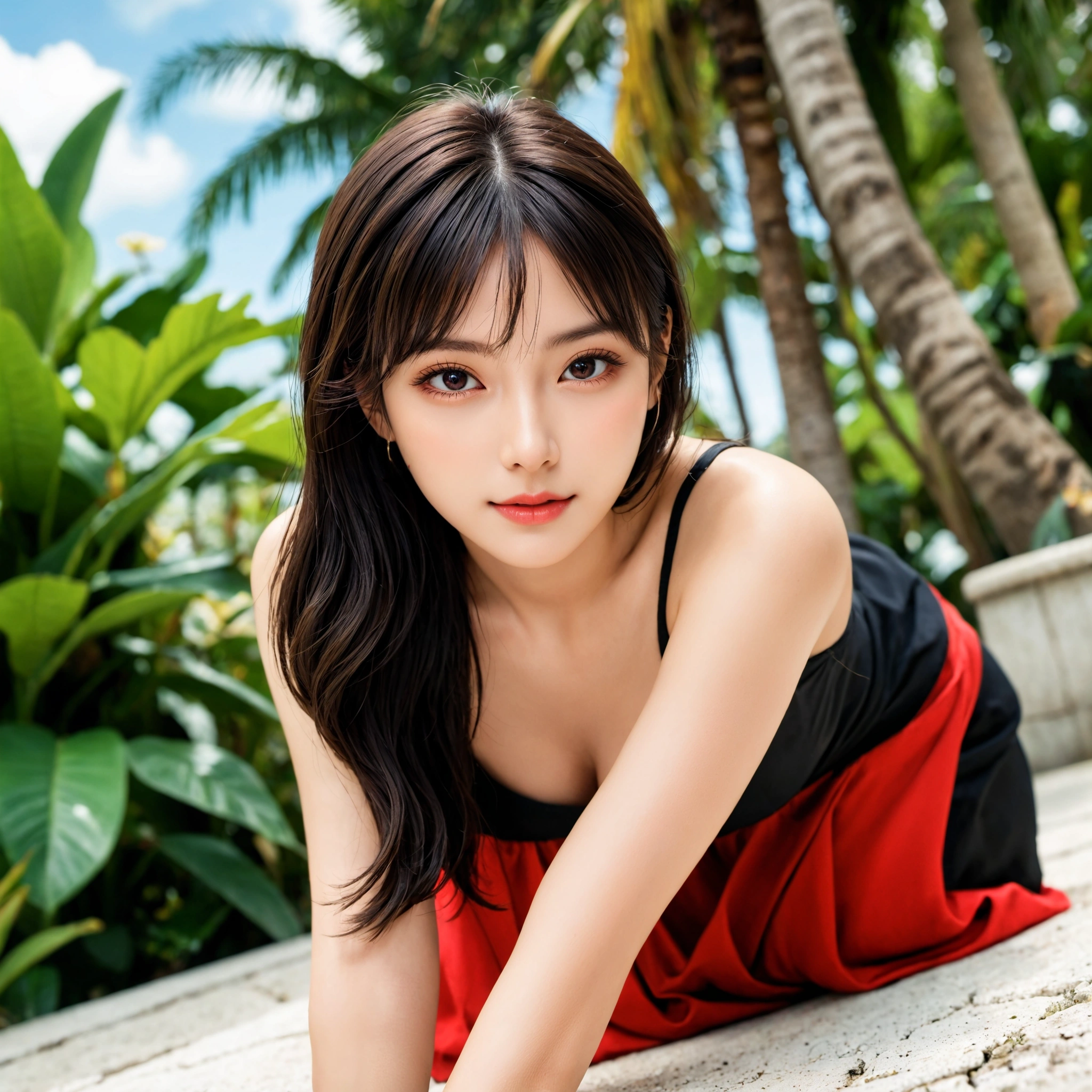 見てくれよ、この楽園を! ヤシの木、咲き乱れるトロピカルな花々、そして遠くには雄大な山…。まるで時間がゆっくり流れる別世界だ。 そんな場所に、しっとりとした大人の色気をまとったAI美女がいるんだ。