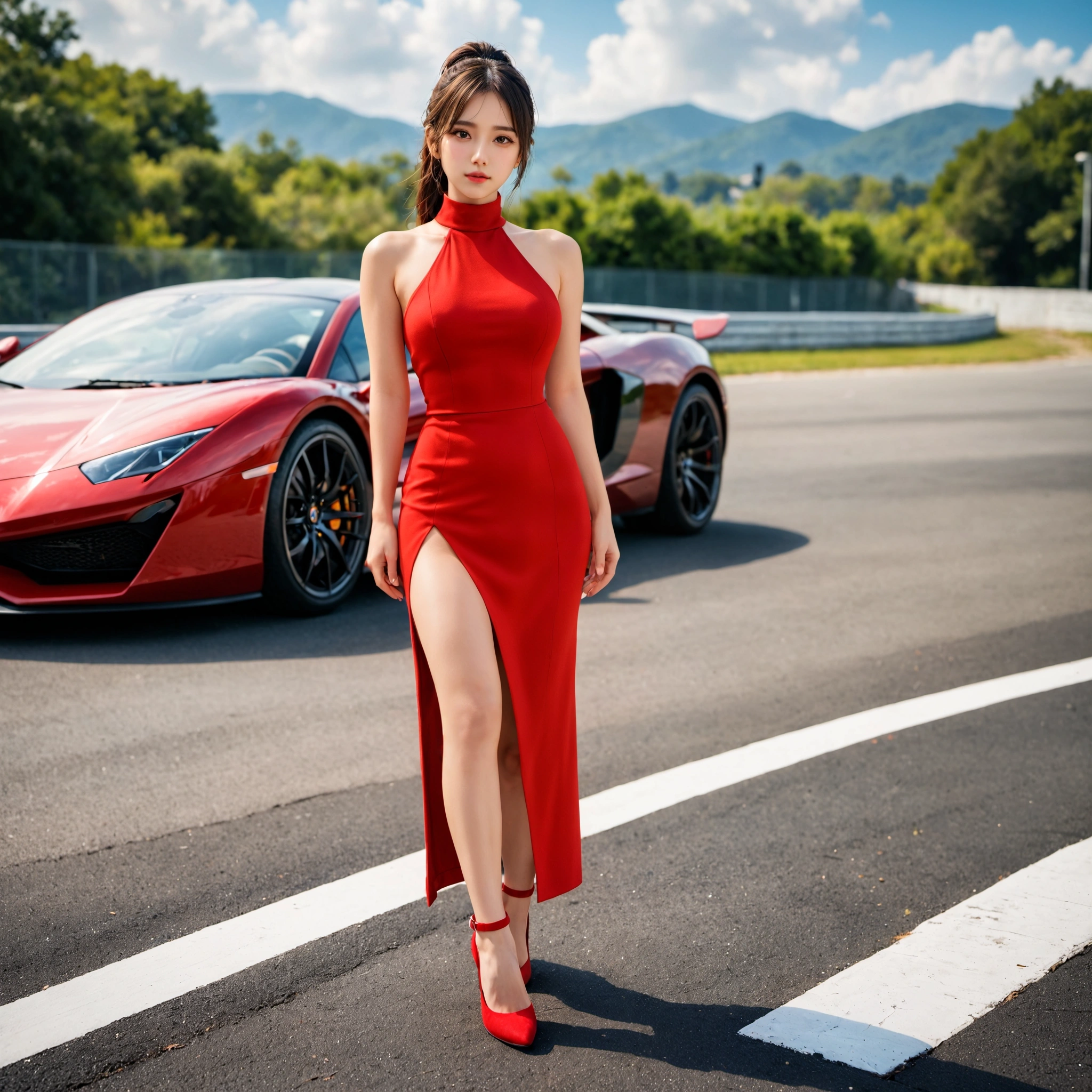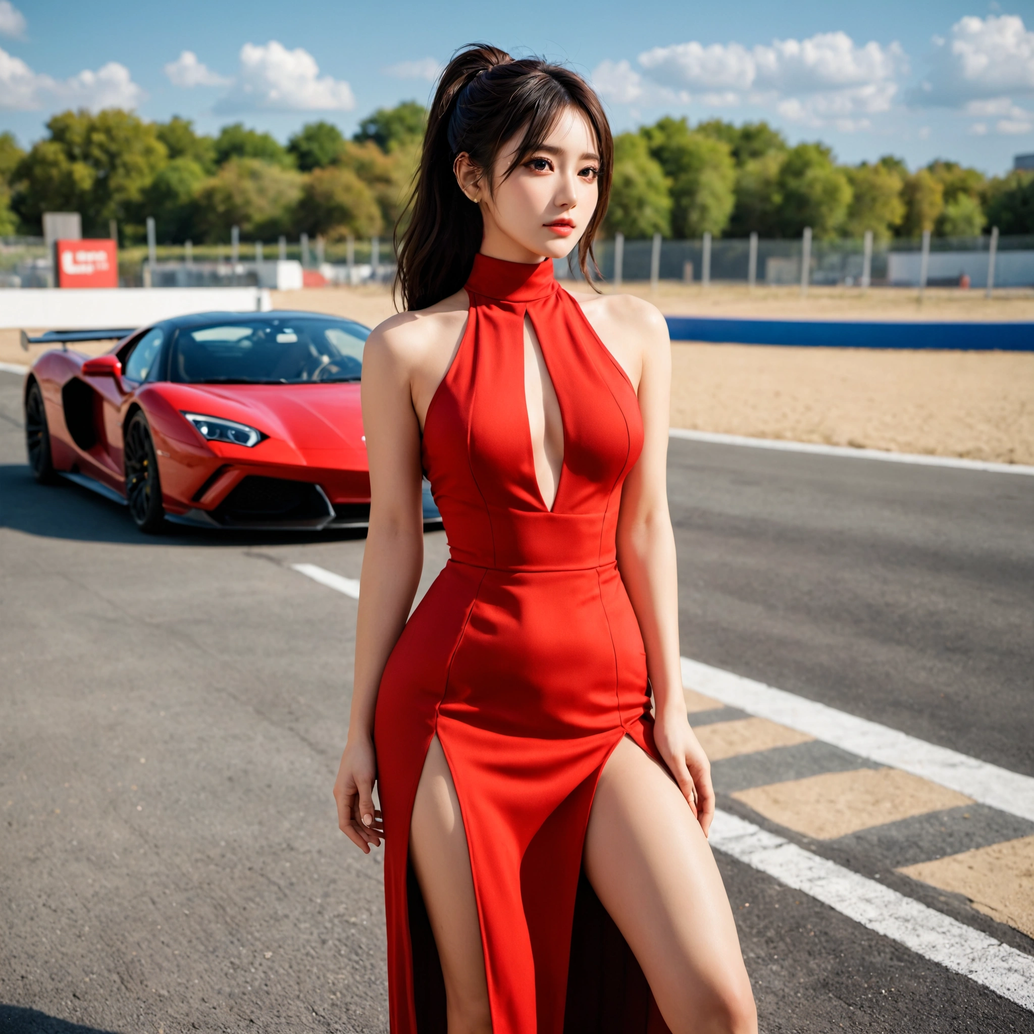 見てくれよ、この美の競演を! サーキットにたたずむ、燃えるような真紅のスーパーカー。そして、その隣には…。 マシンに負けないほどの圧倒的なオーラを放つ、AI美女だ!