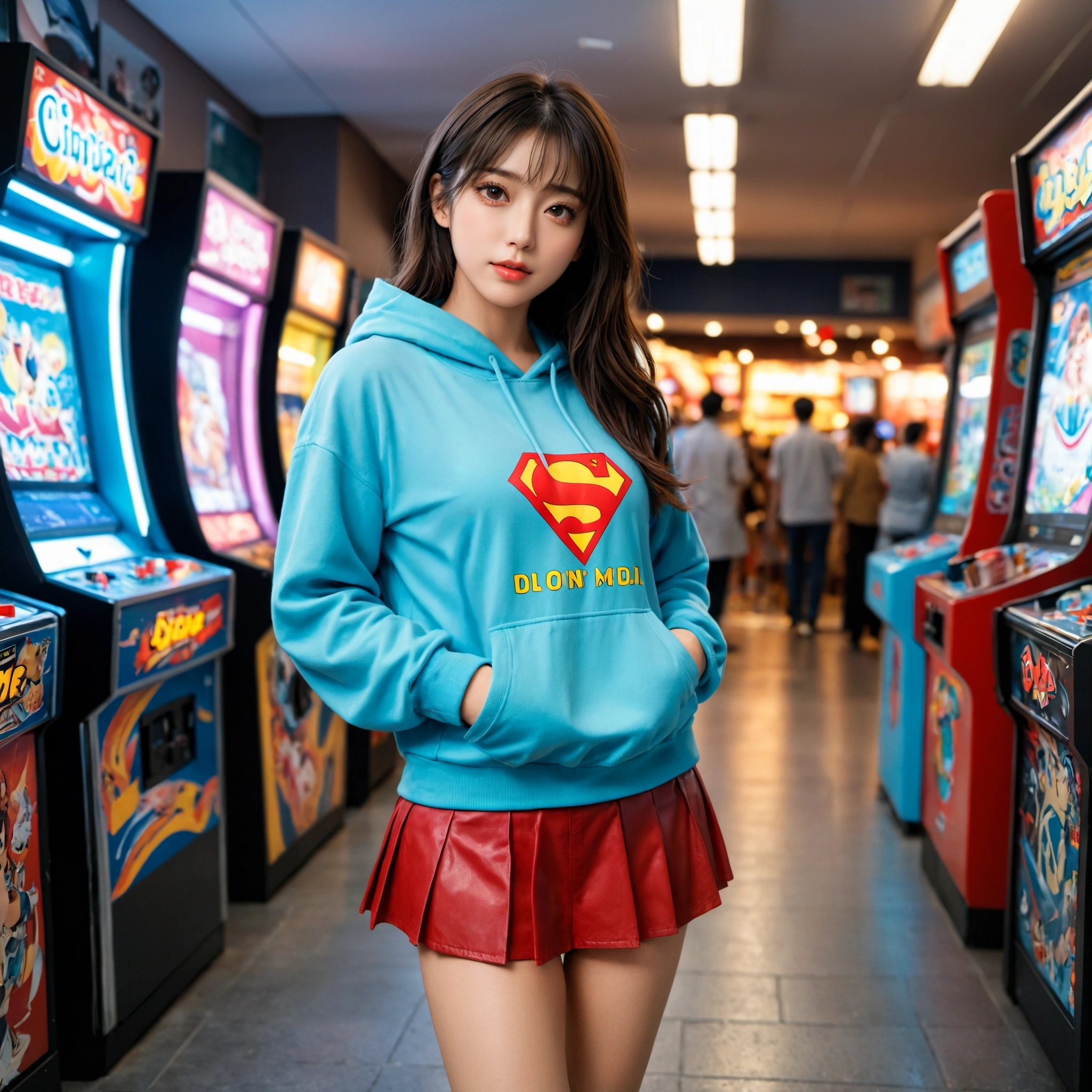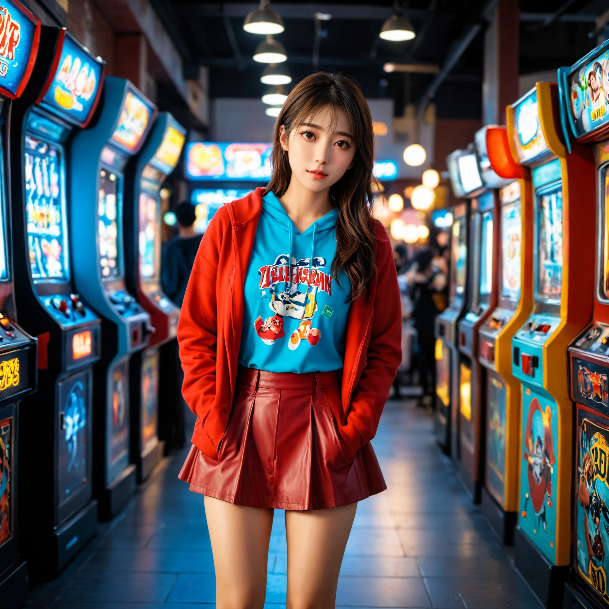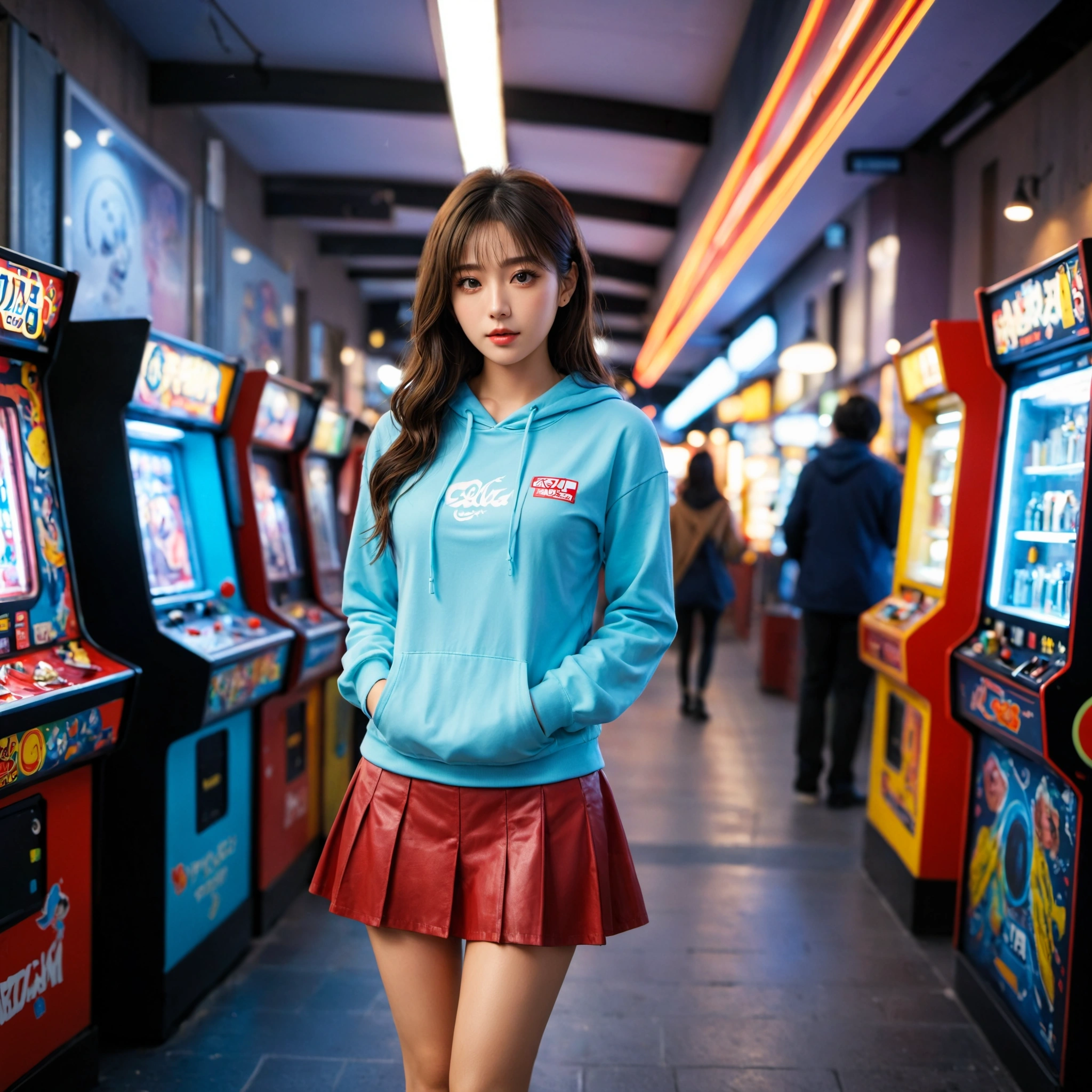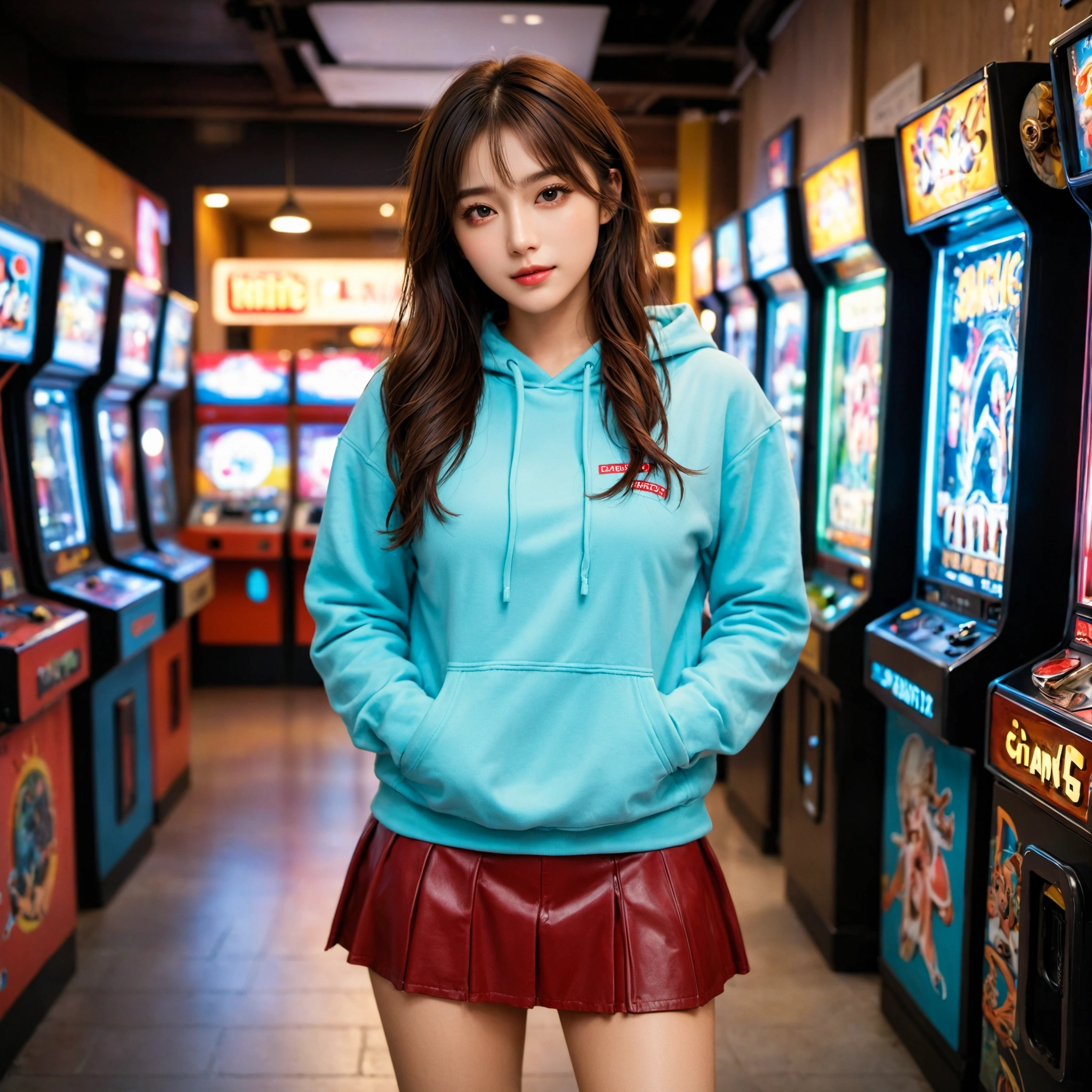 見てくれよ、この完璧な「ゲーセンデート」感!カラフルなゲーム機が並ぶ中、こっちを見てる姿がたまらない。フードを被ったカジュアルなスタイルが、逆に彼女の可愛さを引き立ててるんだよな。