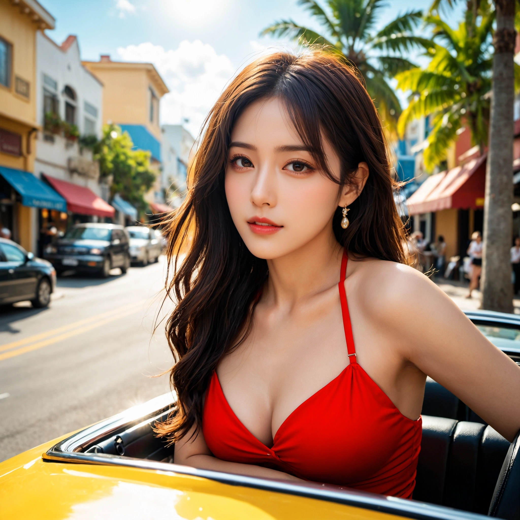 見てくれよ、この海外セレブみたいなオーラ…!燦々と輝く太陽の下、パームツリーが並ぶ街をオープンカーで駆け抜けるとか、もはや映画のワンシーンだろ。鮮やかな赤い水着が、その美貌をさらに引き立ててて、眩しすぎる…!