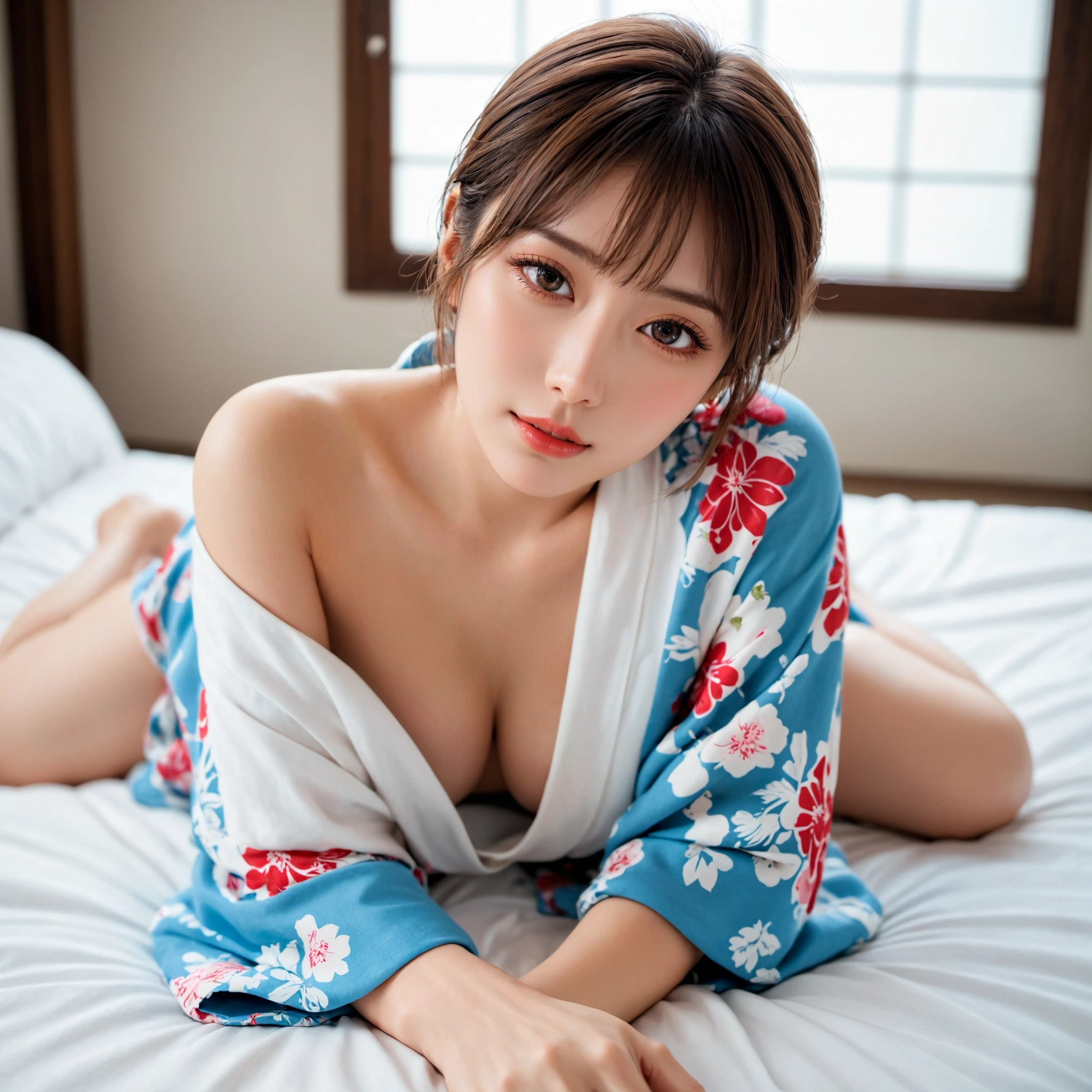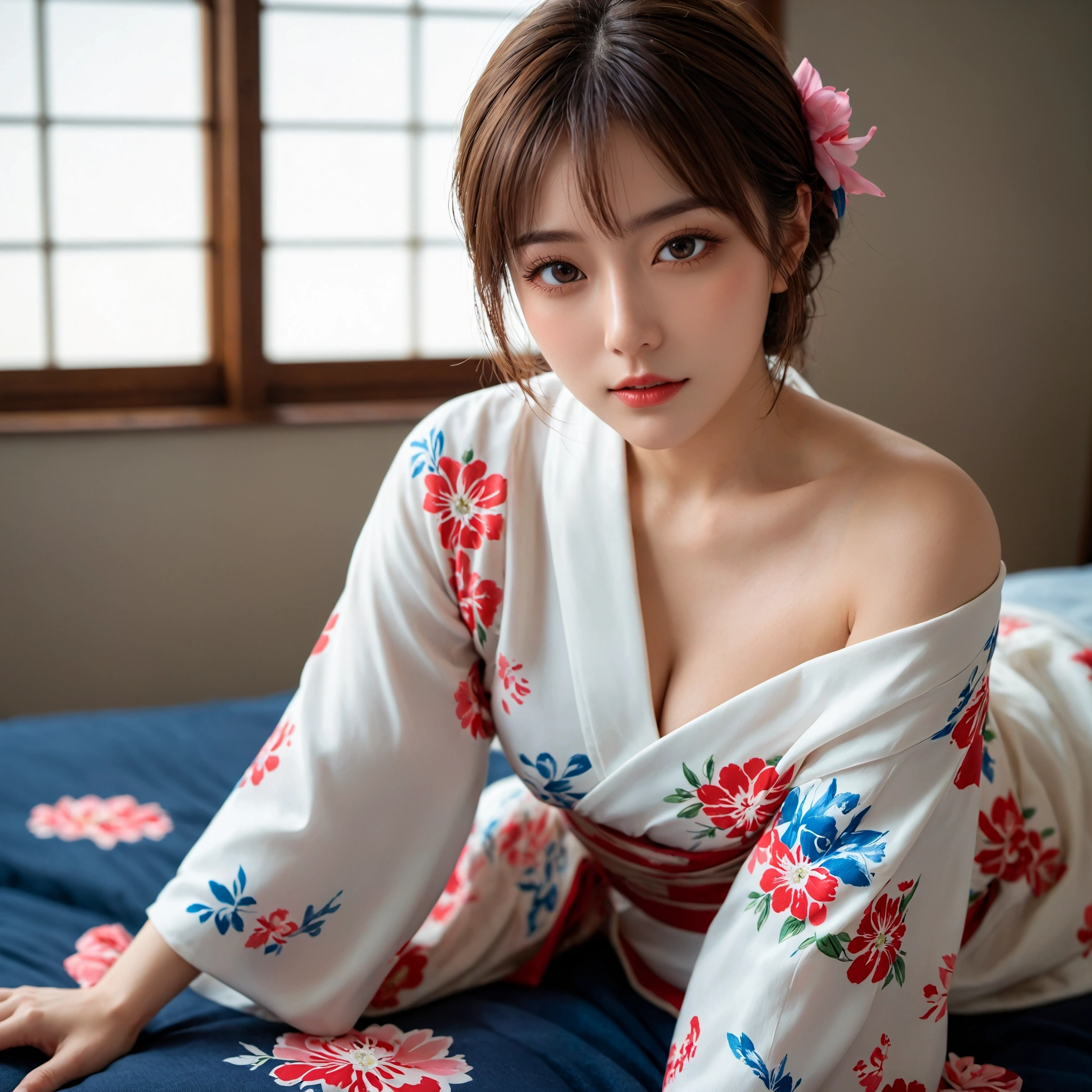 見てくれよ、この破壊力抜群の浴衣姿を! きっちり着こなす浴衣も風情があっていいけど、やっぱり少し着崩してはだけた感じがたまんねぇんだよ…。華やかな花柄の浴衣と、そこから覗く透き通るような肌のコントラストに、もう目が釘付けだよな。