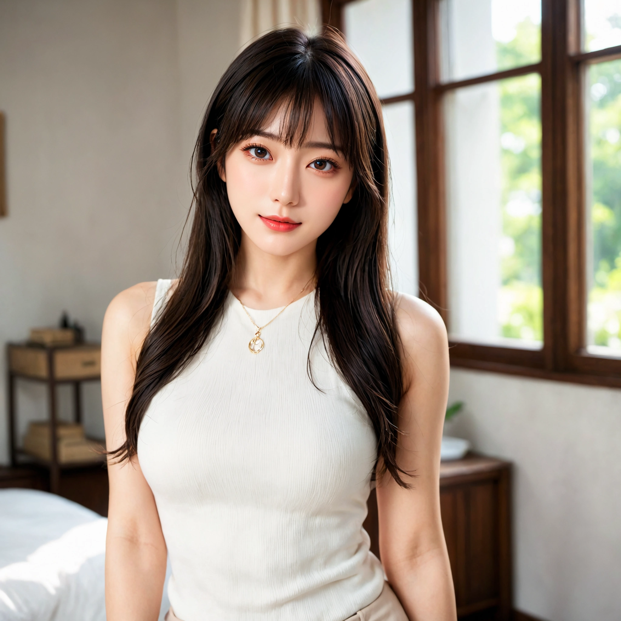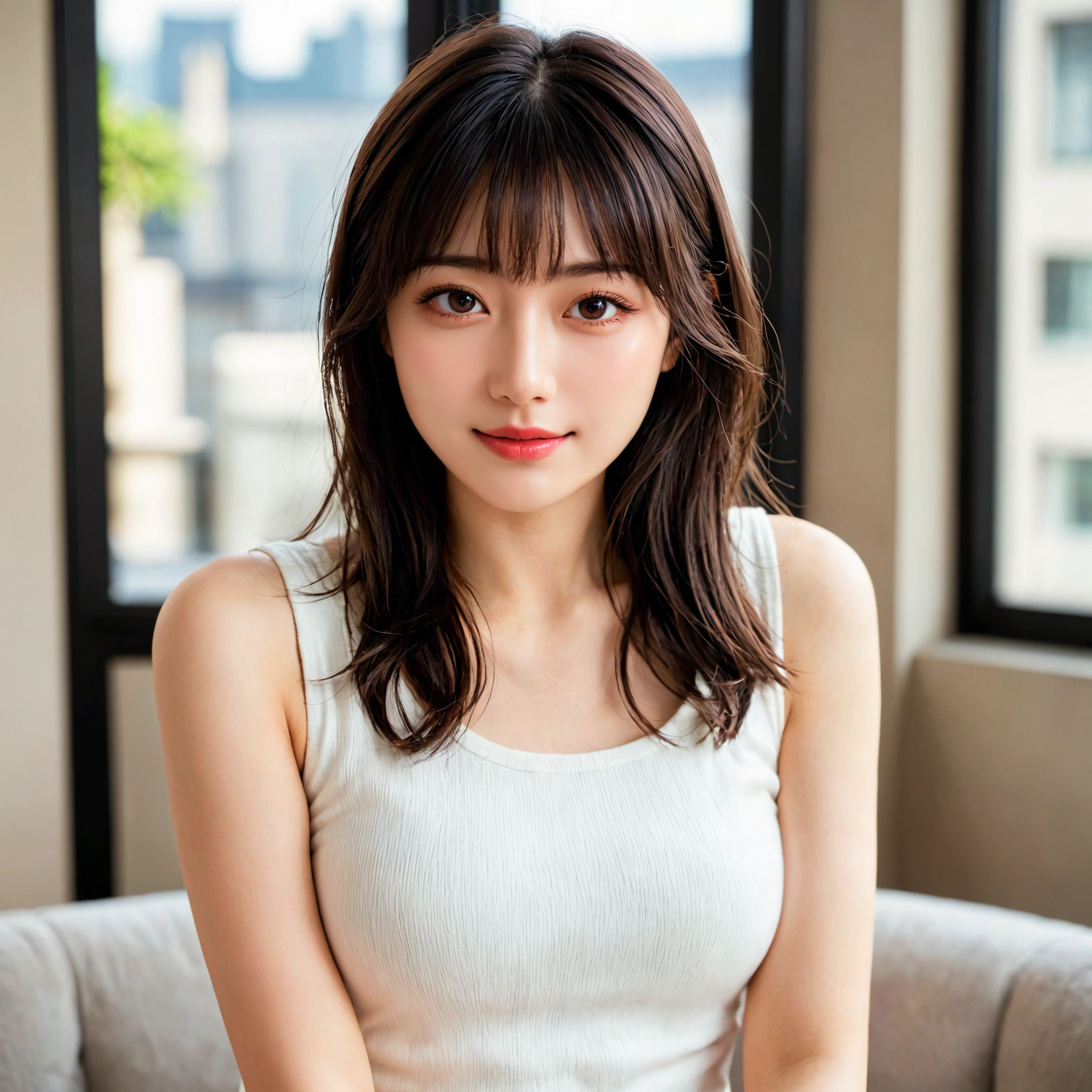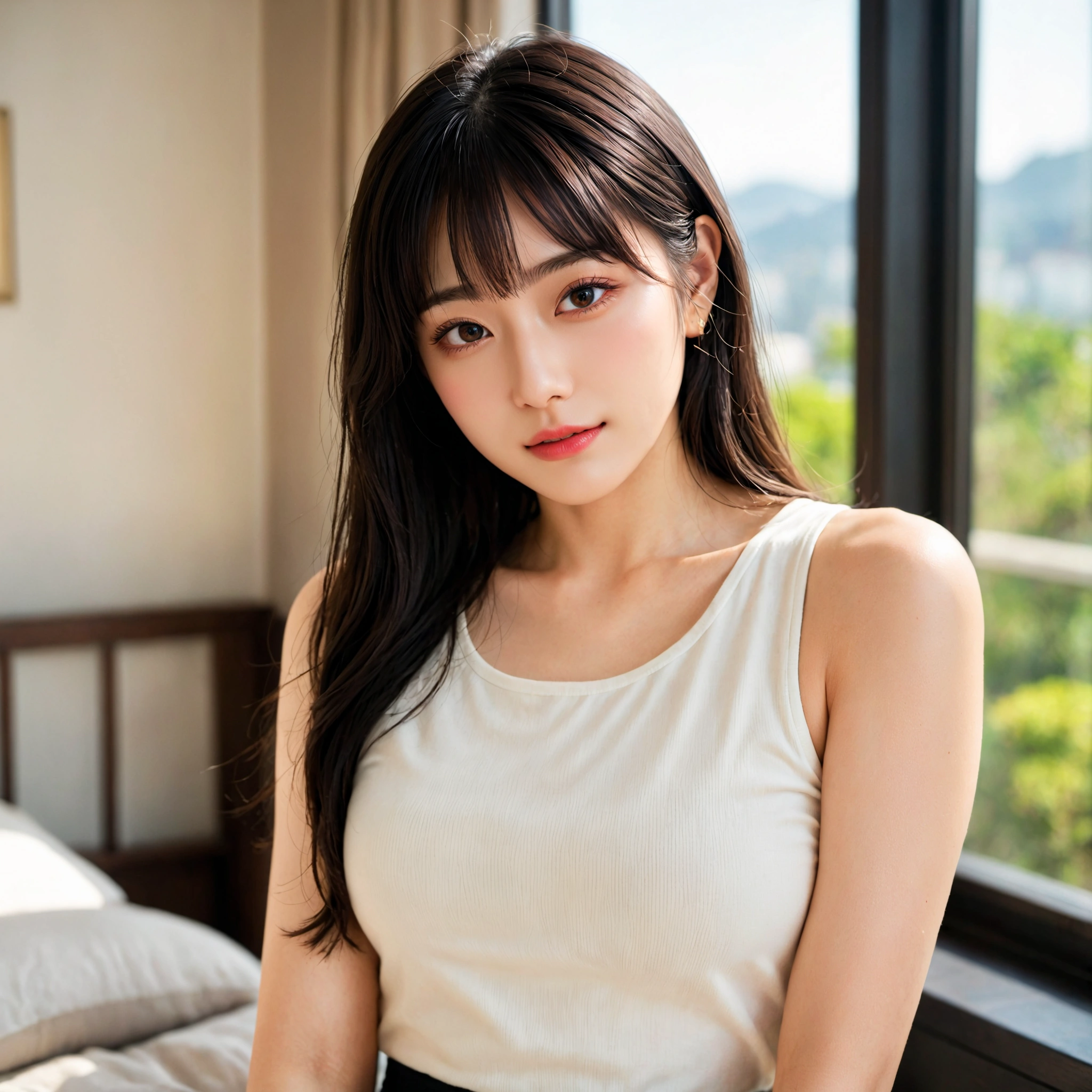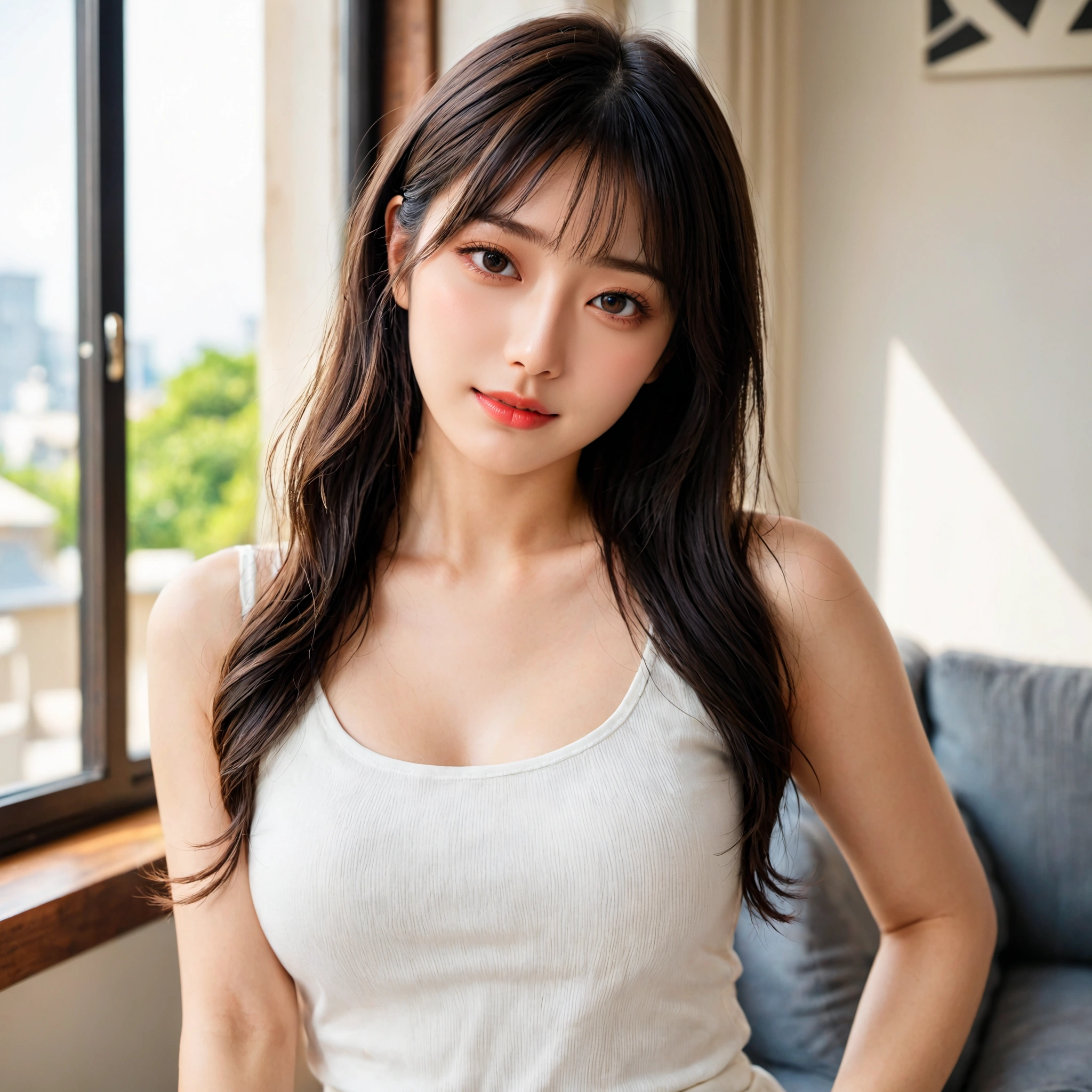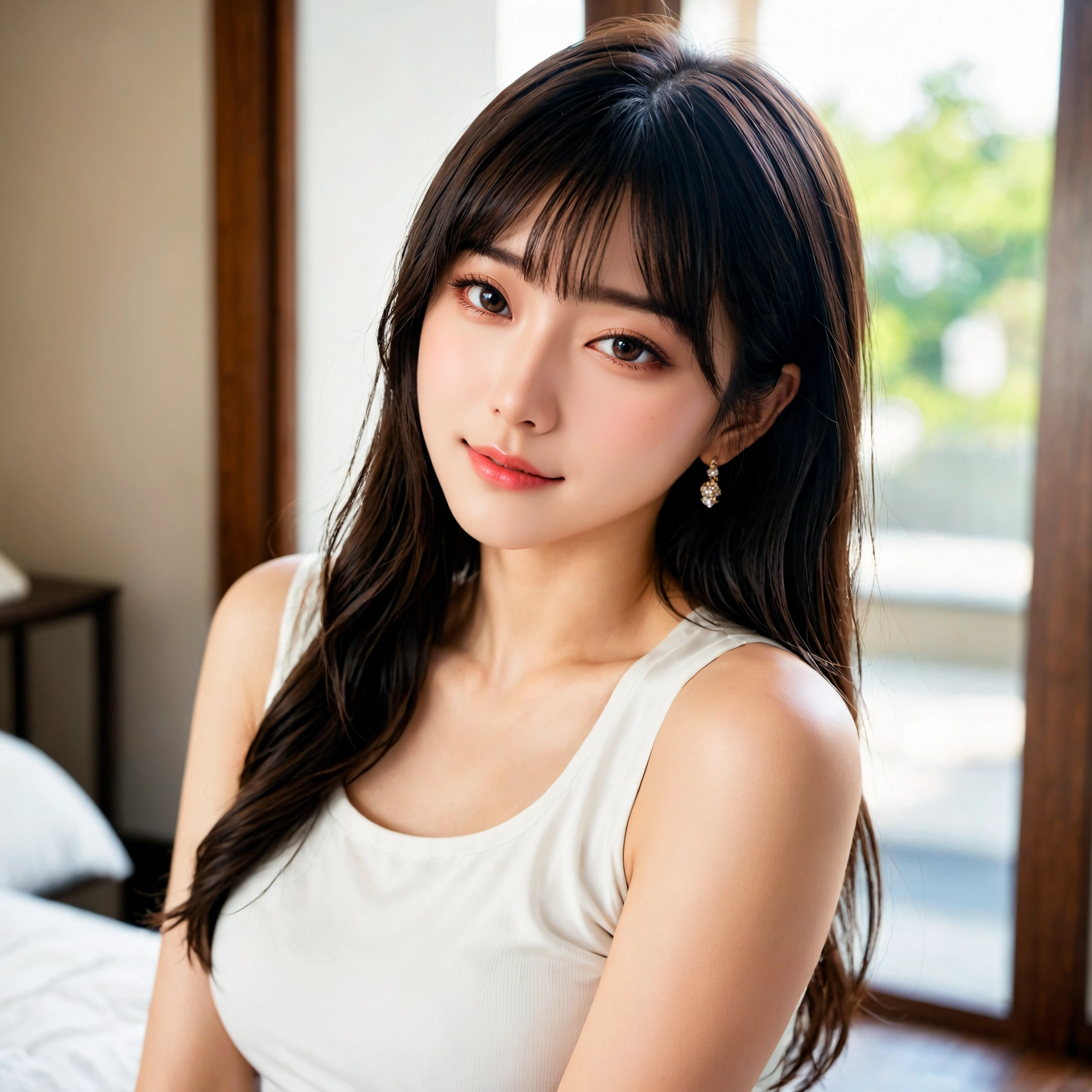 休日に家でのんびり過ごしてるみたいな、リラックスした雰囲気が最高すぎる。 窓から差し込む柔らかい光の中で、こっちを見てふっと微笑んでくれるんだぜ? 派手なメイクや衣装じゃないからこそ感じられる、素の彼女の可愛さに、心の底から癒やされる。