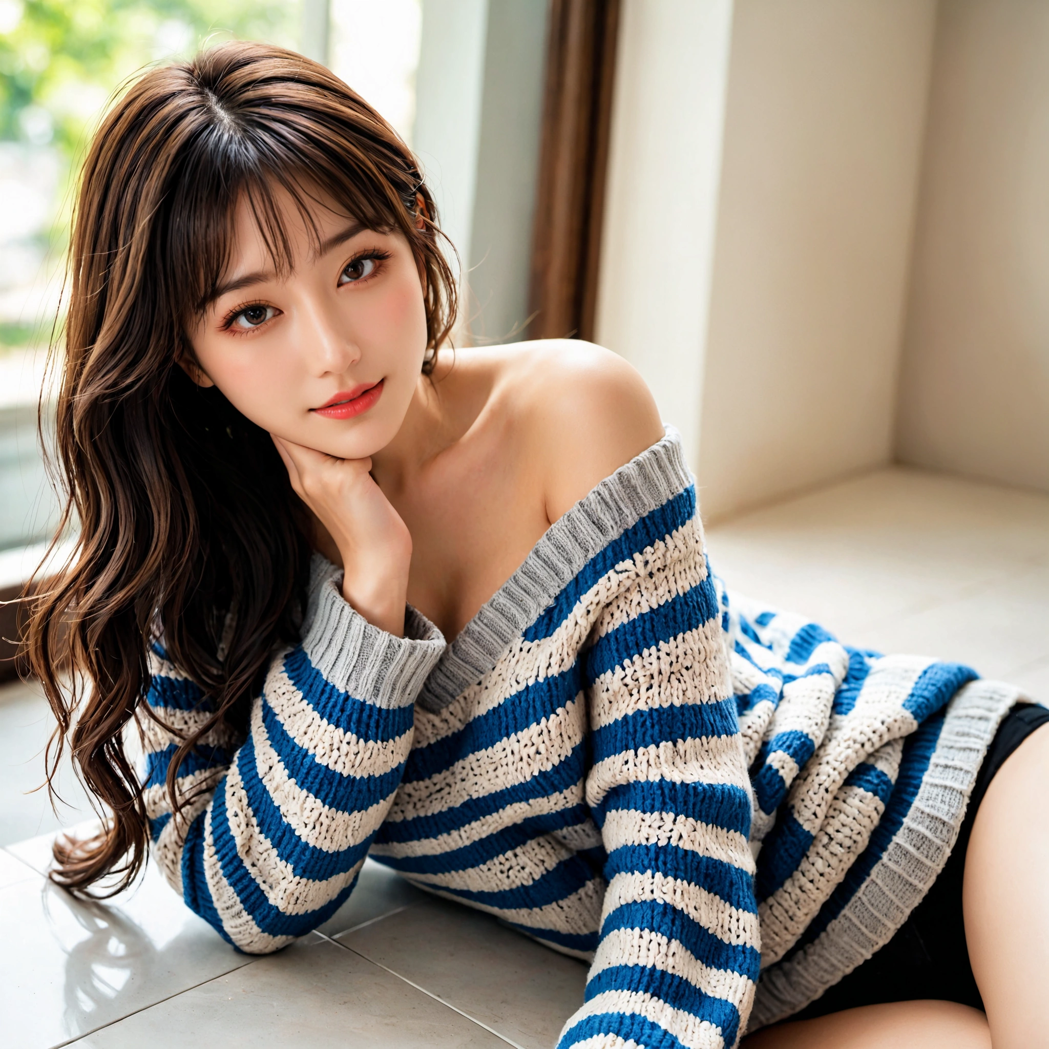 見てくれよ、この青と白の爽やかなボーダーニットを。 ちょっと大きめサイズで袖が余ってる、いわゆる「萌え袖」。これだけでも可愛いのに、とどめはやっぱり、無防備な肩出しだよな!