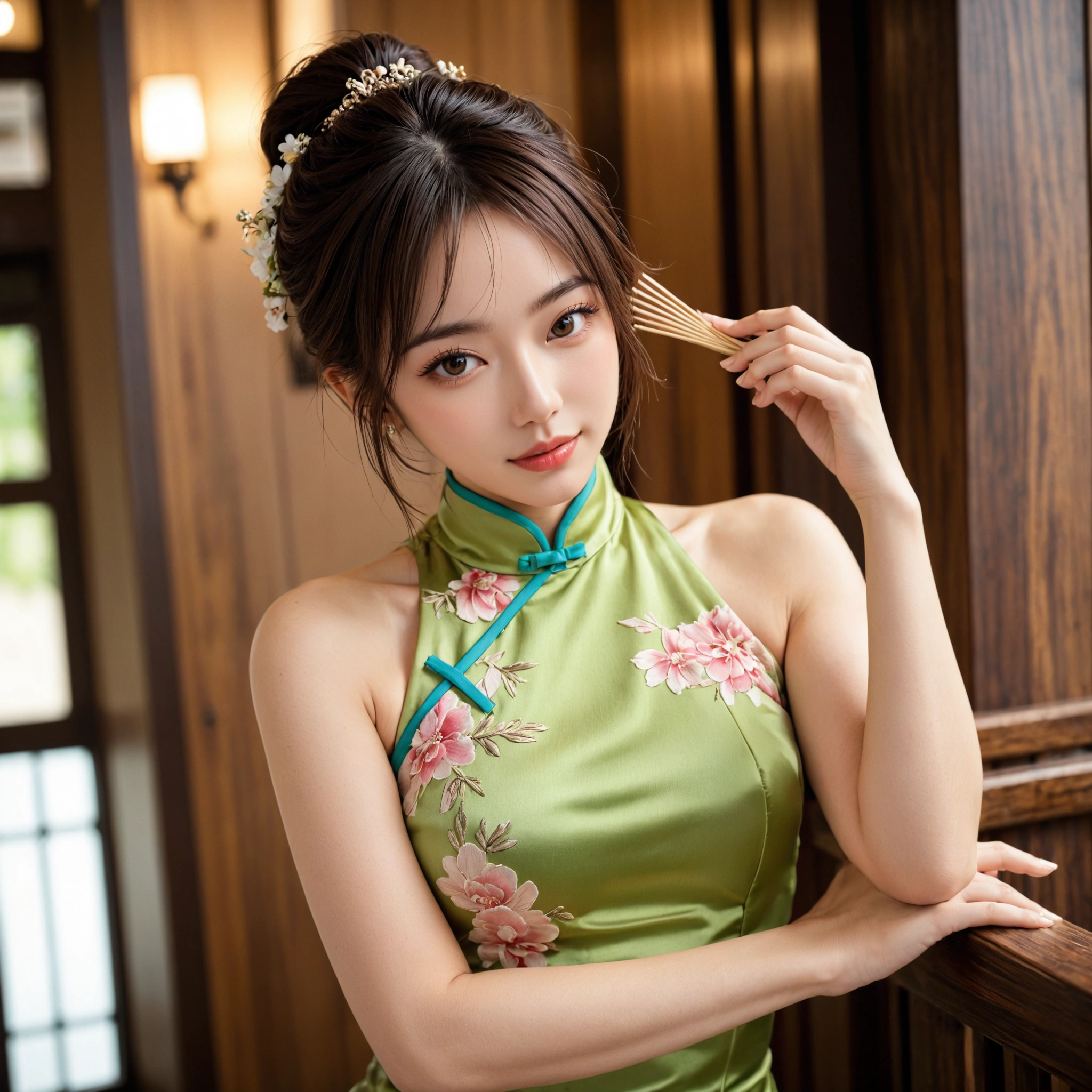 見てくれよ、この気品あふれるチャイナドレス姿を。 光沢のある生地が彼女の美しいボディラインを完璧に際立たせてて、めちゃくちゃセクシーだよな…。 大胆に入ったスリットからチラリと覗く肌に、ドキドキが止まらないって!