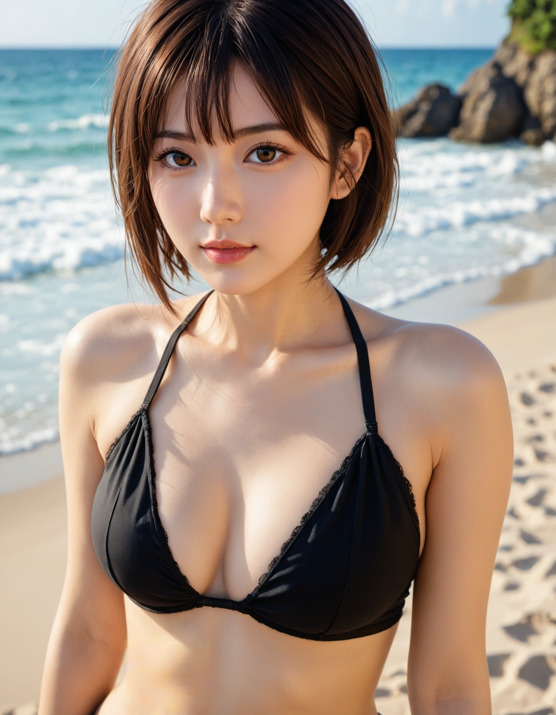 爽やかなショートボブと、シンプルな黒ビキニ。この王道の組み合わせが、逆に彼女の洗練された美しさを際立たせている。余計な飾りはいらない、素材そのもので勝負してる感じがたまらなくクールだ。