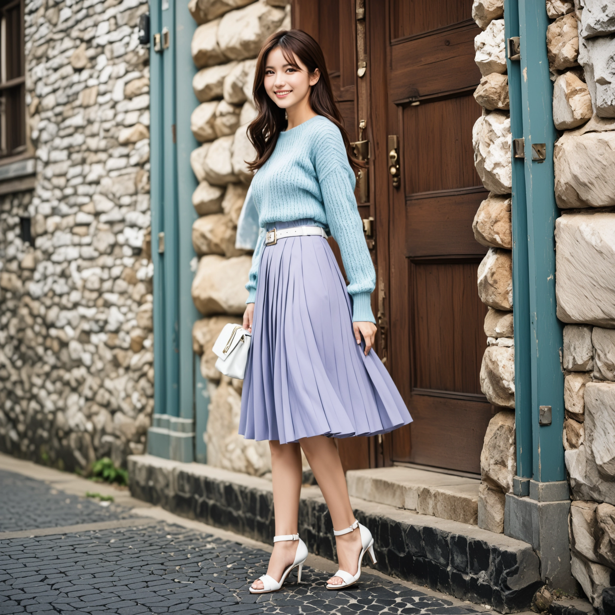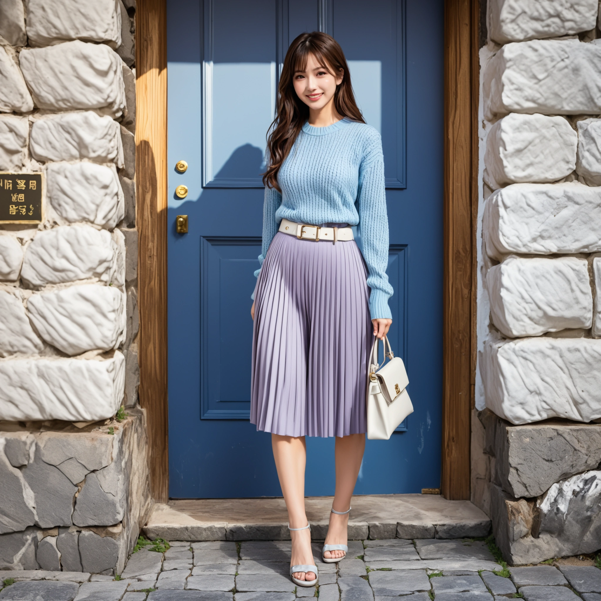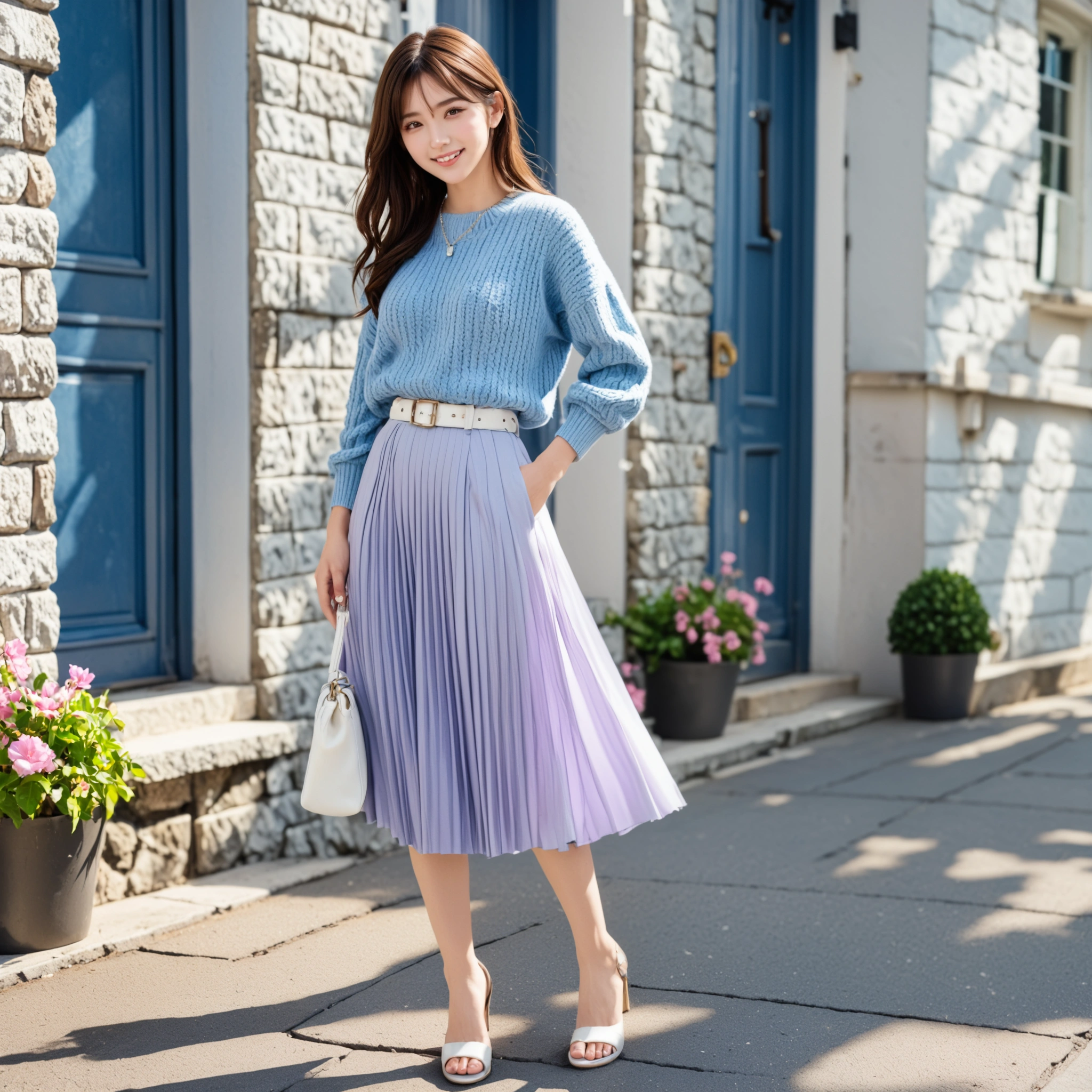 これまでのセクシーな雰囲気とは一味違う、王道の「きれいめコーデ」がたまらない! 爽やかなブルーのニットに、上品なラベンダーのプリーツスカート。この色の組み合わせ、センス良すぎだろ…。 白のベルトやサンダルも完璧なアクセントになってて、どこから見てもマジで可愛い。