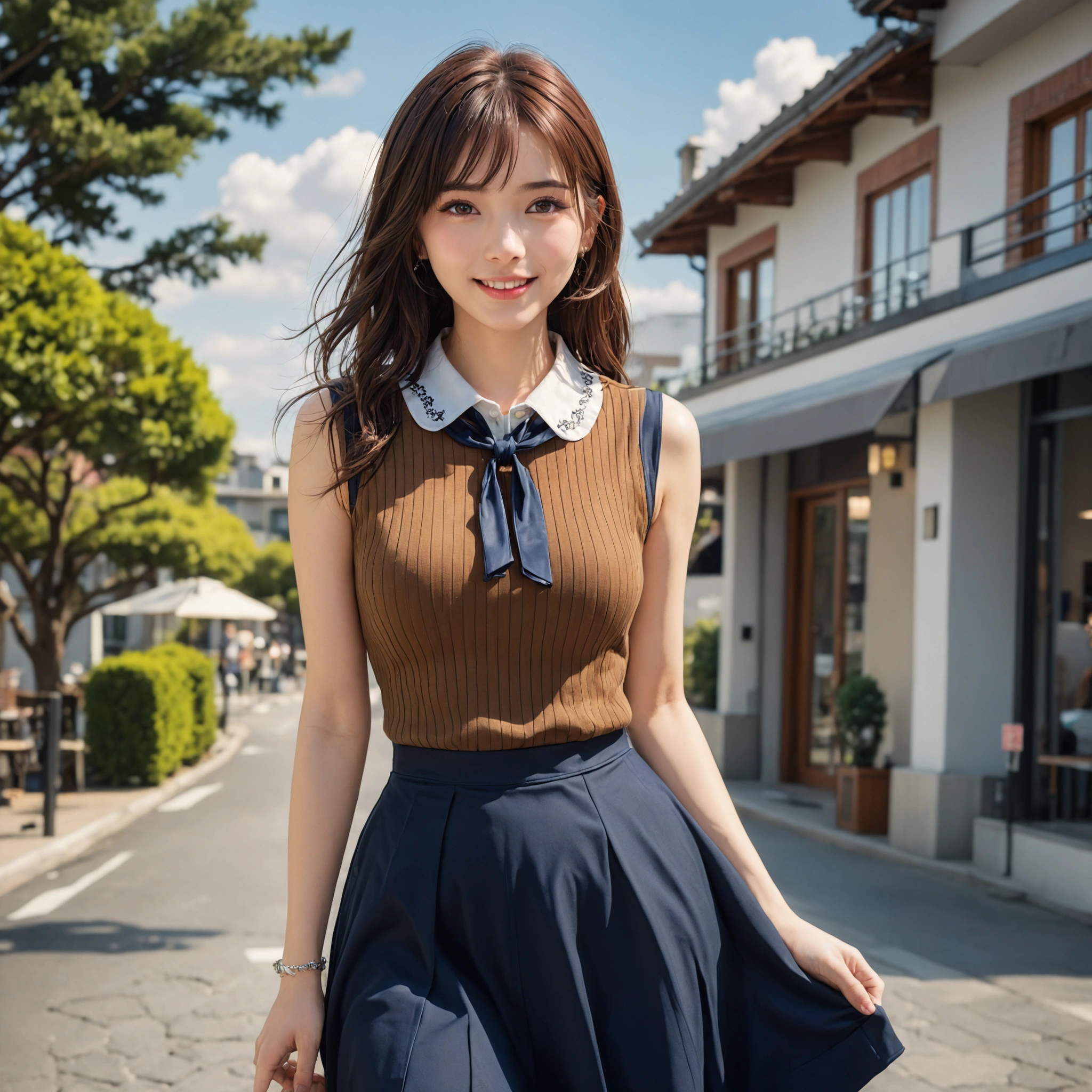 見てくれよ、この完璧なシチュエーション。 どんな美しい景色をバックにしても、彼女の輝く笑顔が一番に目に飛び込んでくる。 上品なブラウンとネイビーのコーデが、リゾート地の雰囲気に溶け込んでて、マジでオシャレだよな。