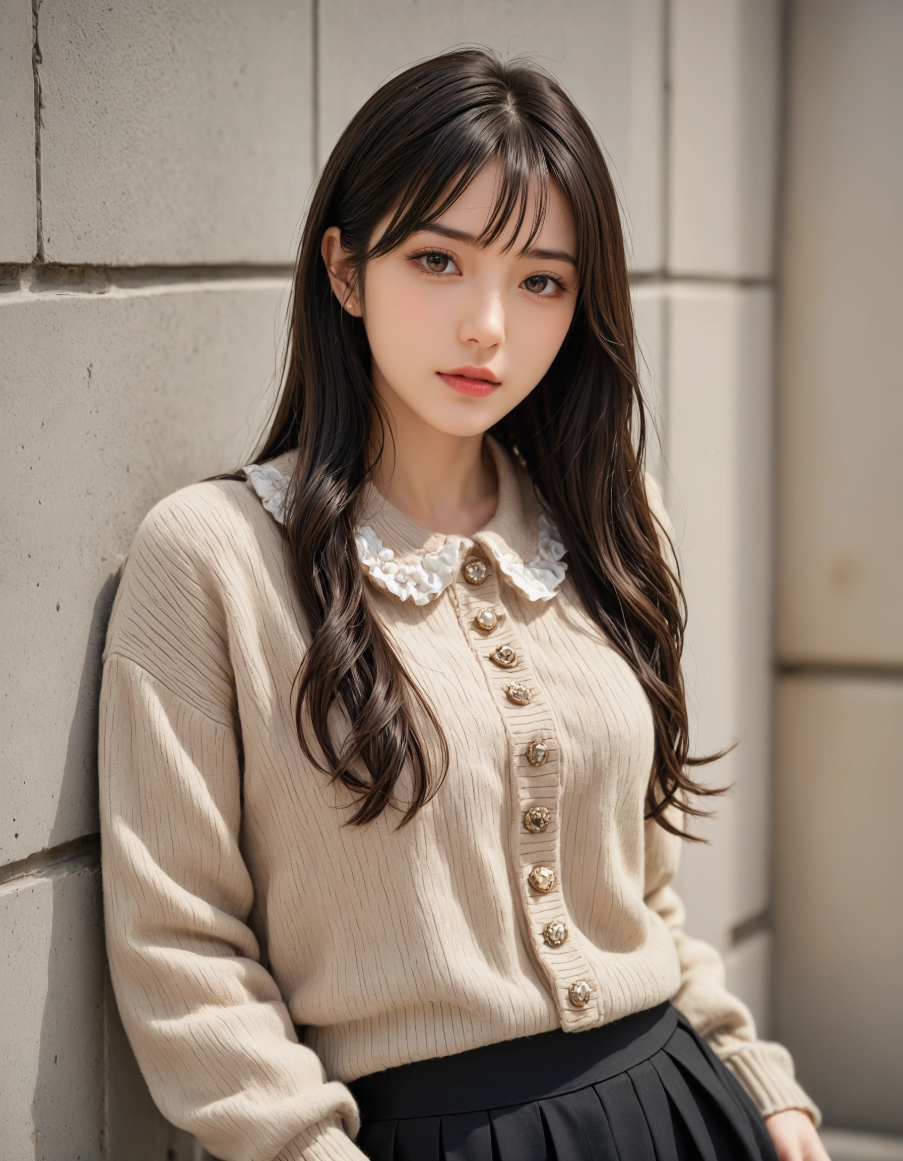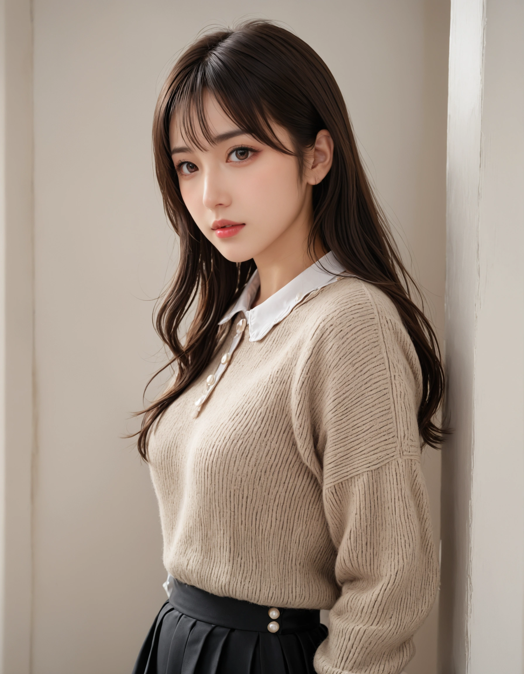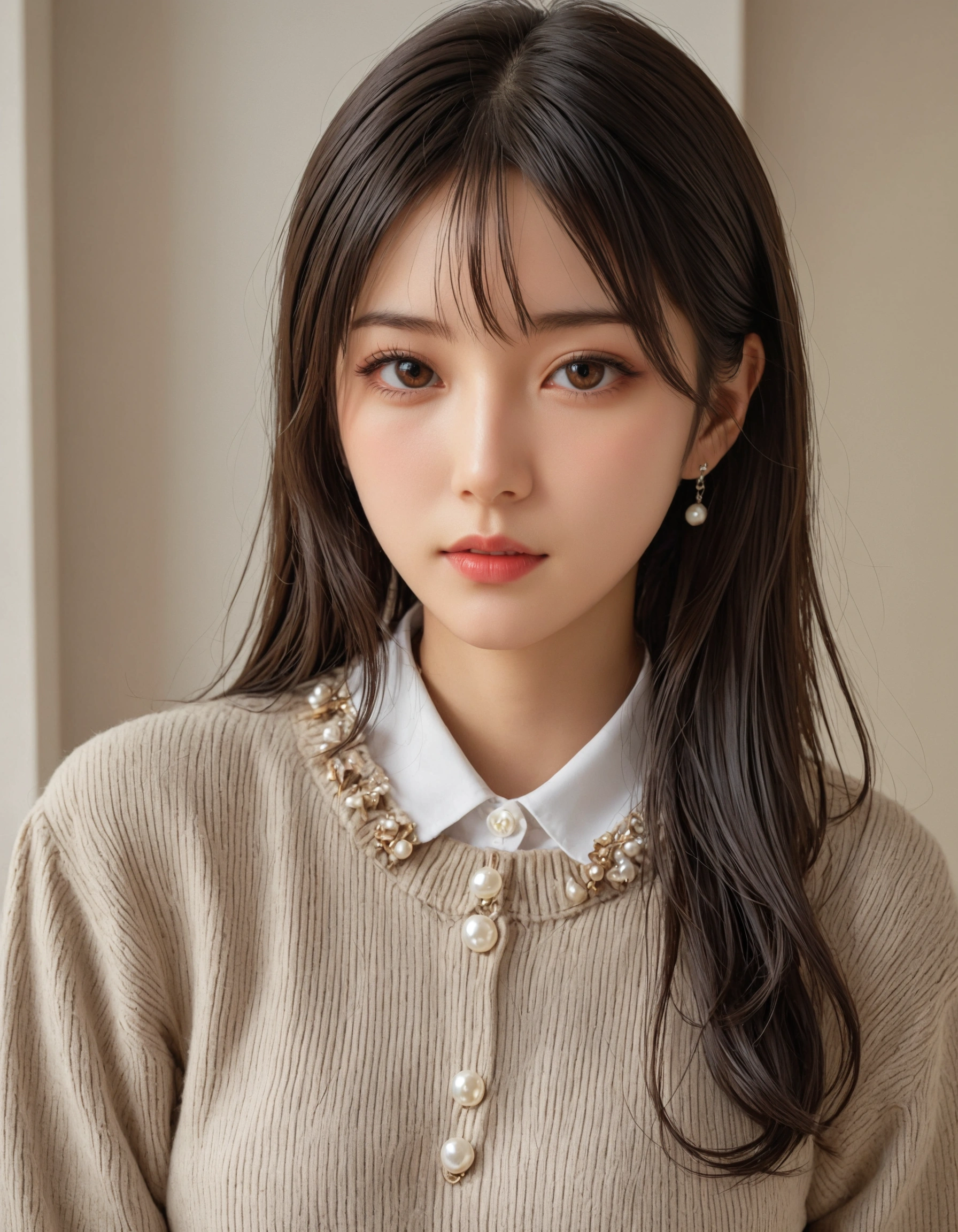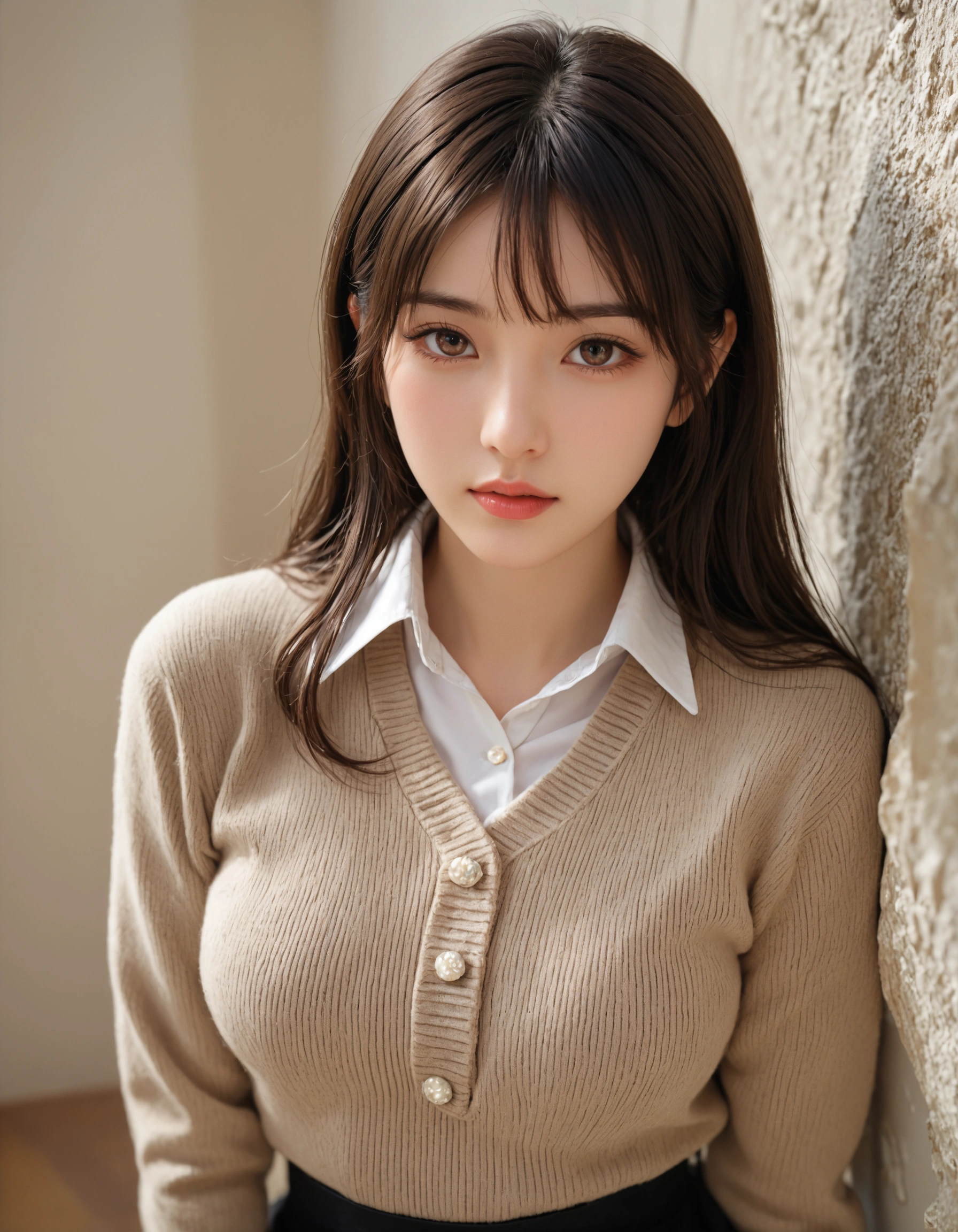 上品なニットと襟付きシャツのコーデが、彼女の持つ「凛とした美しさ」を際立たせてる。 パールのボタンや、レースの飾りがついた襟が、さりげない可愛らしさをプラスしてて最高だよな。 派手なだけが魅力じゃないって、彼女を見てるとよく分かるぜ。