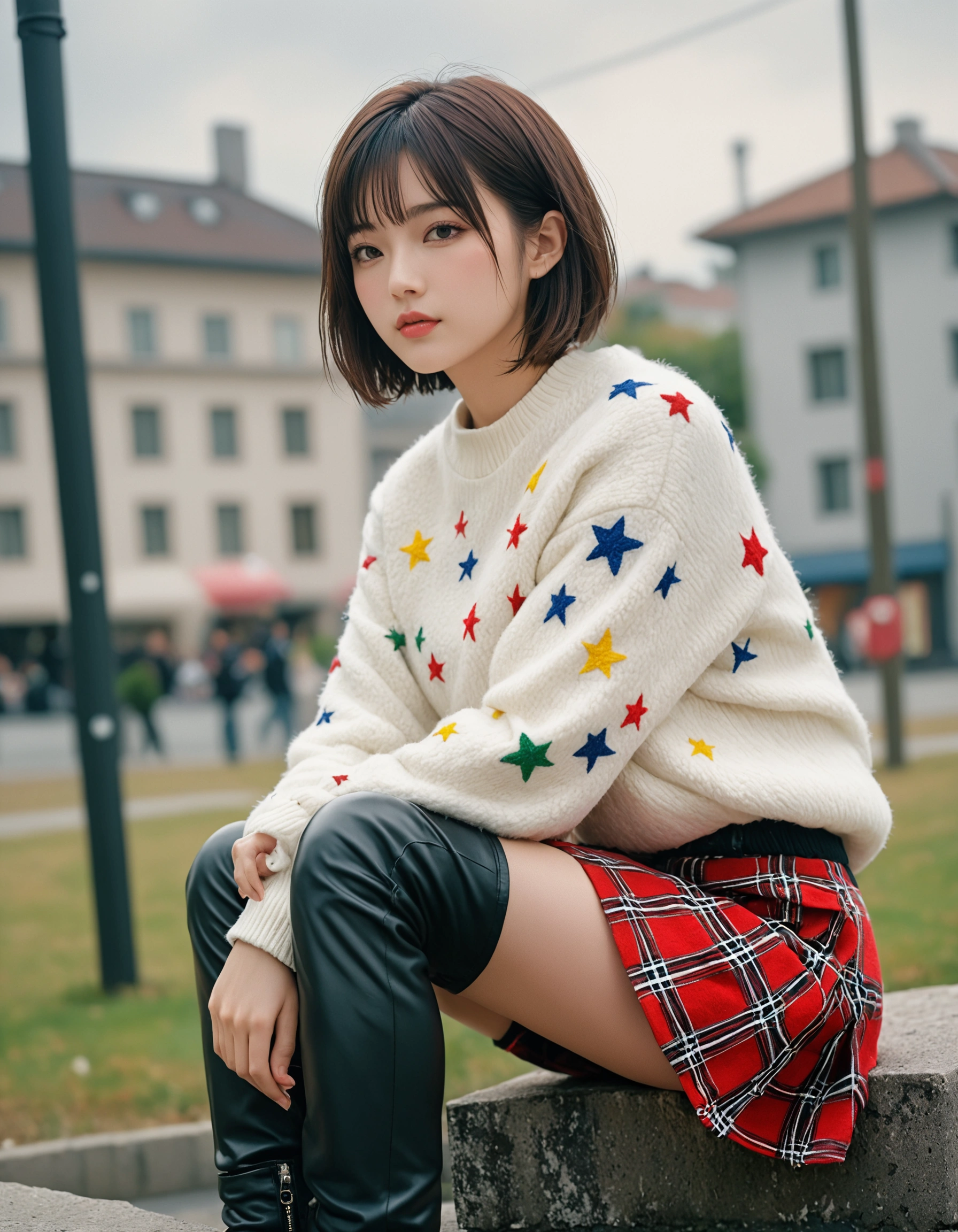 ポップな星柄のニットと、赤チェックのミニスカート。そして、ハードな黒のロングブーツ。 この甘さと辛さが絶妙にマッチした甘辛コーデは、何度見ても最強だぜ。 何気ない街の景色が、一瞬で彼女だけのステージに変わる。