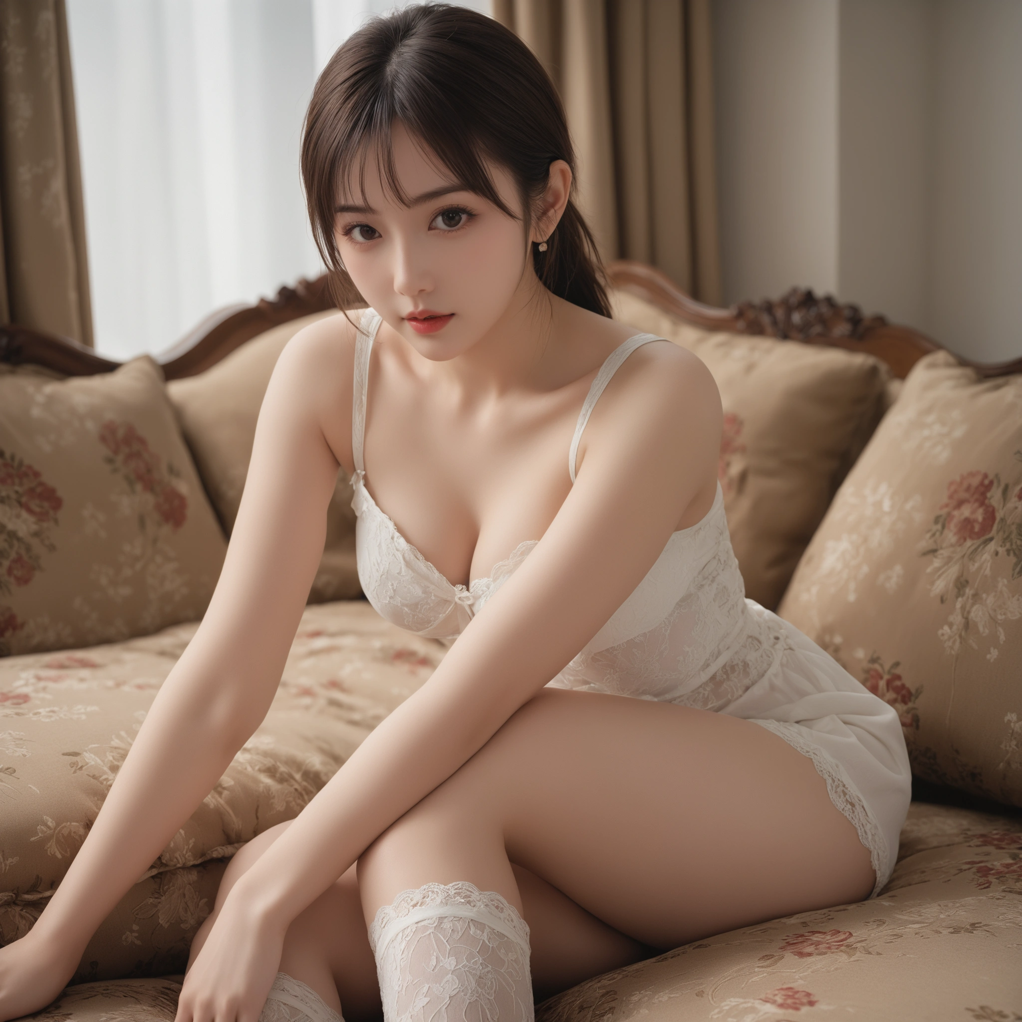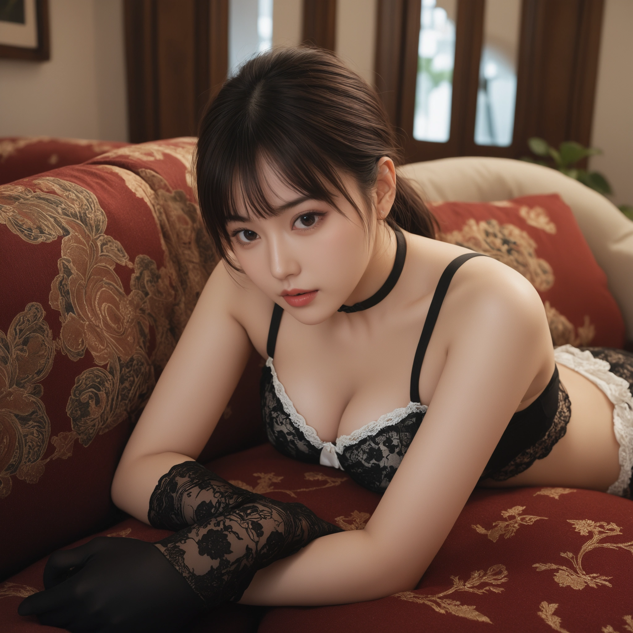 柔らかそうな白い肌に、繊細なレースのルームウェア。 そして、こちらをじっと見つめる、あどけなさと色気が混ざったような瞳……。 この「守ってあげたい感」と、ふとした瞬間にドキッとさせる大人の雰囲気のギャップがたまりませんよね。特に、黒のレース手袋やストッキングを合わせたコーデなんかは、破壊力が凄まじいです(笑)。
