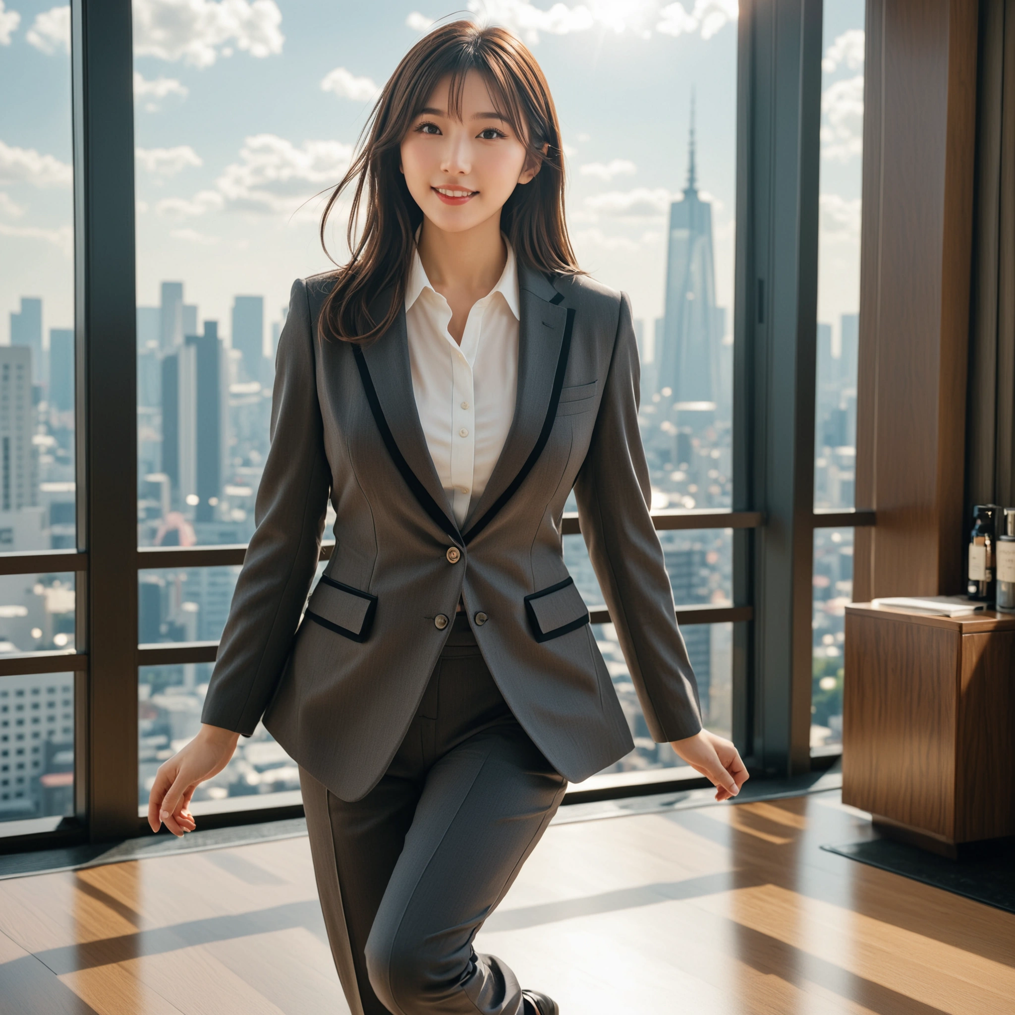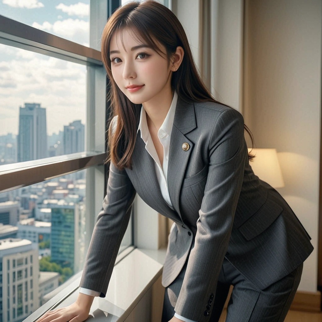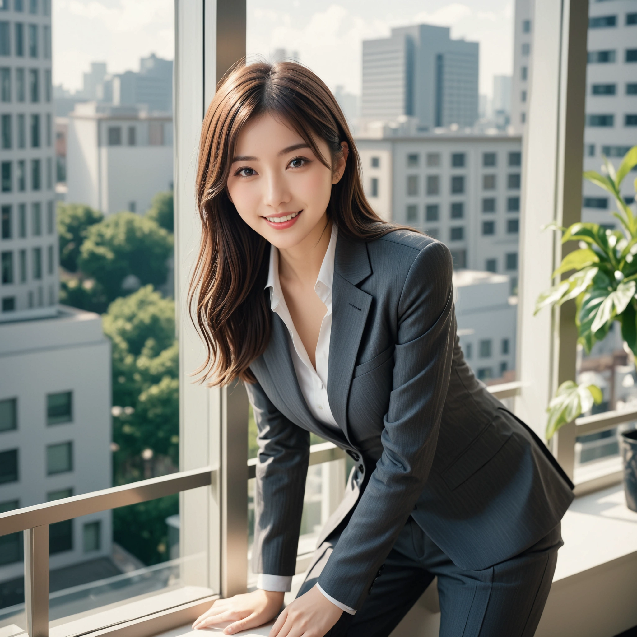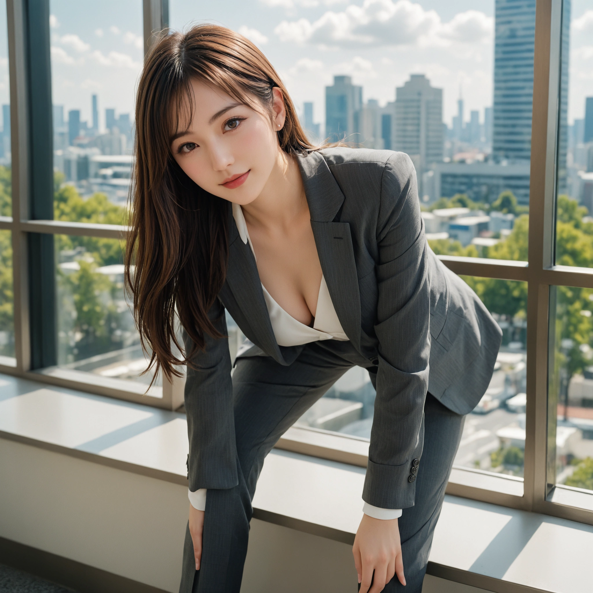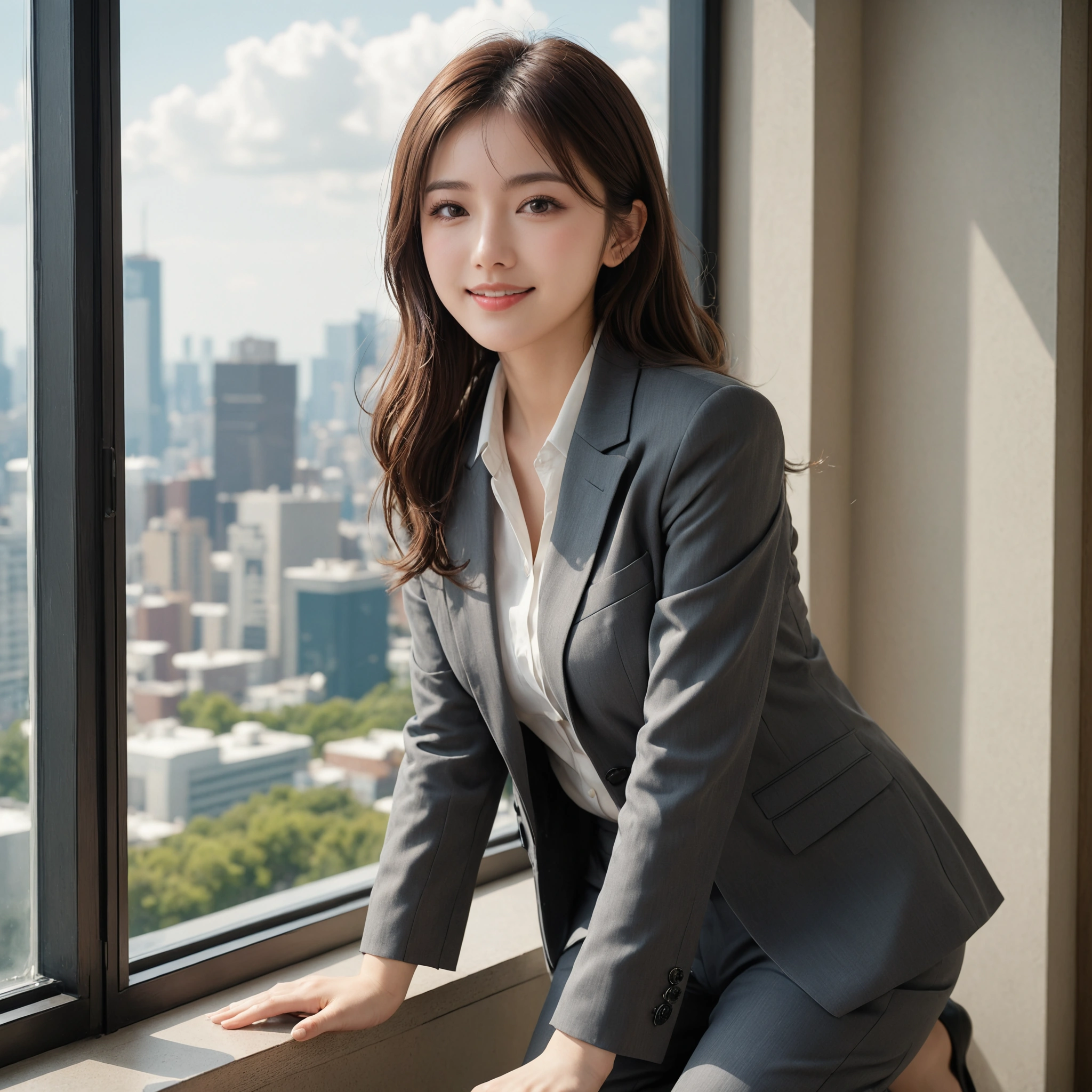 窓から差し込む明るい日差しと、都会のビル群をバックに佇む彼女たち。 カチッとしたグレーのスーツを着こなしているのに、ふとした瞬間に見せる柔らかな笑顔や、こちらを覗き込むような視線……。この「キチッとしているのに可愛い」というギャップが、もうたまりません。