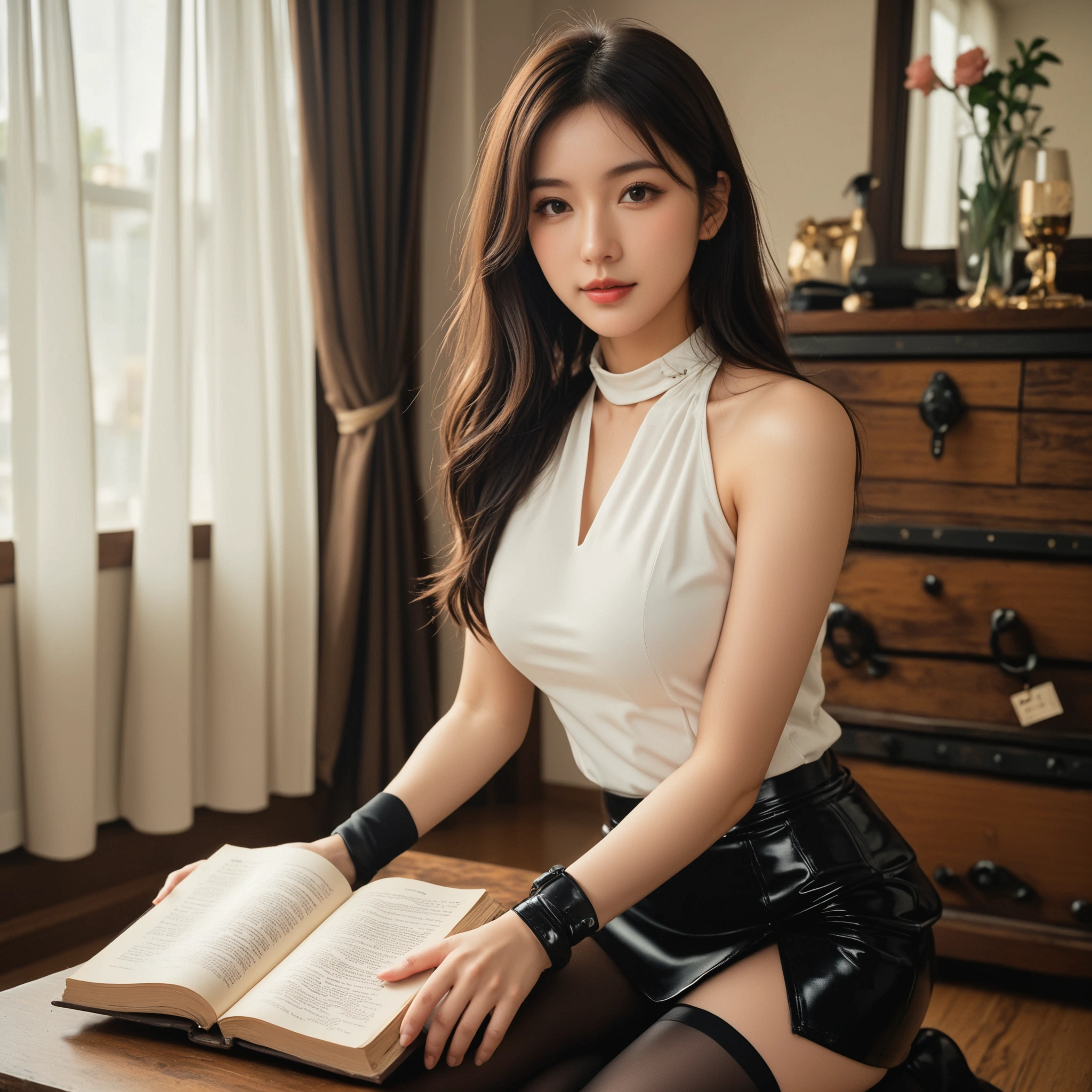 光の当たり方も柔らかくて、レザーやタイツの絶妙な光沢感がリアルに表現されています。ただ露出が多いだけじゃなくて、こういう「品があるのに色っぽい」雰囲気こそ、AI美女の真骨頂だと思います。