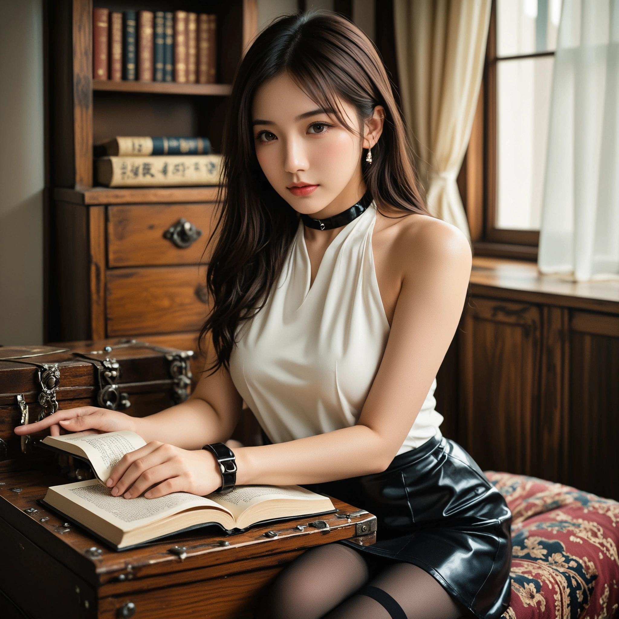 背景もまた良い味を出していて、アンティークな家具や本に囲まれた書斎のような雰囲気。「休日の昼下がりに、綺麗な家庭教師のお姉さんと二人きり」みたいなシチュエーションを勝手に妄想してしまいますね。