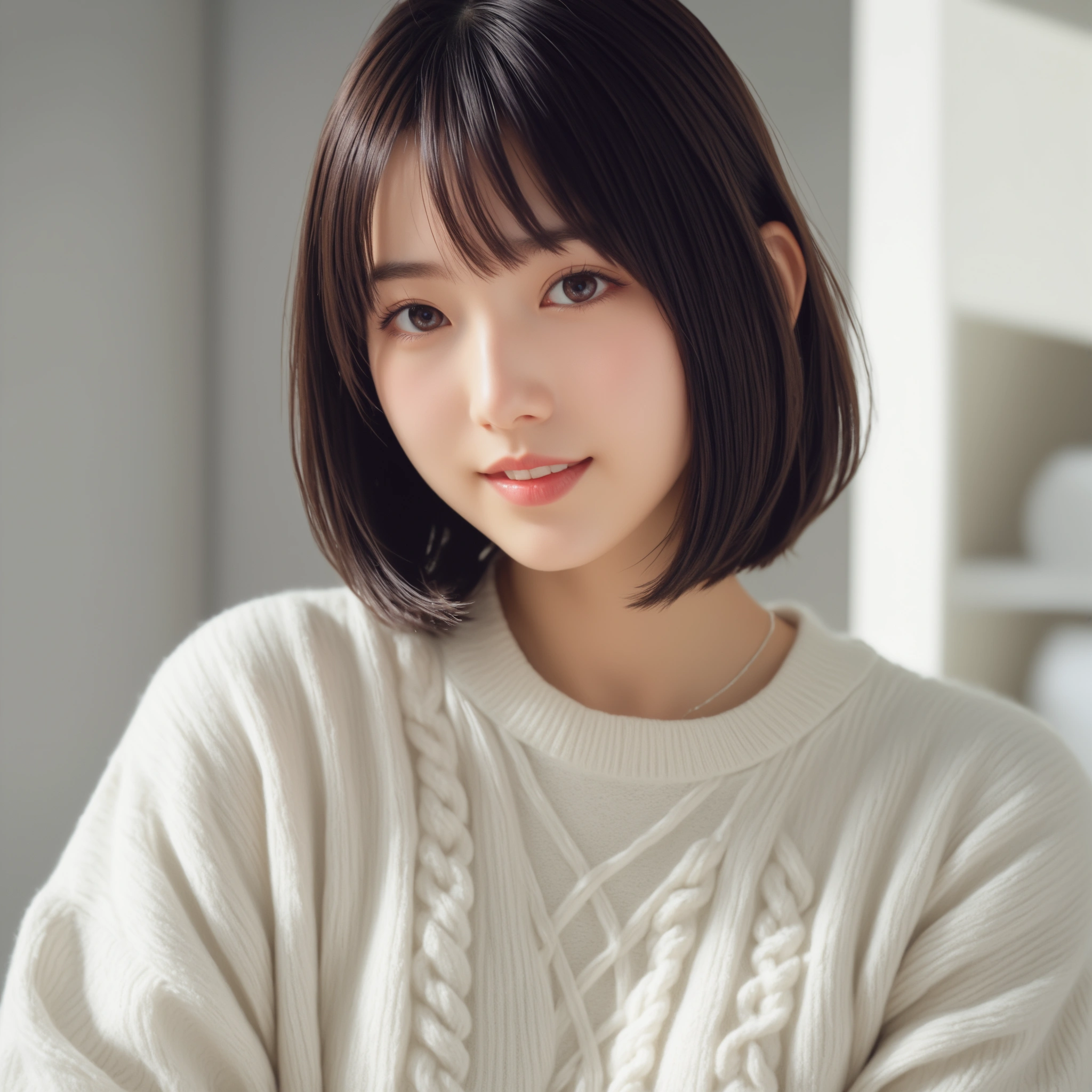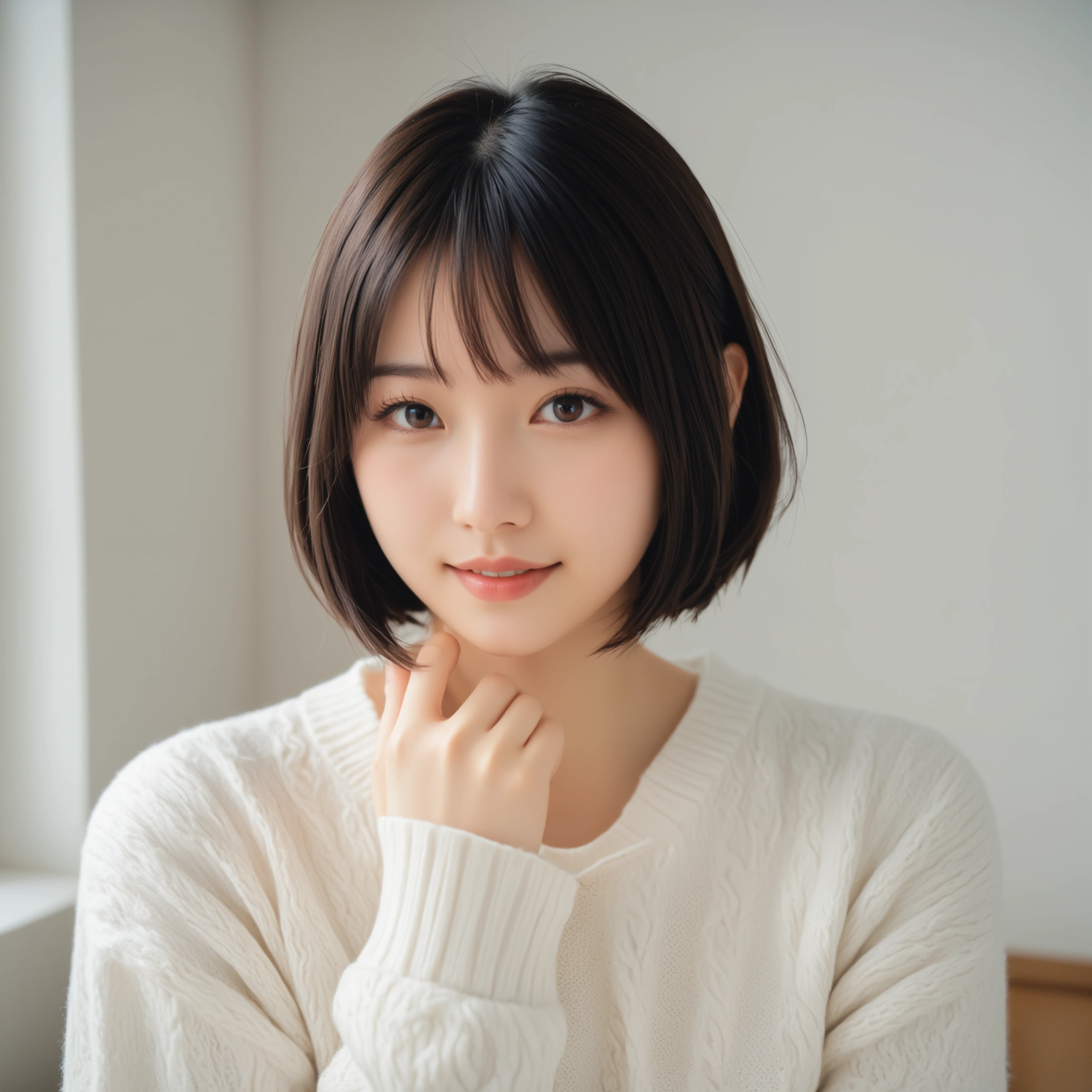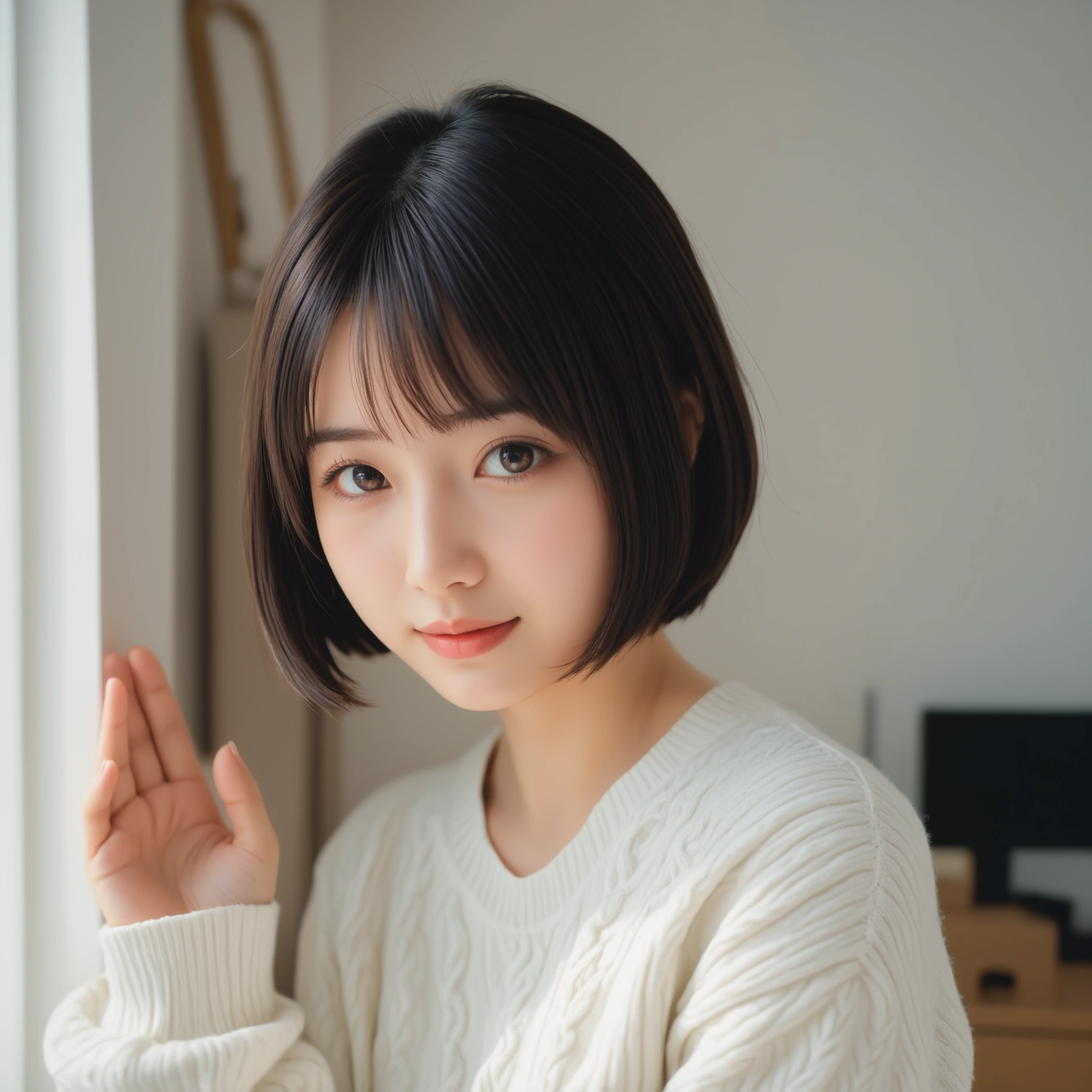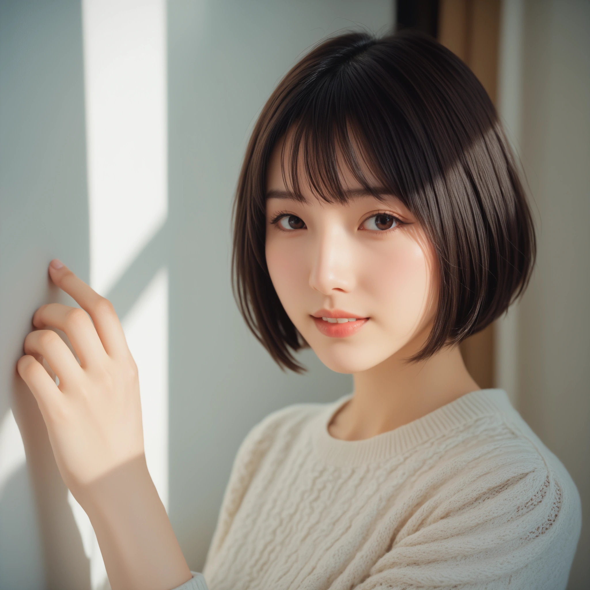 そして何より、このショートボブの透明感よ。 窓から差し込む柔らかい自然光が髪の毛一本一本を照らしていて、空気感まで伝わってくるみたい。カメラ目線で見つめられると、こっちまでドキッとするようなリアルな表情もたまらんよね。 「あれ? 俺、今週末デートしてたっけ?」って脳が錯覚するレベルの破壊力。