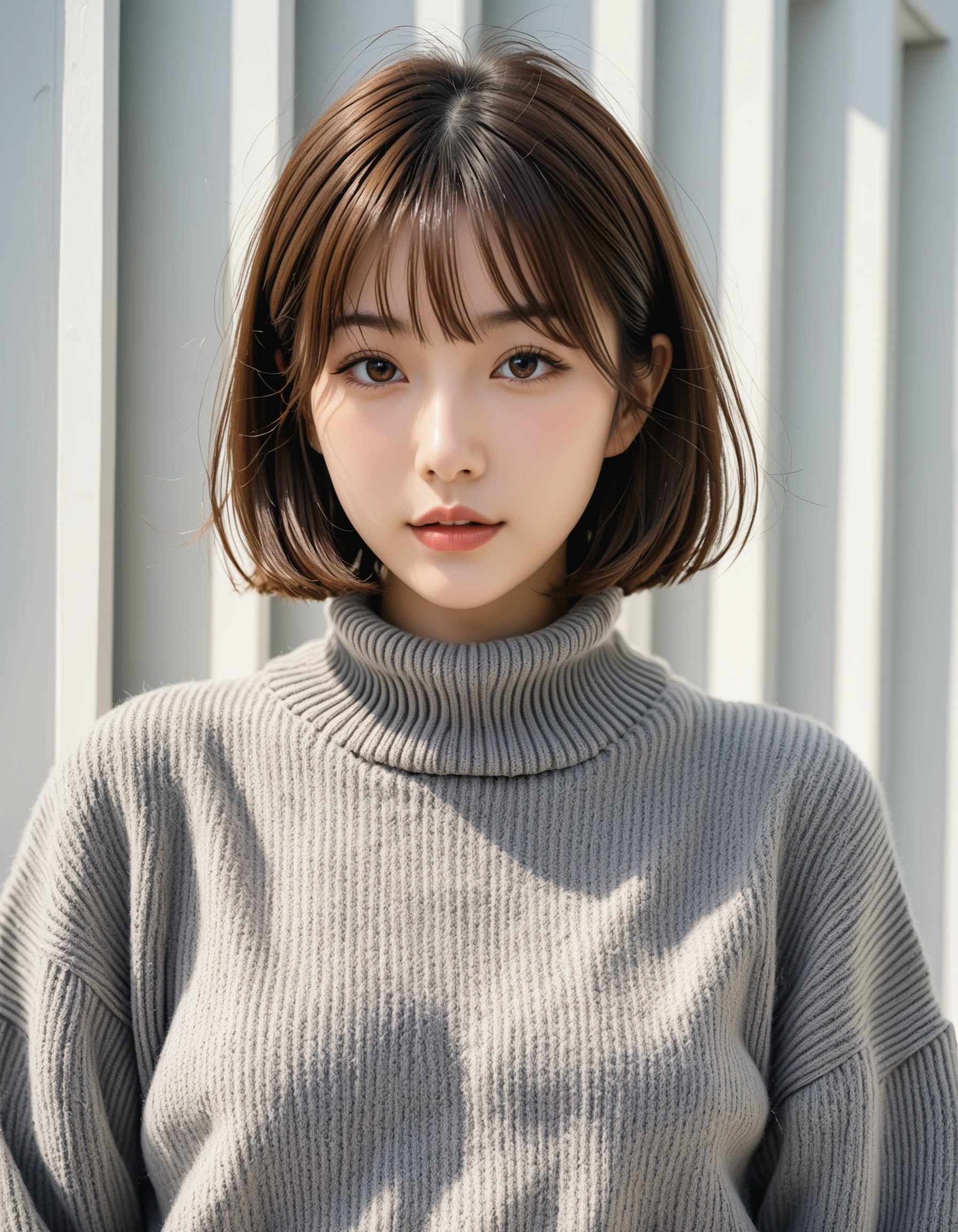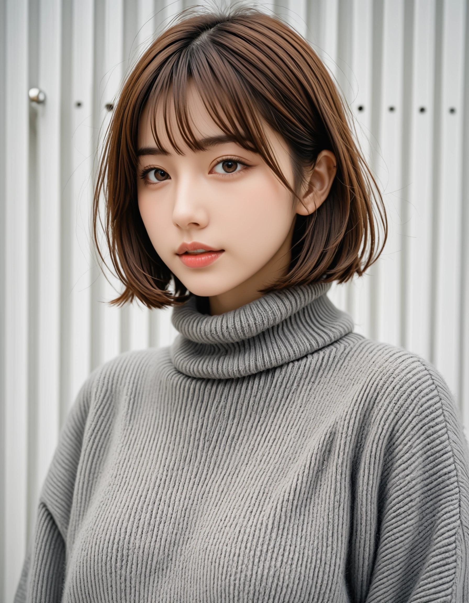いや、もう正直、言葉はいらないレベルで可愛くないですか? ふんわりとしたブラウンのショートヘアに、ざっくりとしたグレーのタートルネック。この「守りたくなる感」がたまりませんよね。