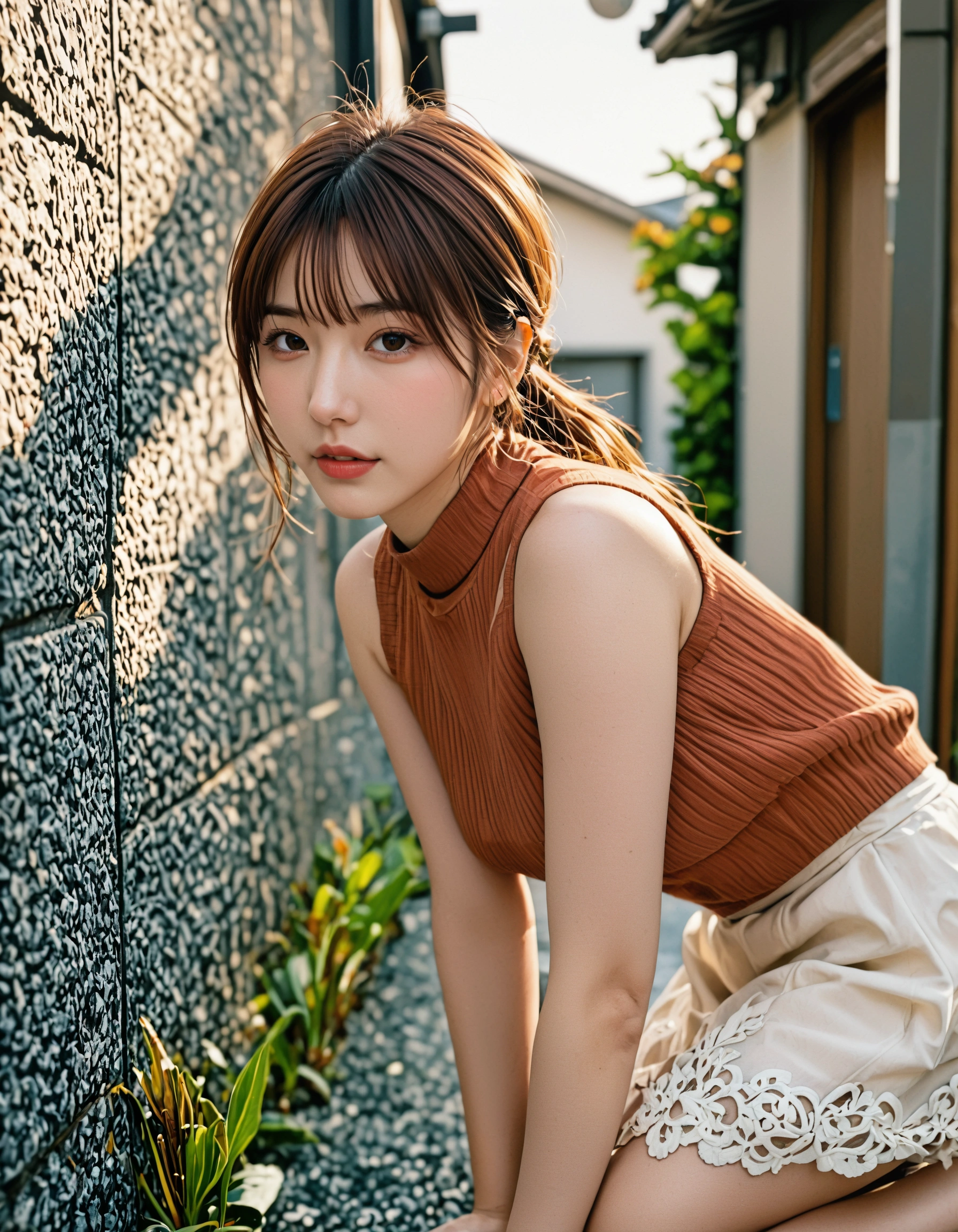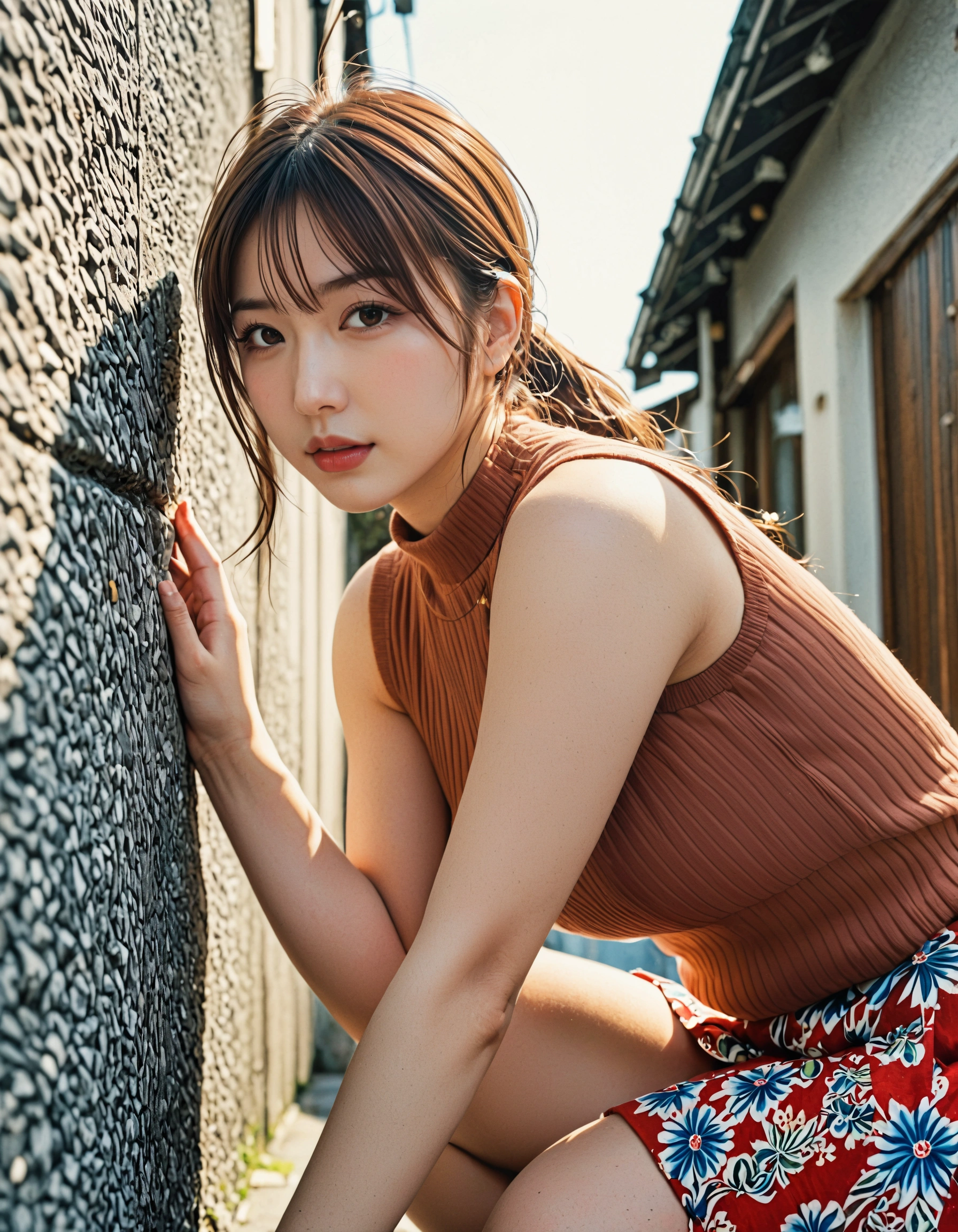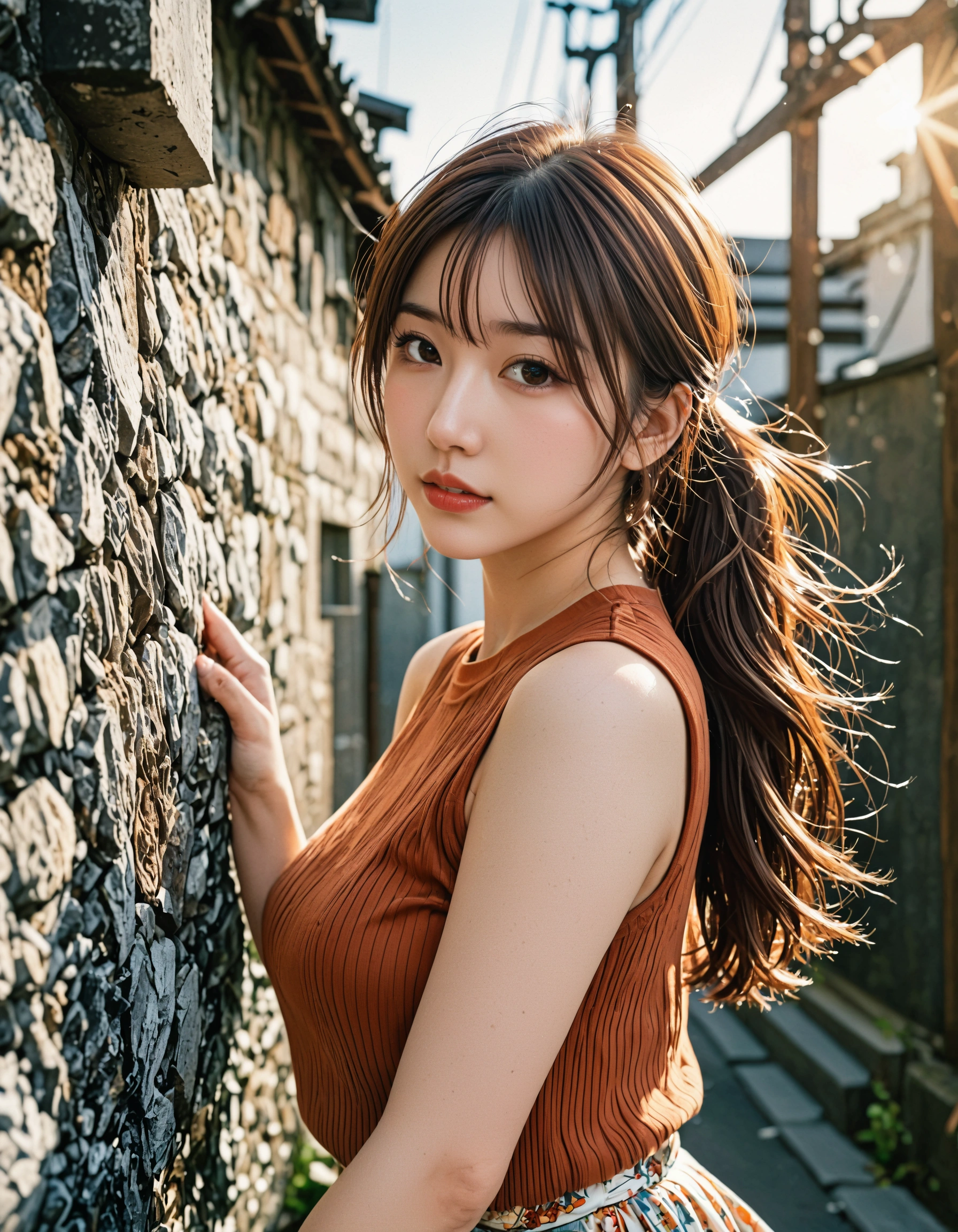 このシチュエーション、男子なら一度は憧れませんか? 古い街並み、ゴツゴツした石垣、そして夏の日差し。 そんなレトロな雰囲気の中に佇む、テラコッタ色のノースリーブニットを着た彼女。
