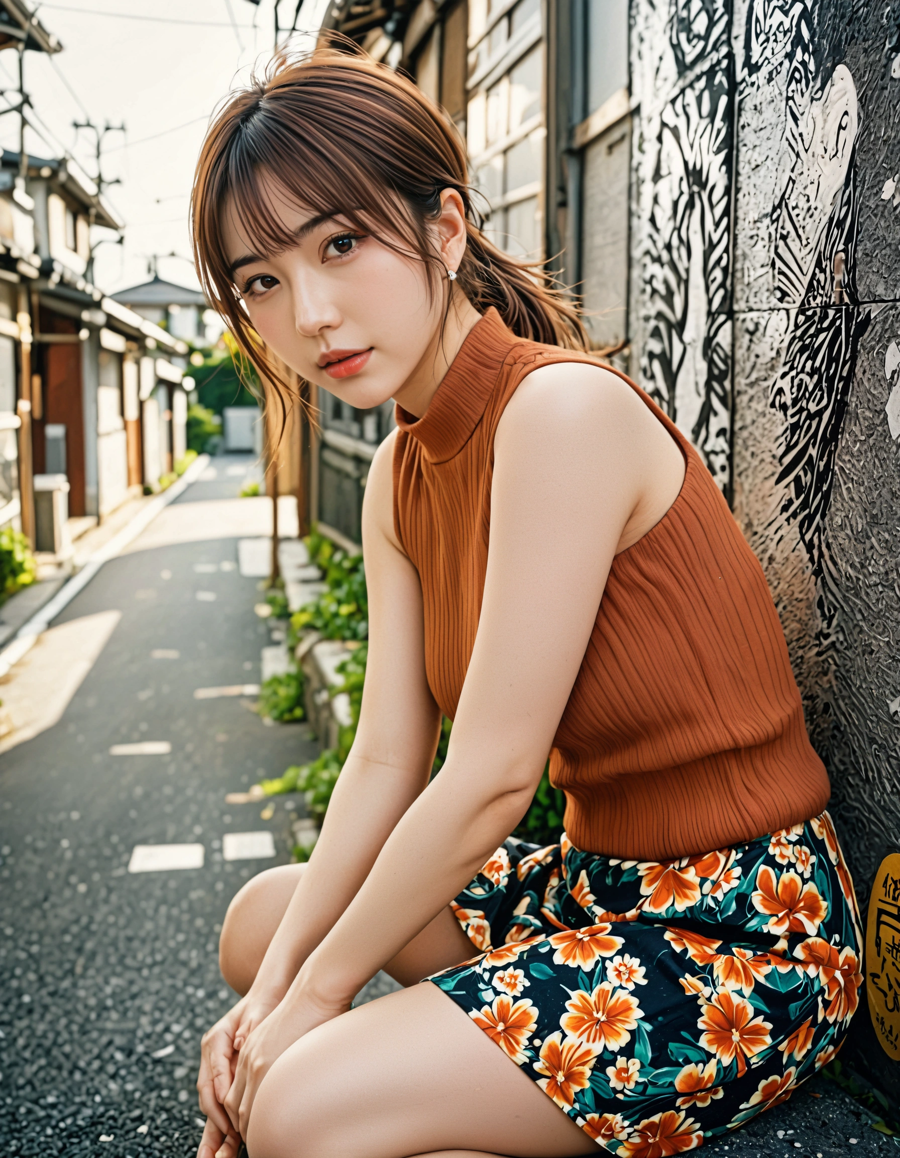 ふと迷い込んだ路地裏で、「ねえ、こっちだよ」なんて振り返られたような、二人きりの距離感がたまりません。 木漏れ日に照らされた髪の質感や、少し憂いを帯びたような大人っぽい表情を見ていると、まるで本当にデートしているような錯覚に陥っちゃいますよね。 体にフィットしたニットと、涼しげな花柄スカートの組み合わせも、清楚だけど程よい色気があって最高です。