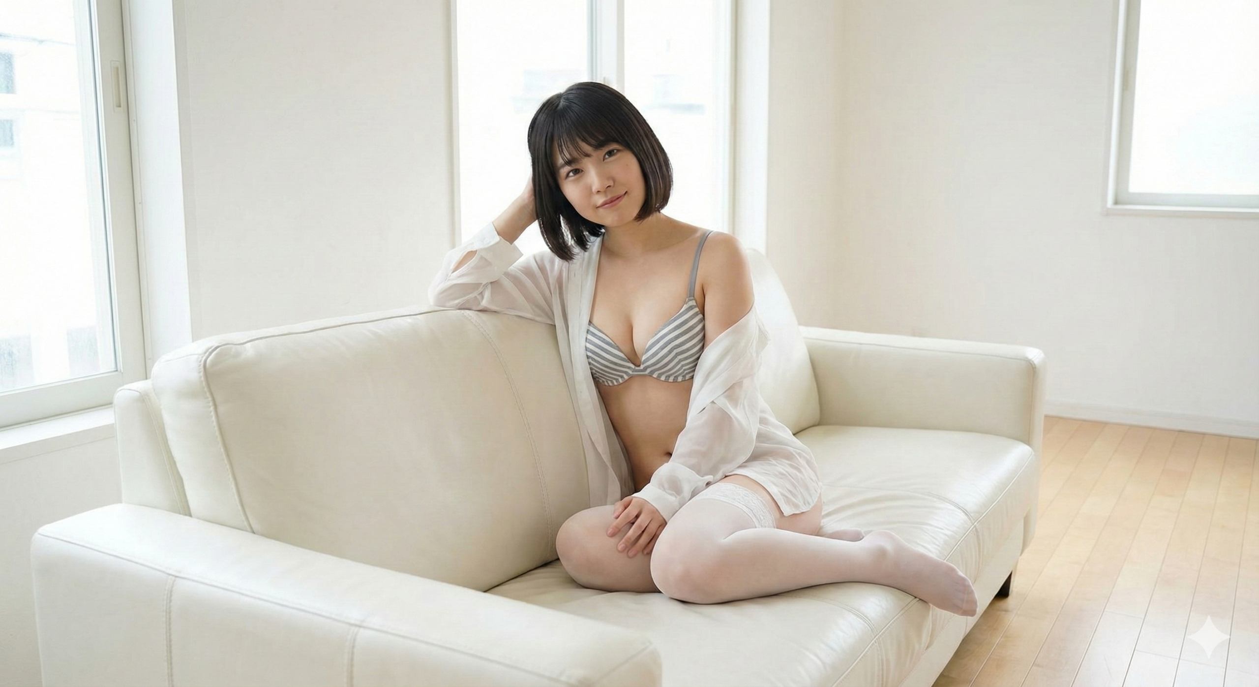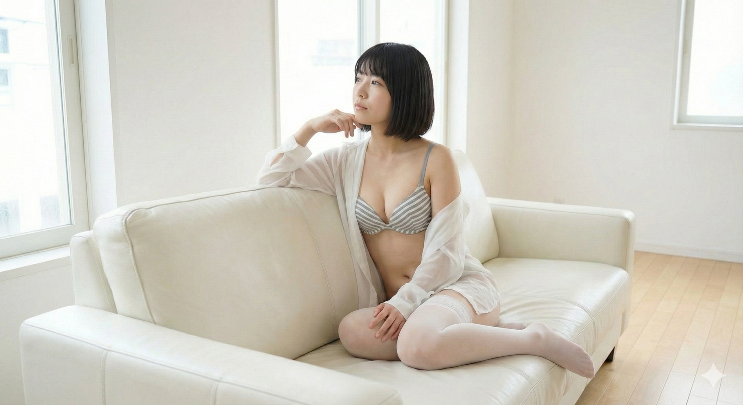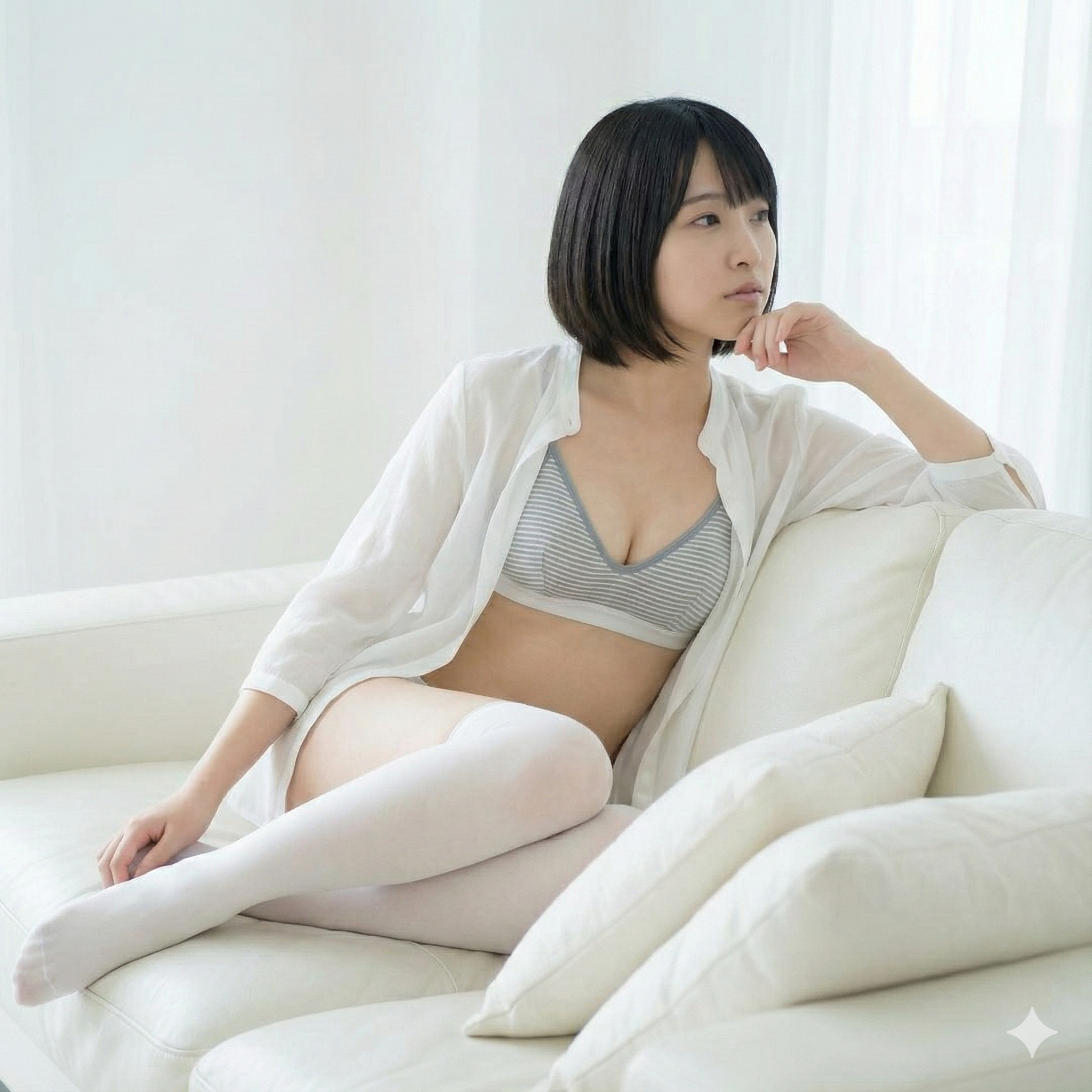 キメすぎてない自然な表情と、窓から差し込む柔らかい光が相まって、本当にそこに居るんじゃないかって錯覚するレベルですよね。白いソファでリラックスしている姿を見ているだけで、日頃の疲れがスーッと消えていく気がします。