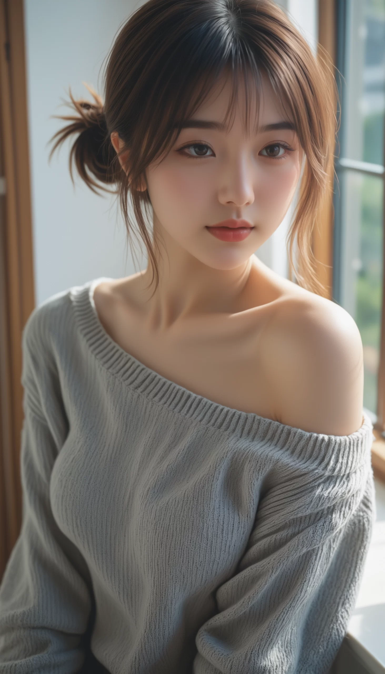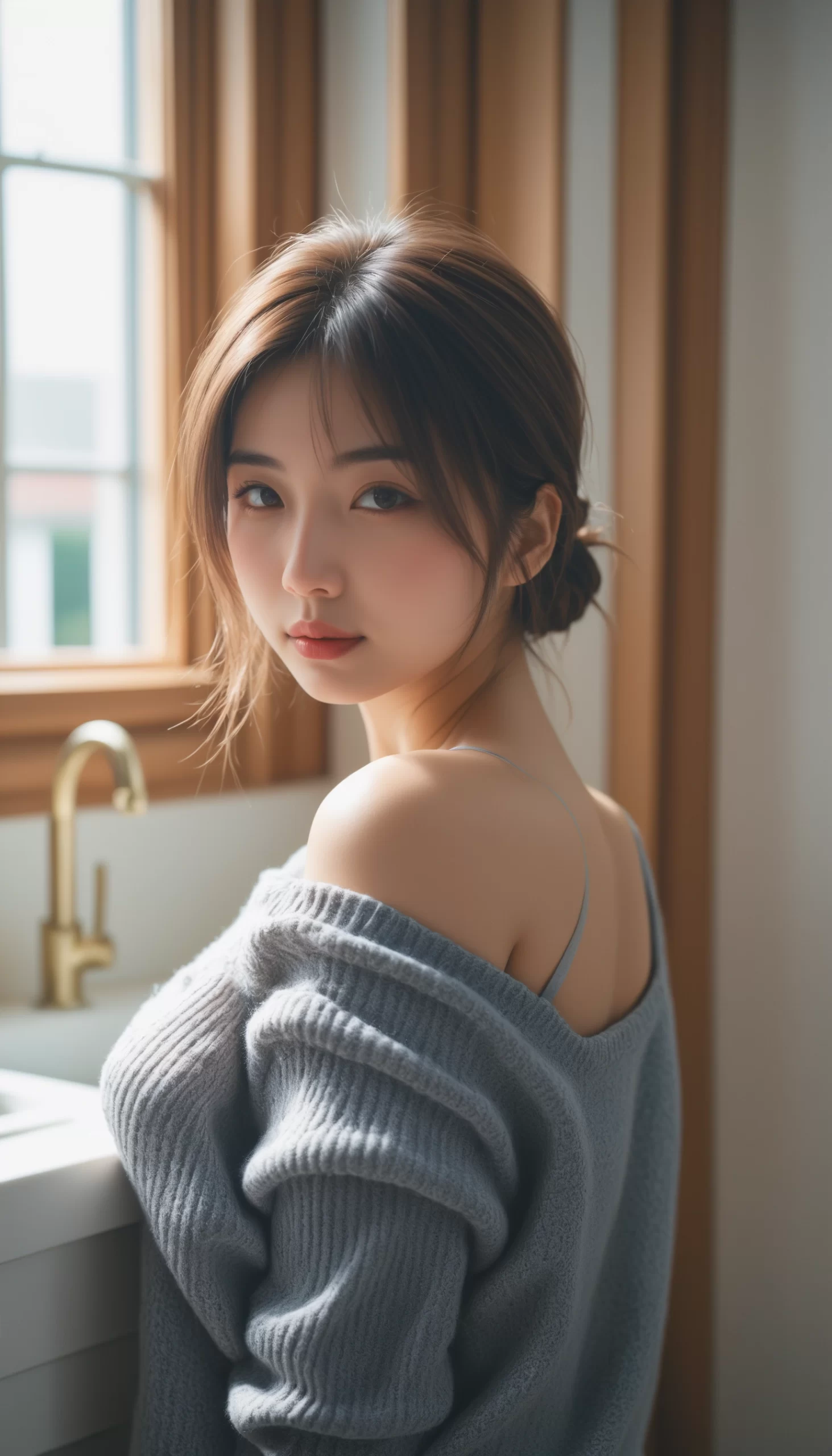 窓から差し込む自然光に照らされた表情も、飾らない日常の一コマって感じで最高にエモいよね。 バッチリ決めたキメ顔もいいけど、こういう「ふとした瞬間の柔らかい表情」に、僕ら男は弱いんだなって改めて実感しちゃう。
