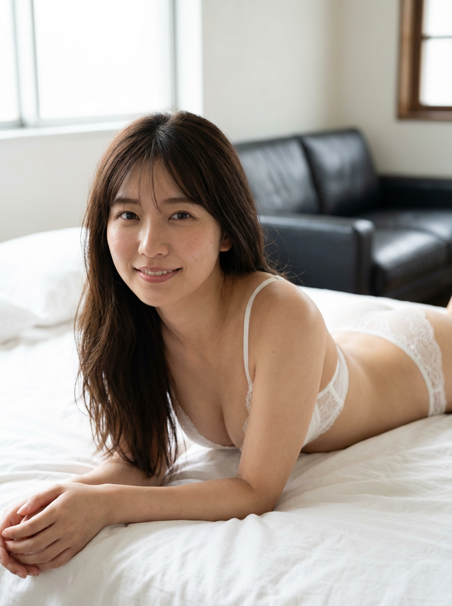 柔らかな朝の光が差し込む部屋、真っ白なシーツ、そして清楚なホワイトのランジェリー。 休日の朝、ふと目を覚ましたら隣でこんな子が「おはよう」って微笑んでくれてたら……もう、それだけで人生頑張れそうな気がしてきますよね(笑)。
