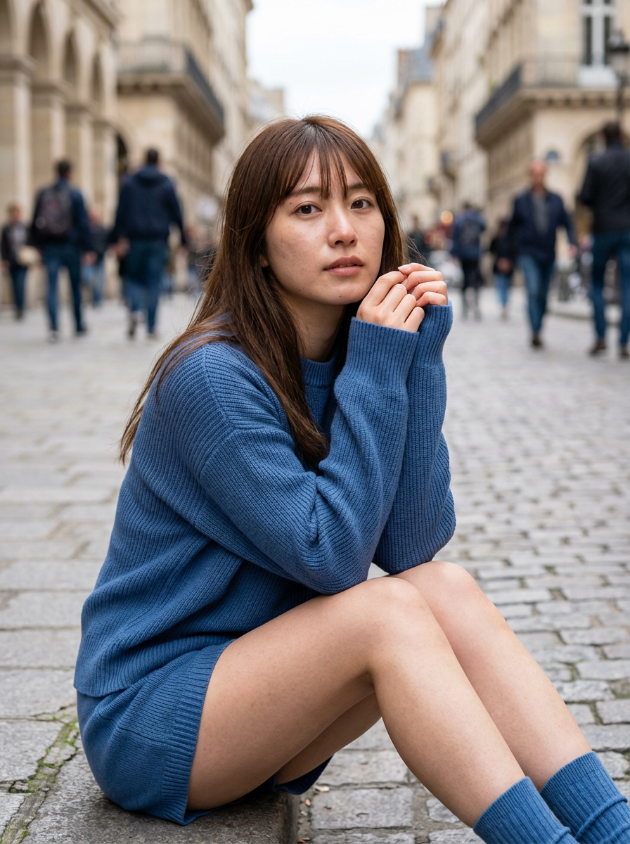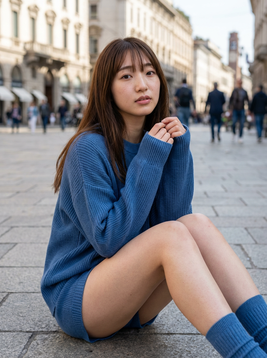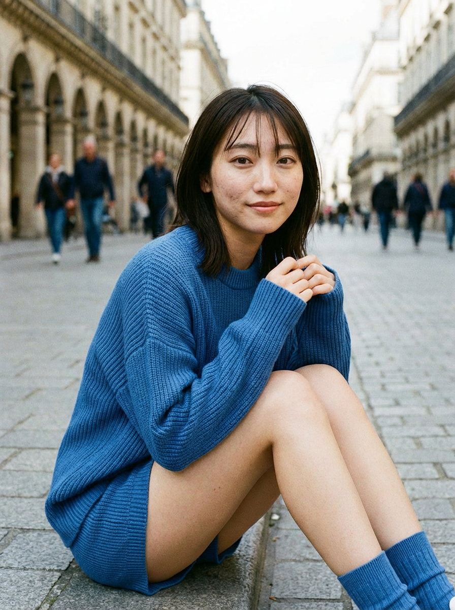 石畳の道にちょこんと座り込んで、こちらを見つめる自然な表情。まるで休日に彼女と海外旅行に来て、ふとした瞬間にシャッターを切ったような距離感がたまりません。