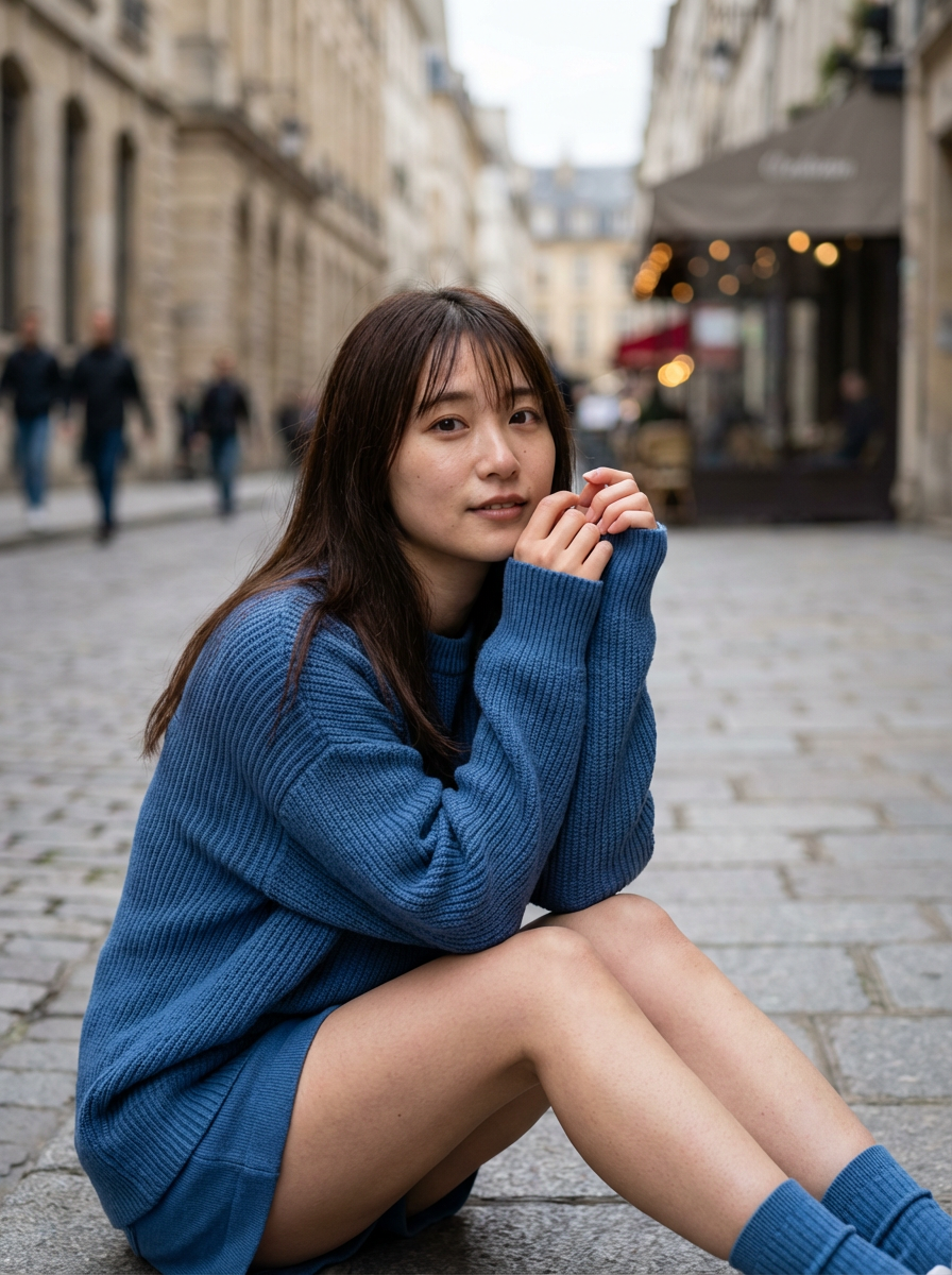 今回のテーマは、ヨーロッパ風の街並みと「鮮やかなブルーのざっくりニット」。 この組み合わせ、最強じゃないですか?