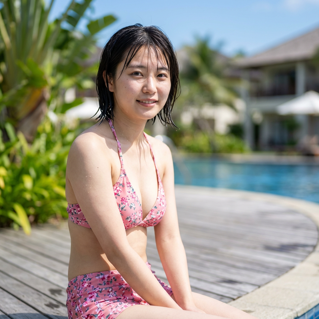 そして、個人的な推しポイントは「濡れ髪」の質感です。 プールでひと泳ぎした後なんでしょうか、少し乱れた黒髪が濡れて束になっている感じや、肌に残る水滴の描写がリアルすぎて、思わずドキッとしてしまいます。 日差しを浴びてキラキラ輝く肌と、少し火照ったような表情を見ていると、本当に目の前に彼女がいるような錯覚に陥りそうです。