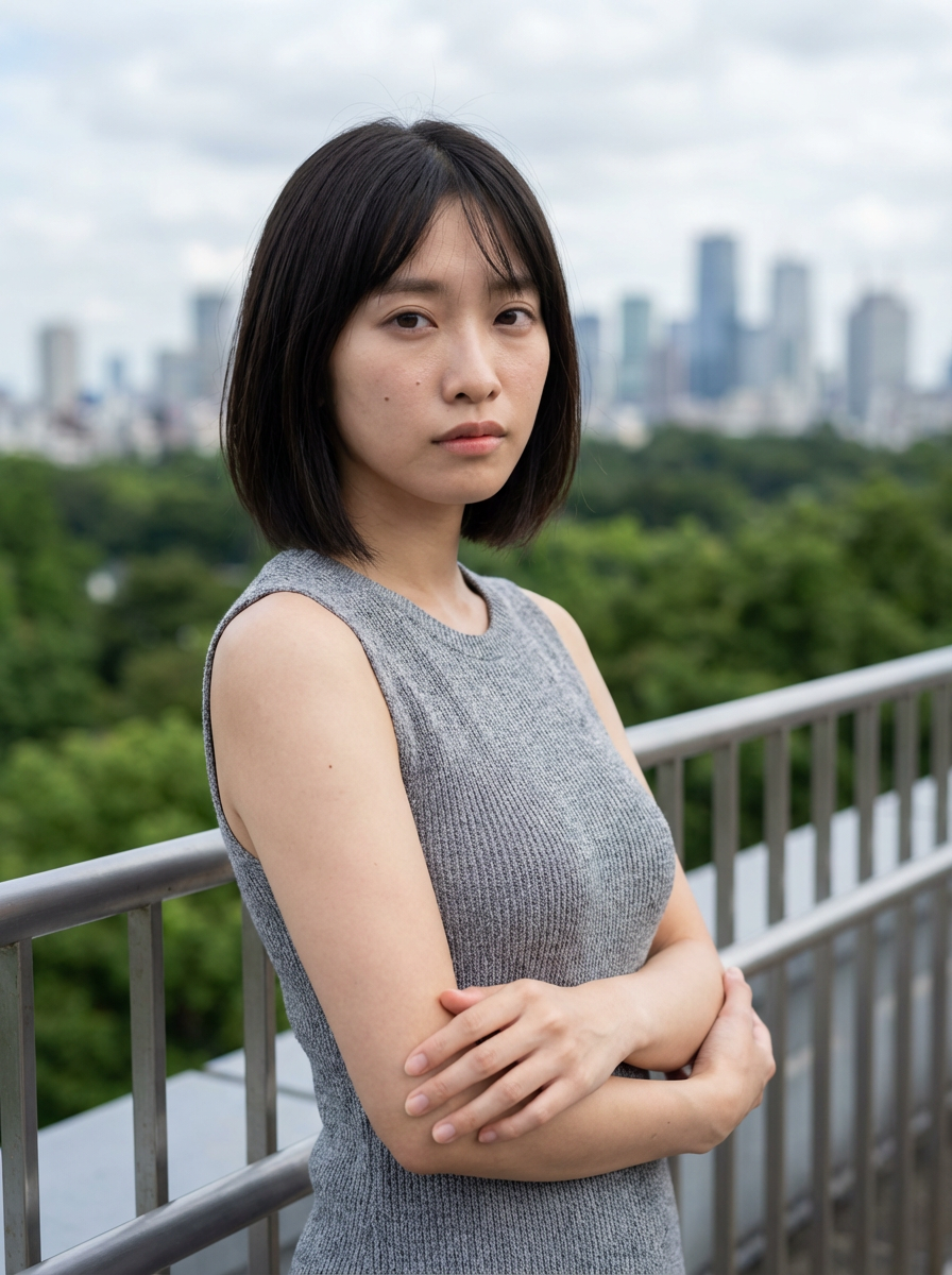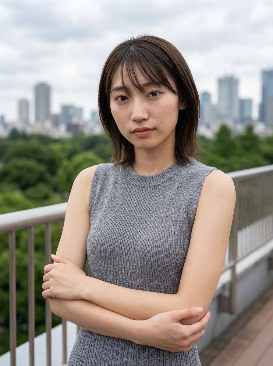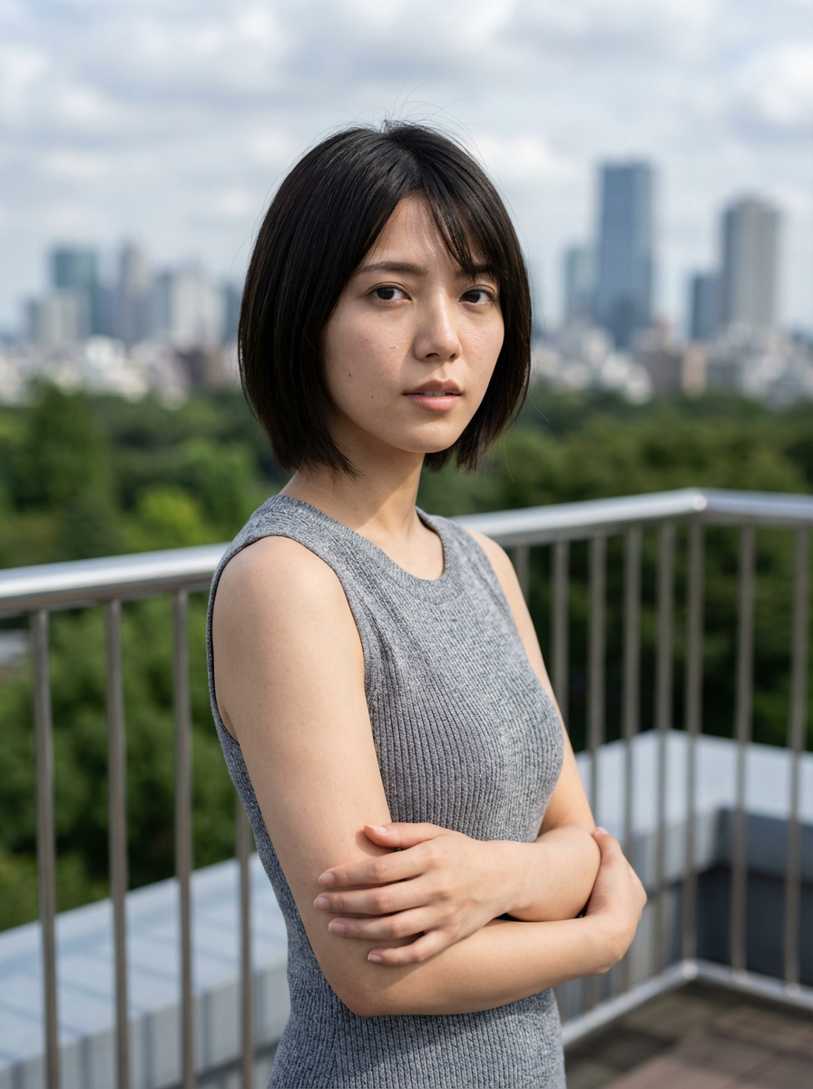 今回の舞台は、高層ビルが立ち並ぶ都会の屋上。 曇り空の柔らかな光の中で、静かにこちらを見つめるショートボブの彼女。 この**「アンニュイ」**な空気感、たまらなくない?