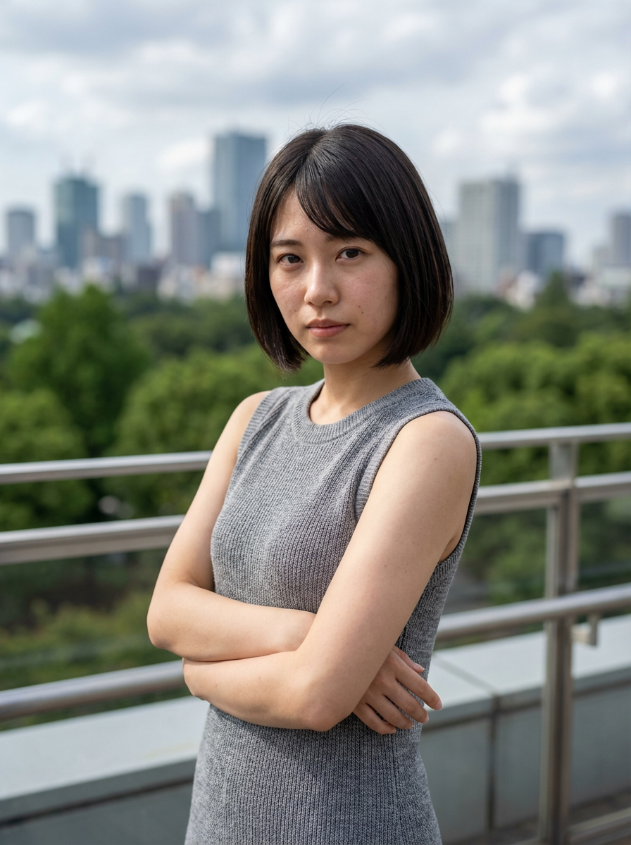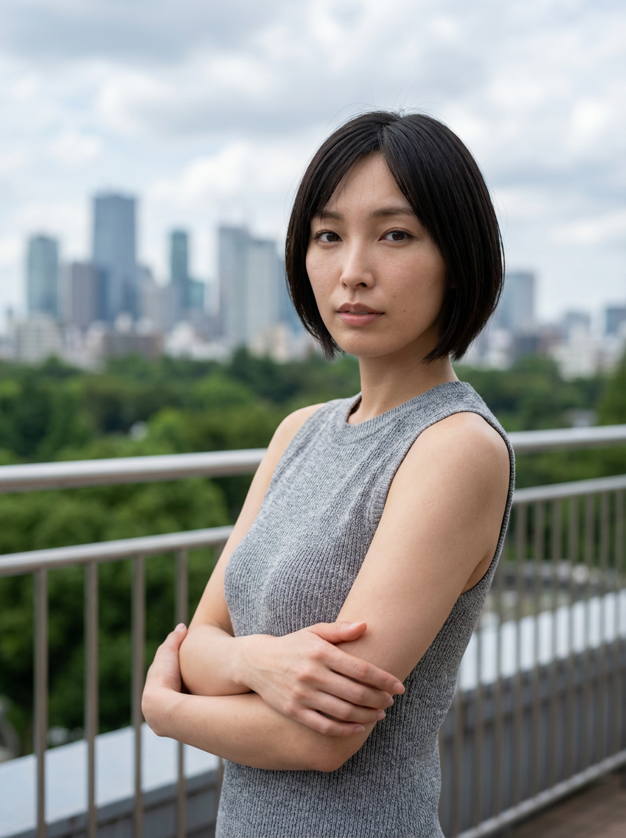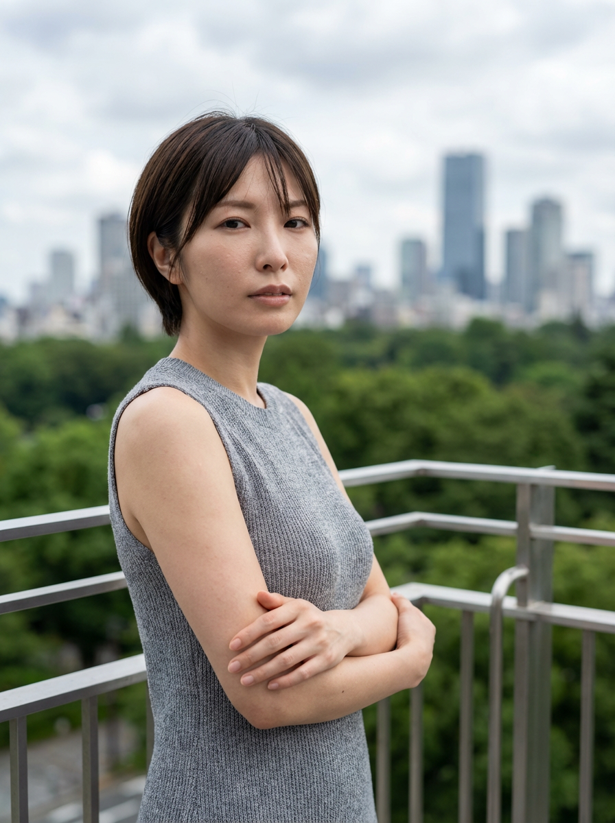 今回の舞台は、高層ビルが立ち並ぶ都会の屋上。 曇り空の柔らかな光の中で、静かにこちらを見つめるショートボブの彼女。 この**「アンニュイ」**な空気感、たまらなくない?