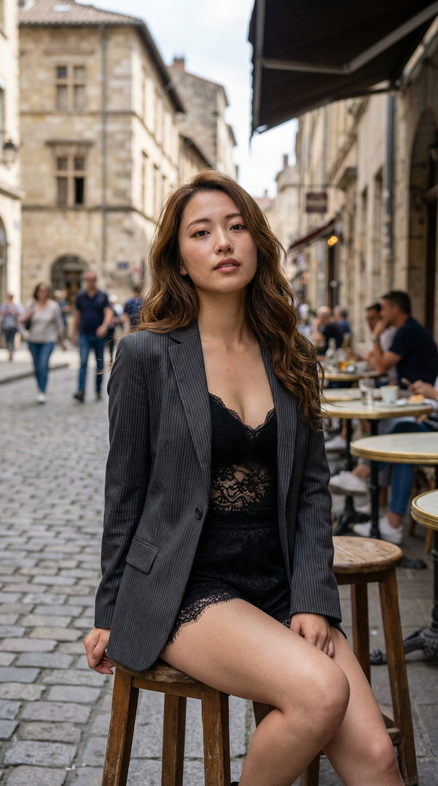 カチッとしたストライプのジャケットで「デキる女」感を出しつつ、インナーは黒レースで程よい抜け感と色気をプラス。この**「かっこいいのに色っぽい」**というギャップ、破壊力がすごくないですか?