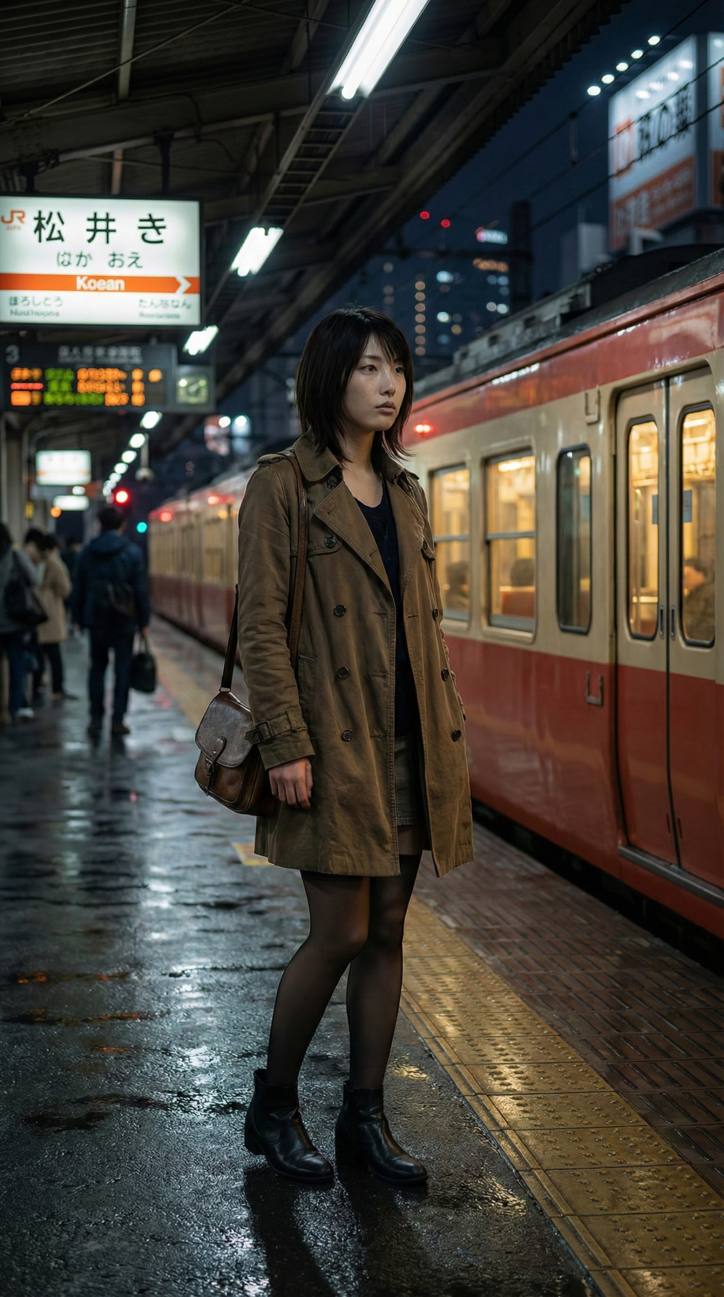 濡れた地面に反射するネオンの光、少し寂しげな表情、そして何より「トレンチコート×黒タイツ」という最強の組み合わせ…。 もう、男心を完全に理解しているとしか思えません(笑)。