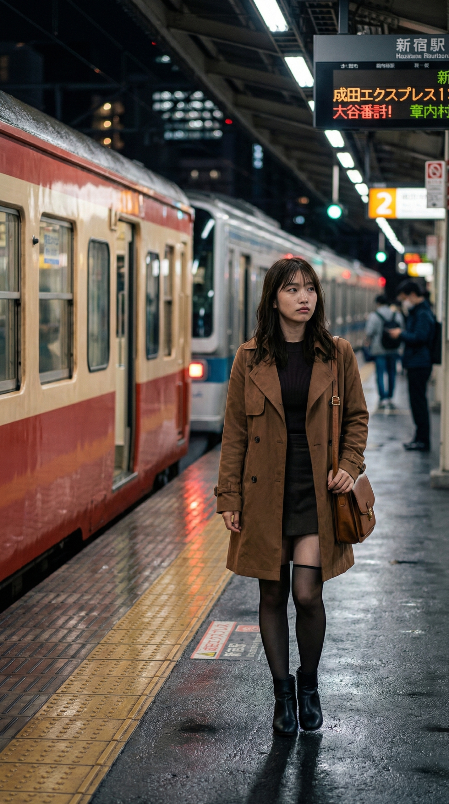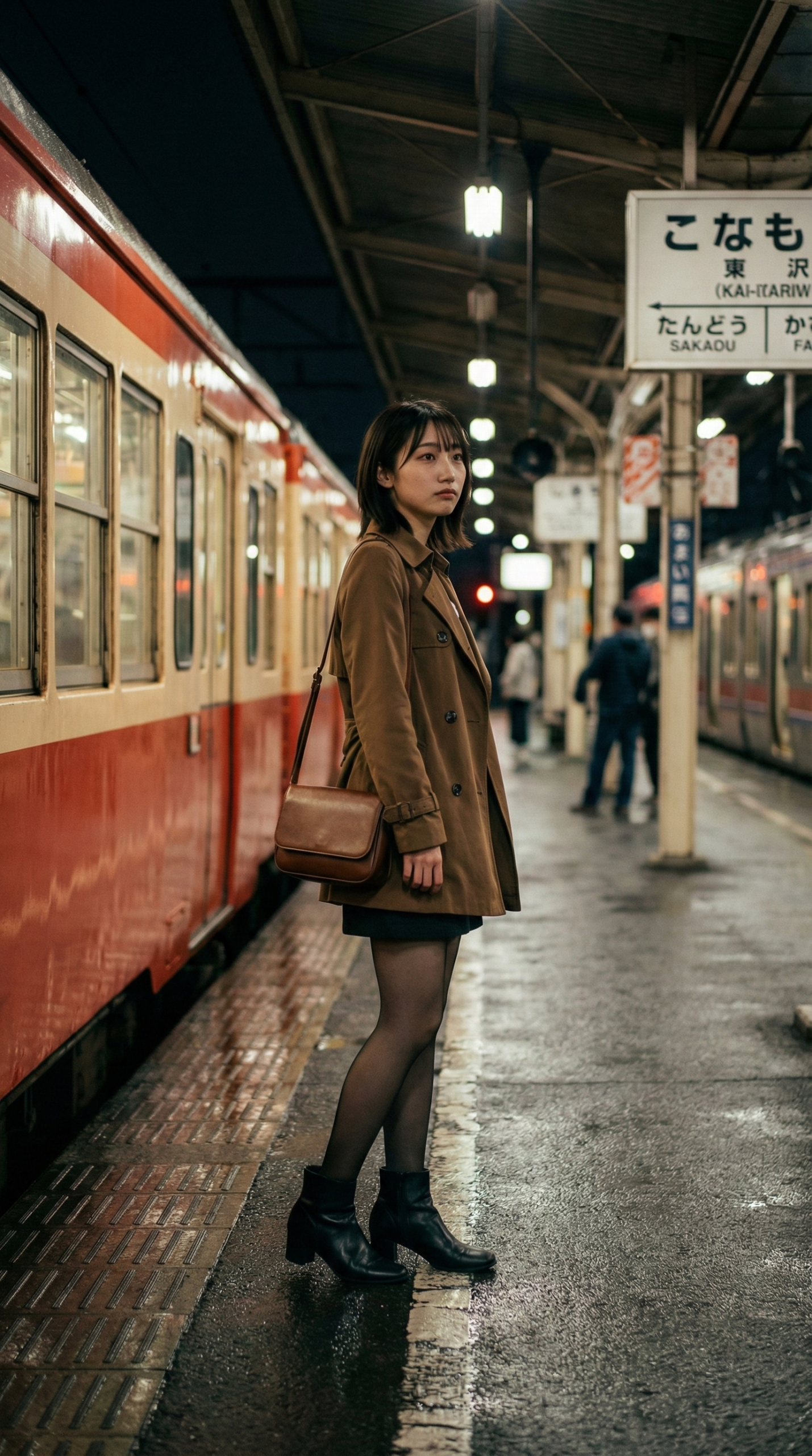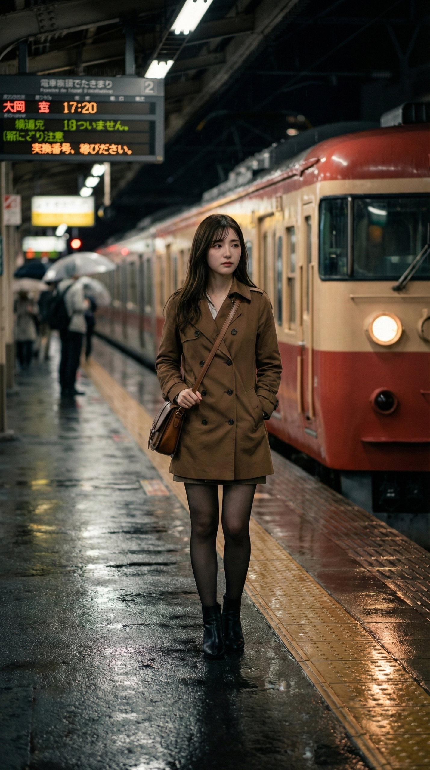 見てください、この雰囲気。 冷たい雨が降る夜のプラットホームなのに、彼女がいるだけでなんだかドラマチックな空間に見えてきませんか?