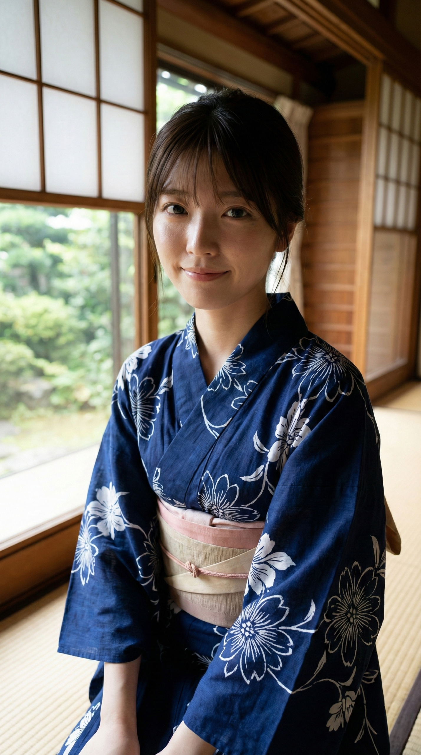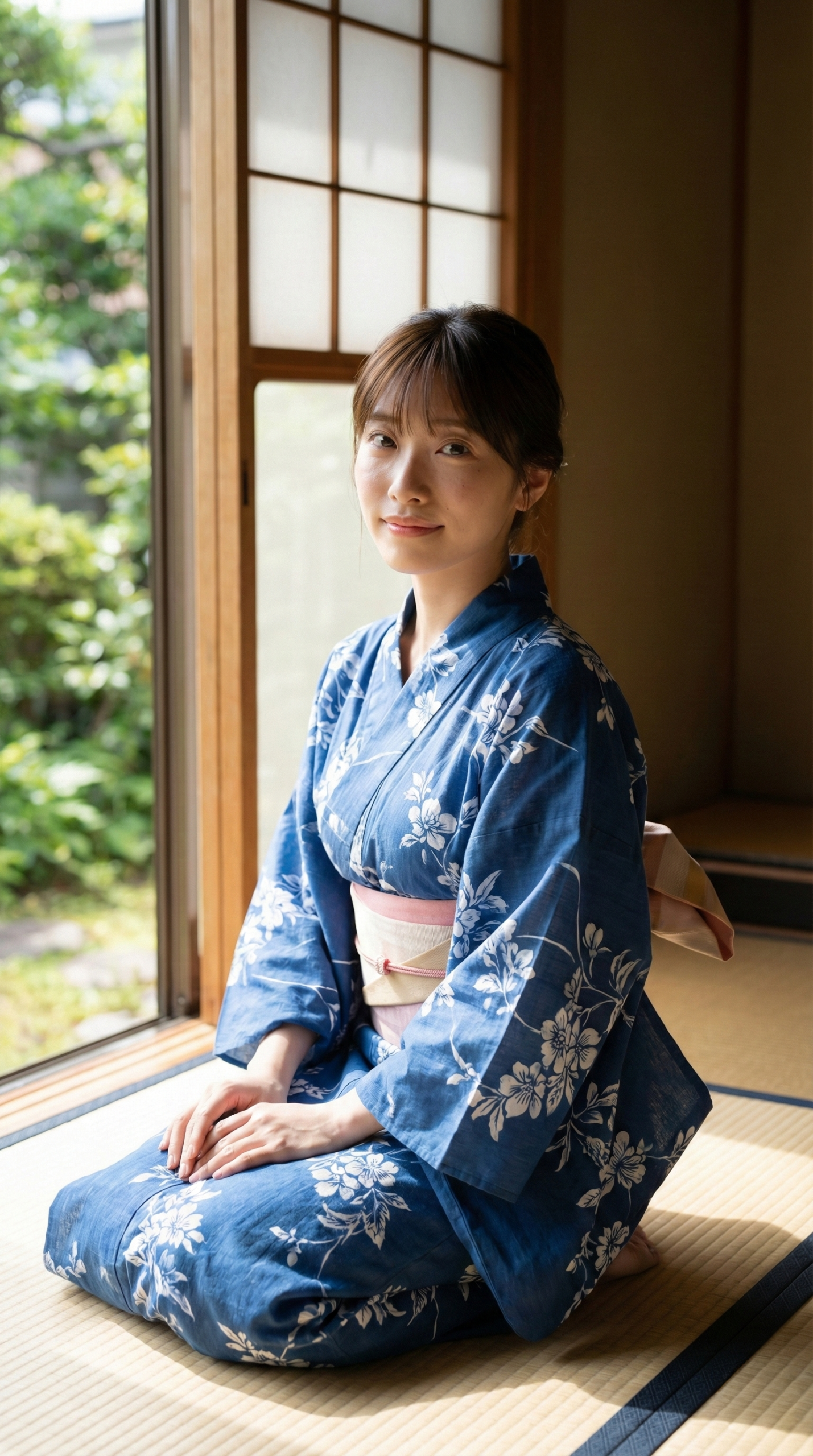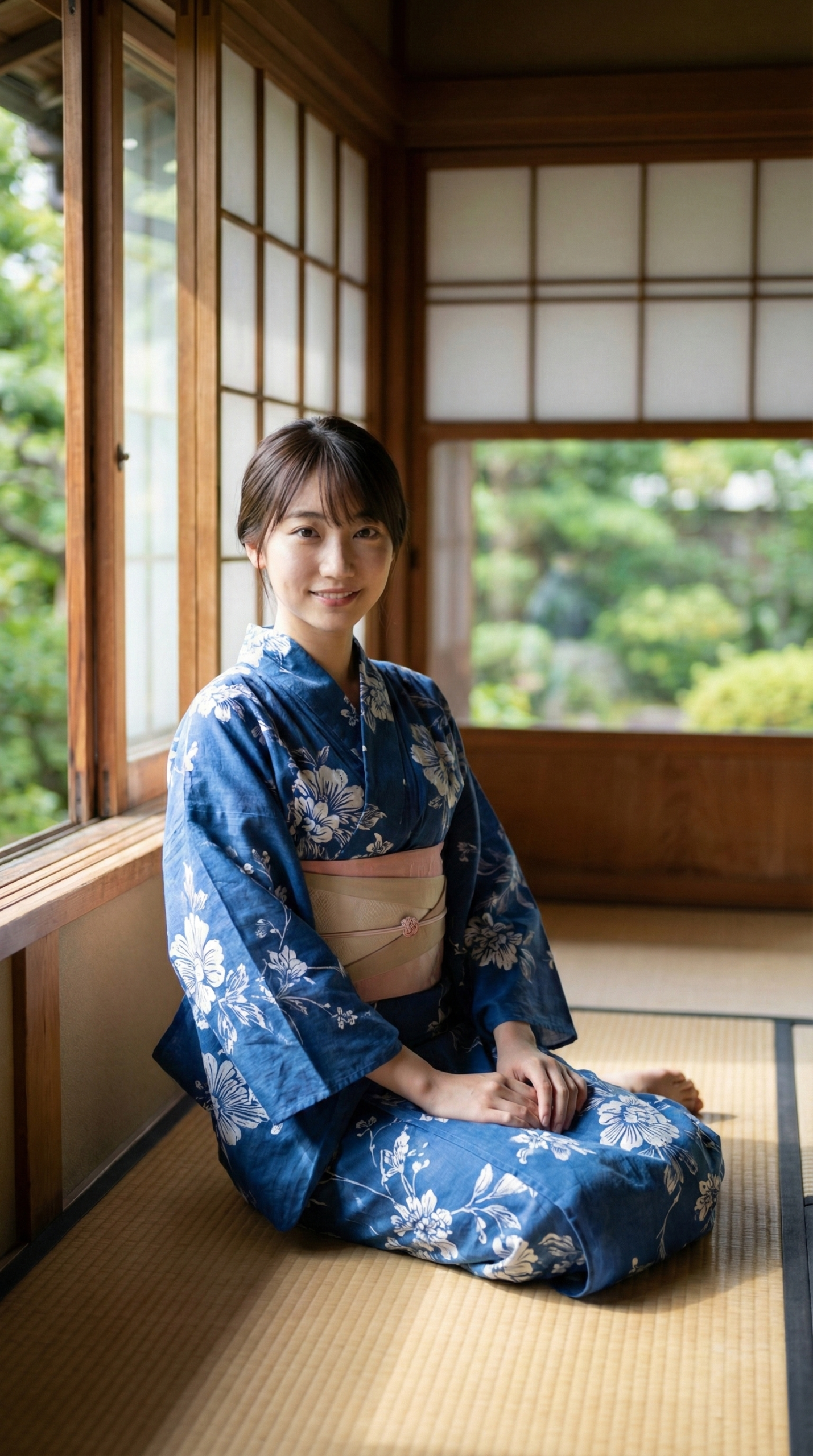 涼しげな藍色の浴衣と、背景の緑、そして畳の香りが漂ってきそうな和の空間。 窓から差し込む柔らかい光が、彼女たちの透明感をさらに引き立てています。 「ねえ、まだのんびりしてていい?」なんて声が聞こえてきそうな、絶妙な表情にも注目してください。