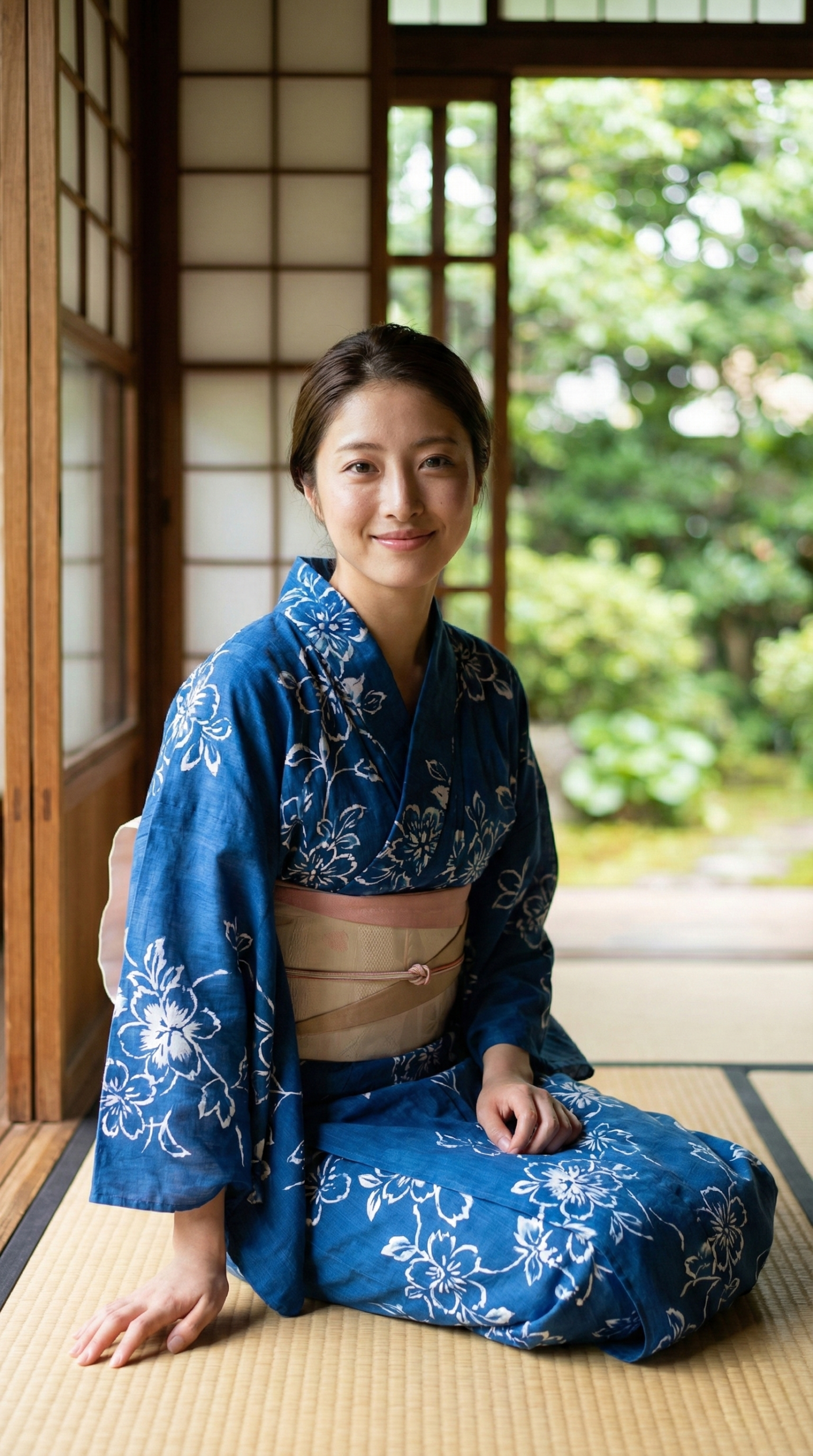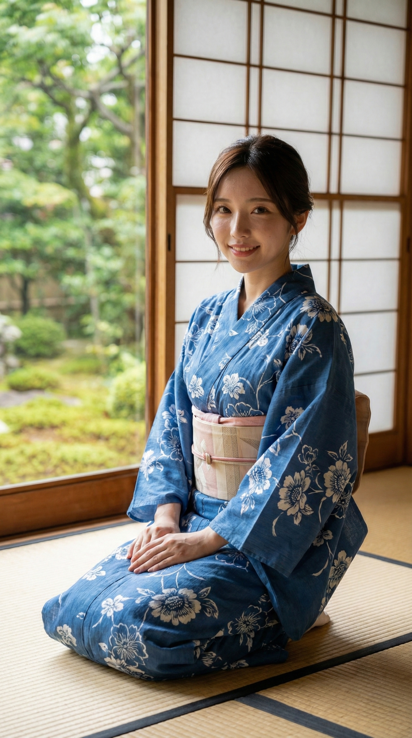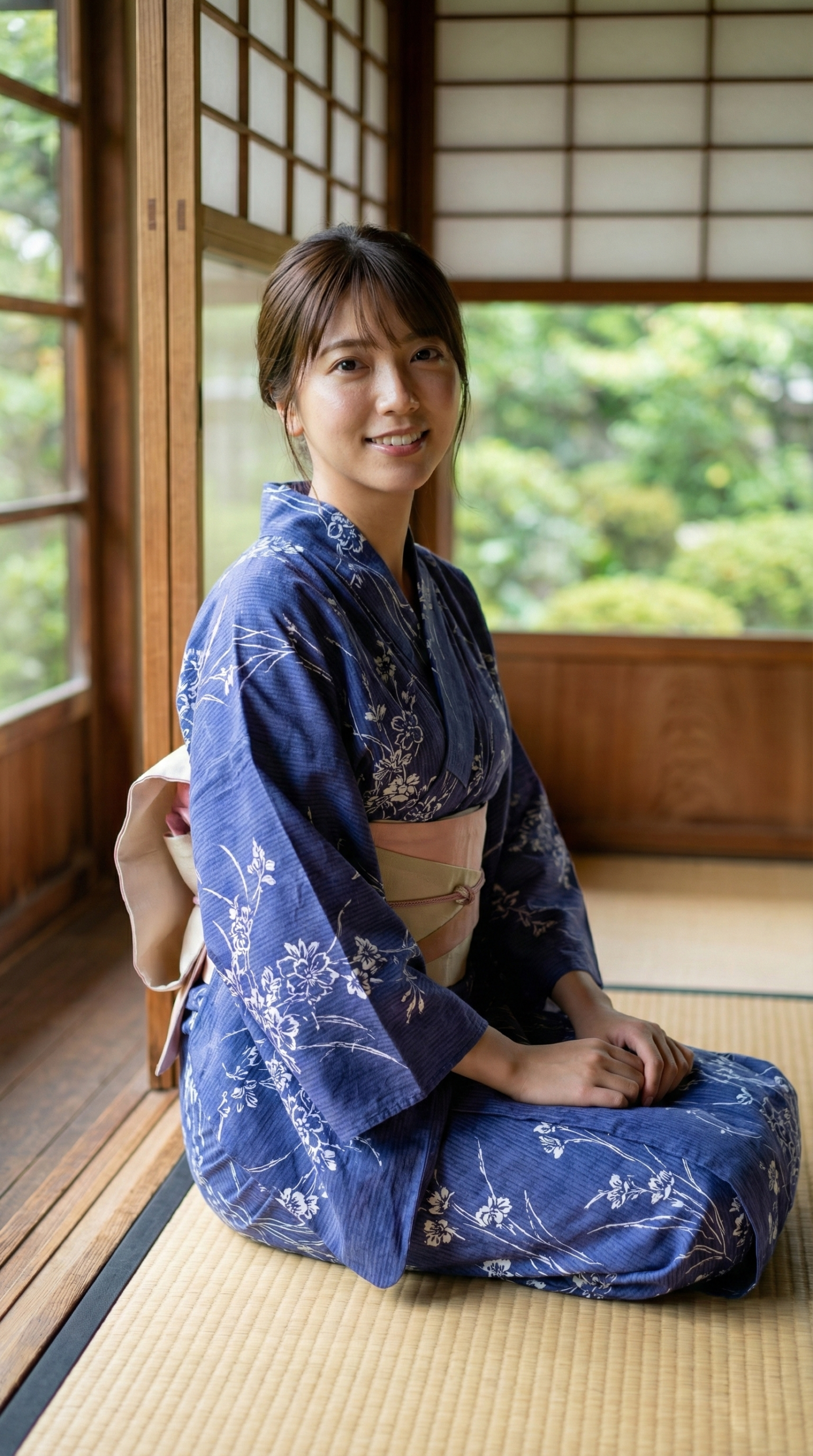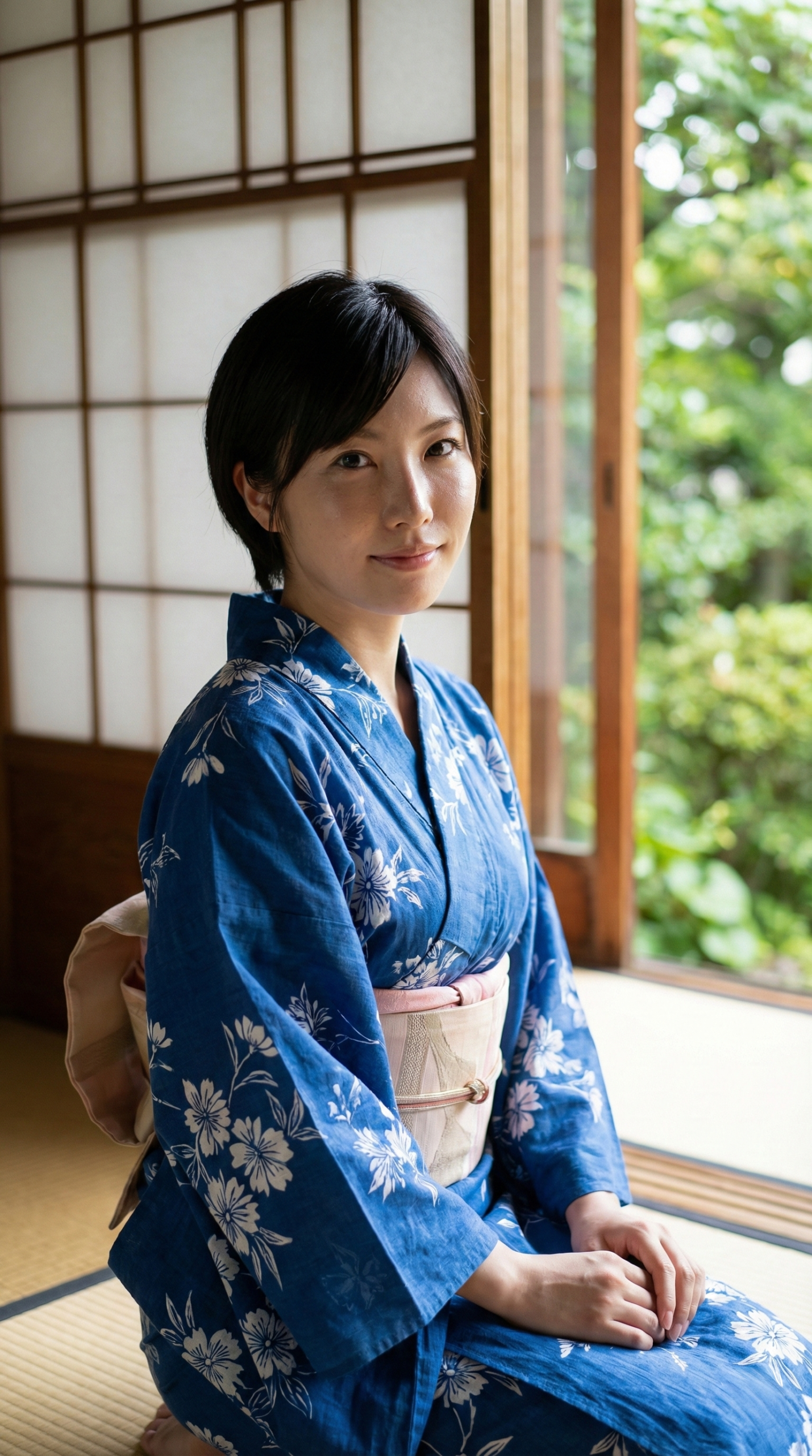 涼しげな藍色の浴衣と、背景の緑、そして畳の香りが漂ってきそうな和の空間。 窓から差し込む柔らかい光が、彼女たちの透明感をさらに引き立てています。 「ねえ、まだのんびりしてていい?」なんて声が聞こえてきそうな、絶妙な表情にも注目してください。