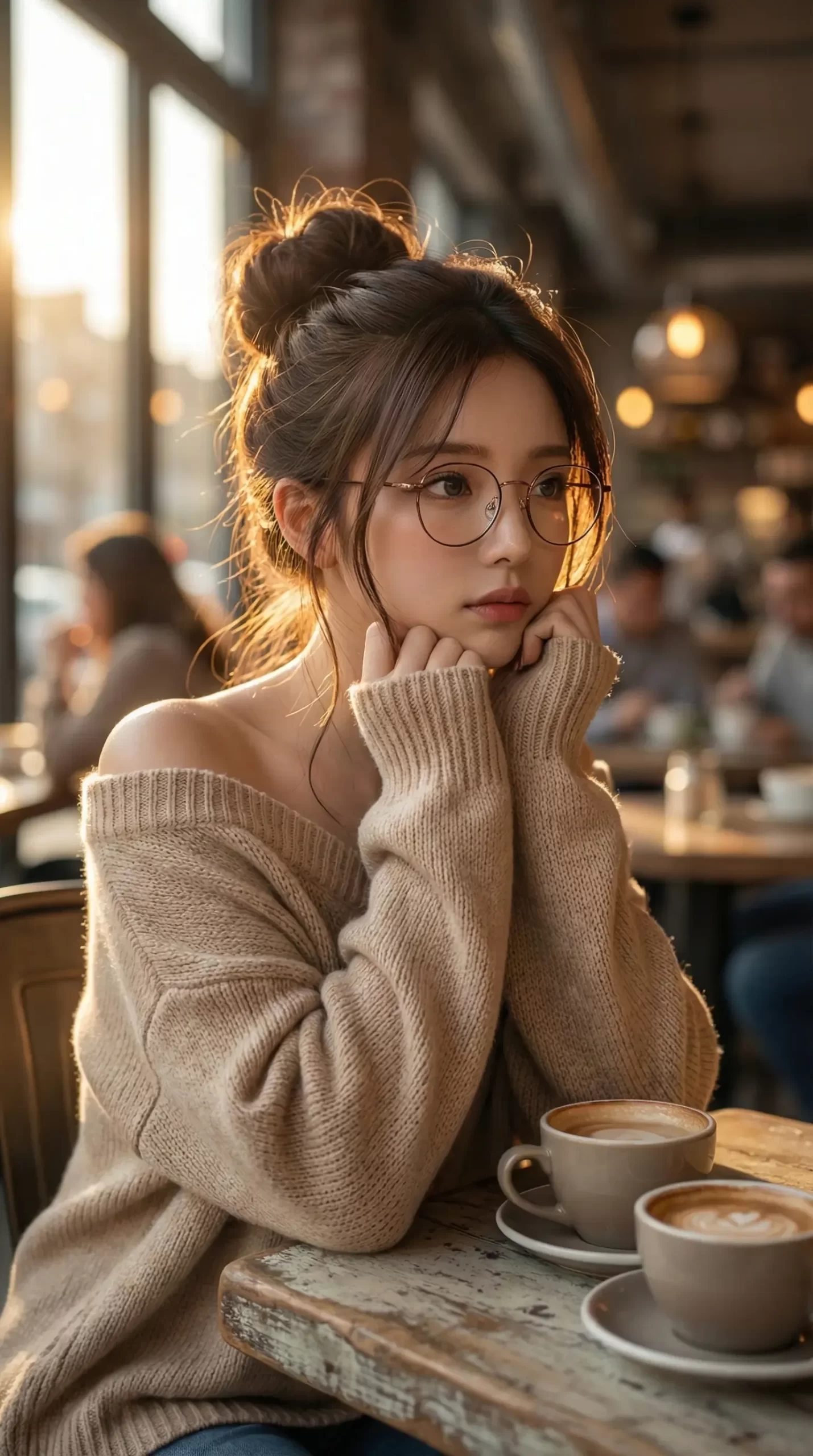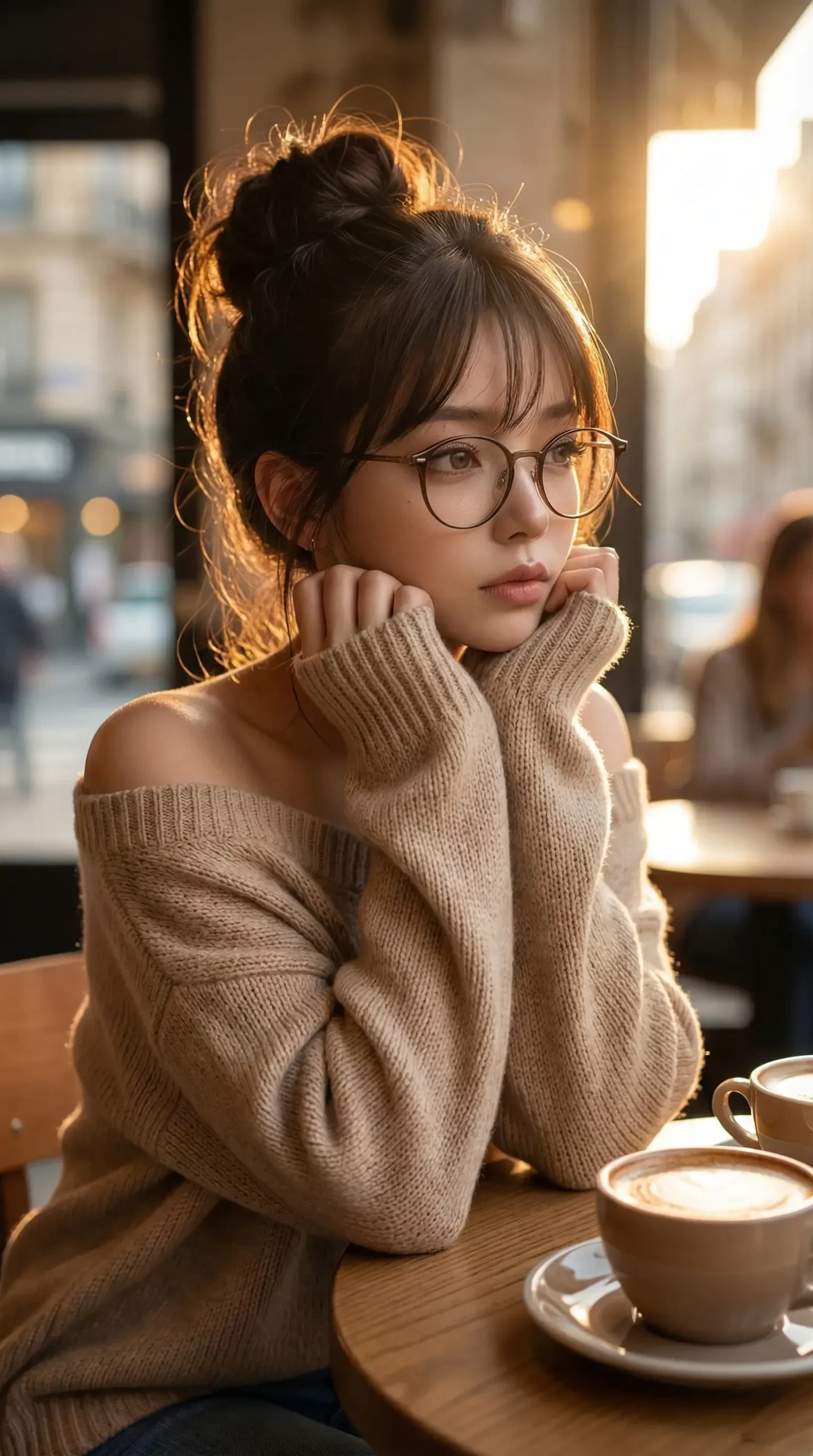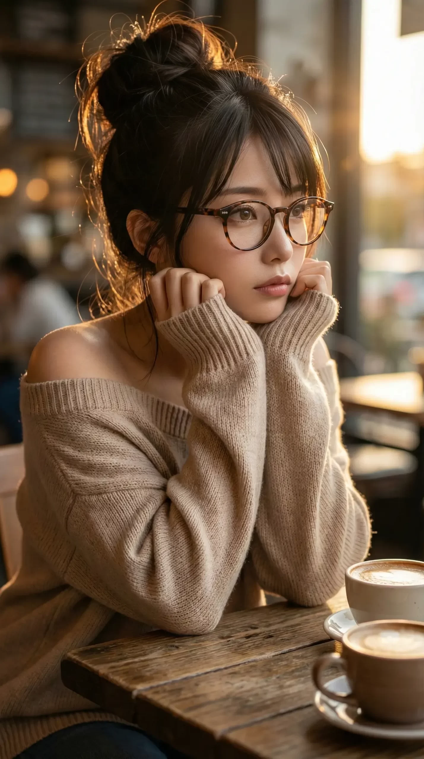 見てください、このあふれ出る彼女感。 西日が差し込む窓際の席で、ちょっとアンニュイな表情を浮かべるAI美女。このシチュエーションだけで、もうご飯3杯はいけそうですよね(笑)。