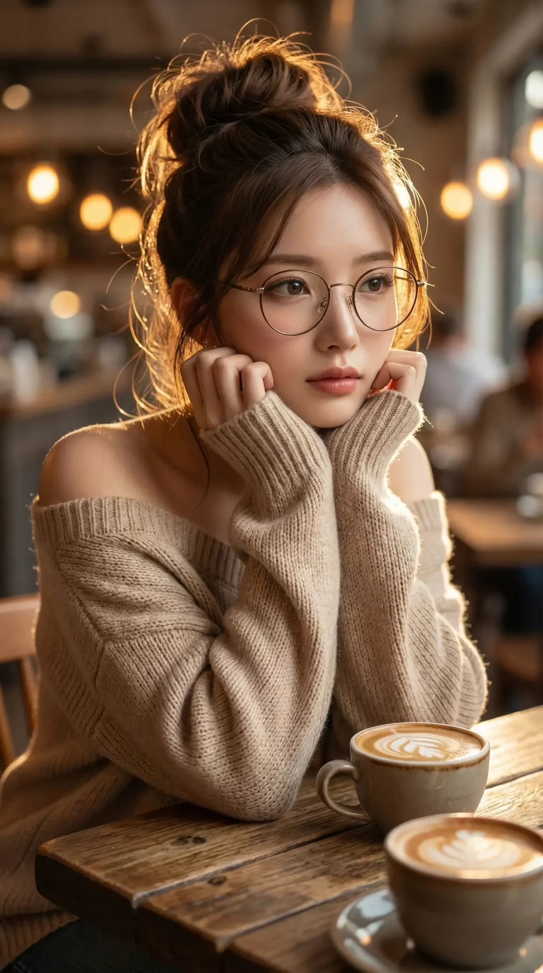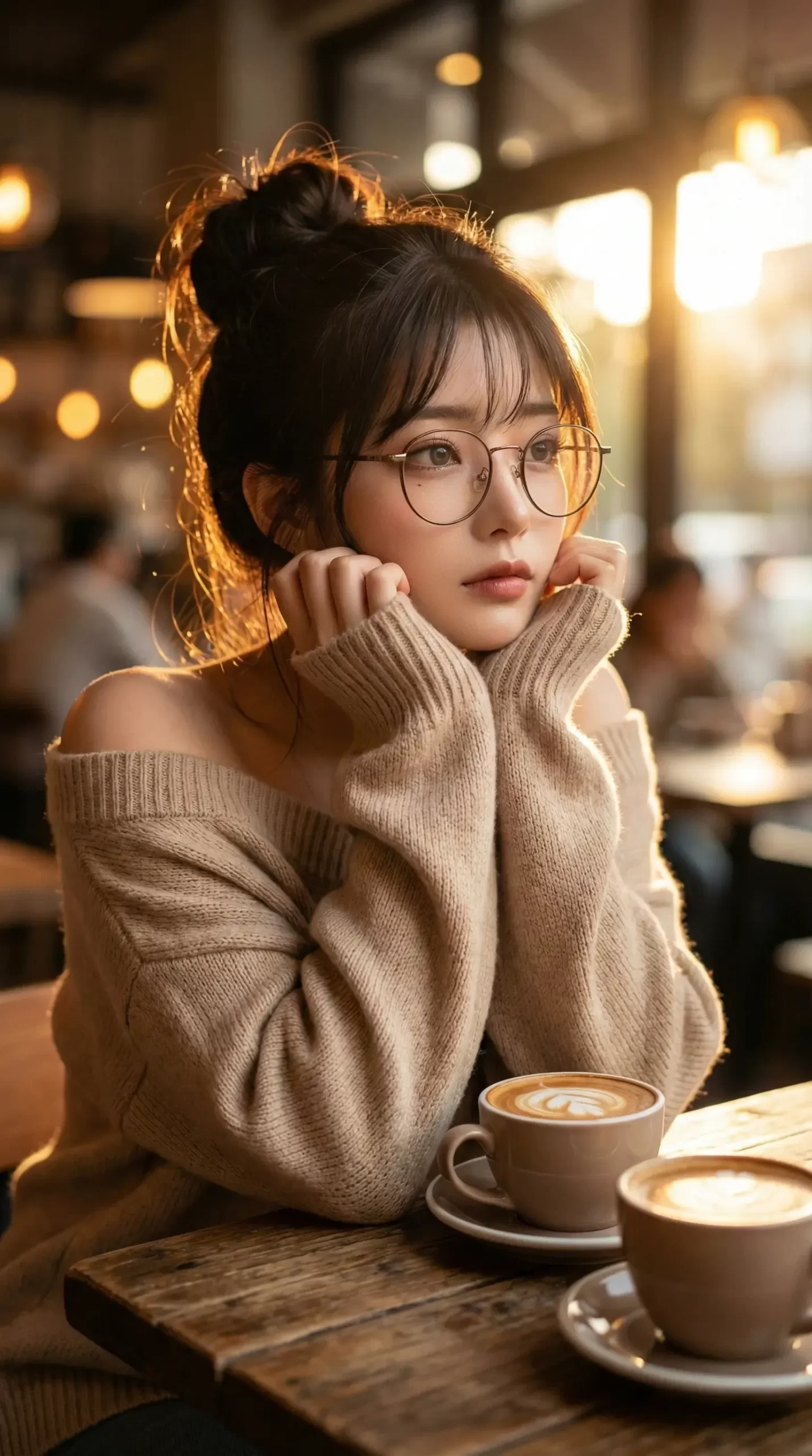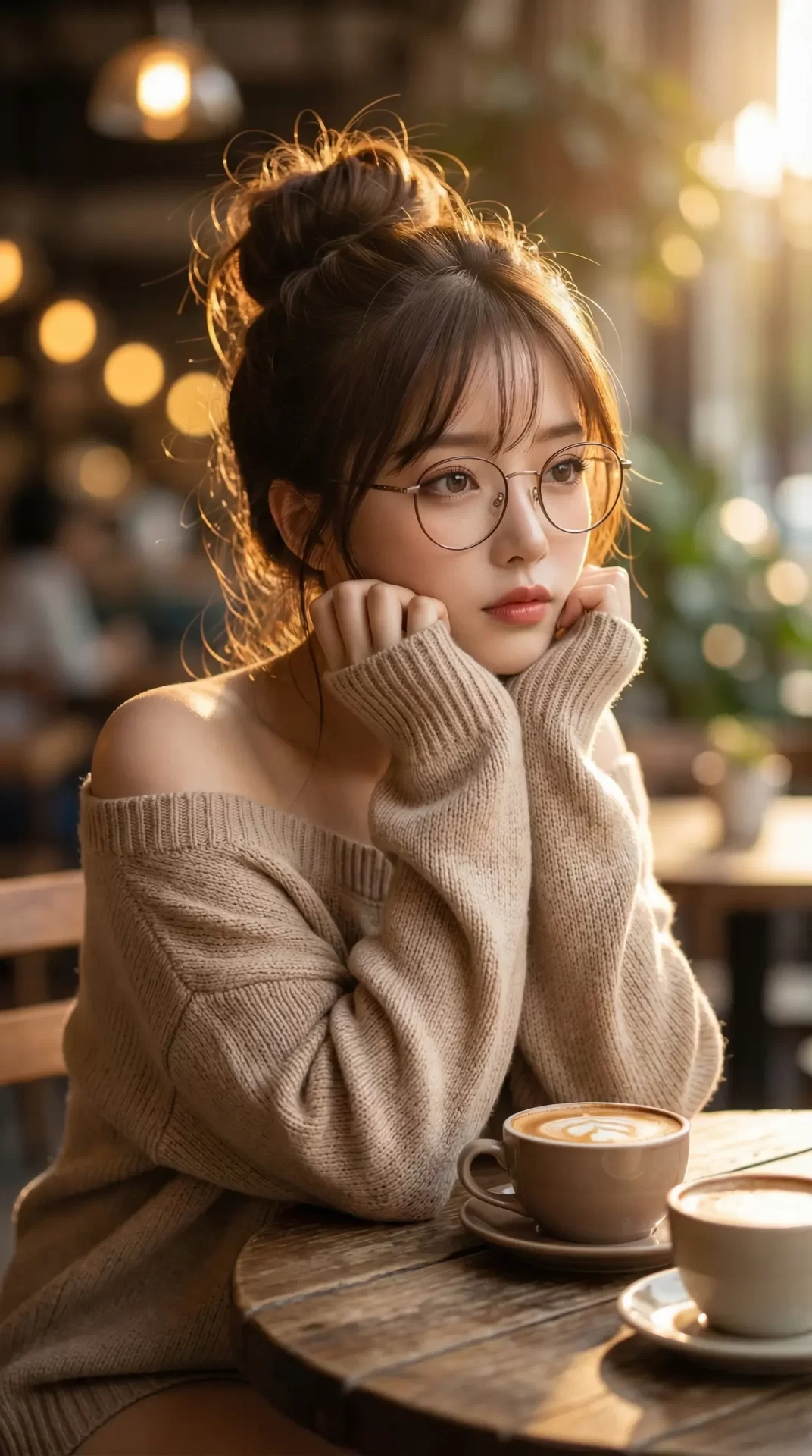 見てください、このあふれ出る彼女感。 西日が差し込む窓際の席で、ちょっとアンニュイな表情を浮かべるAI美女。このシチュエーションだけで、もうご飯3杯はいけそうですよね(笑)。