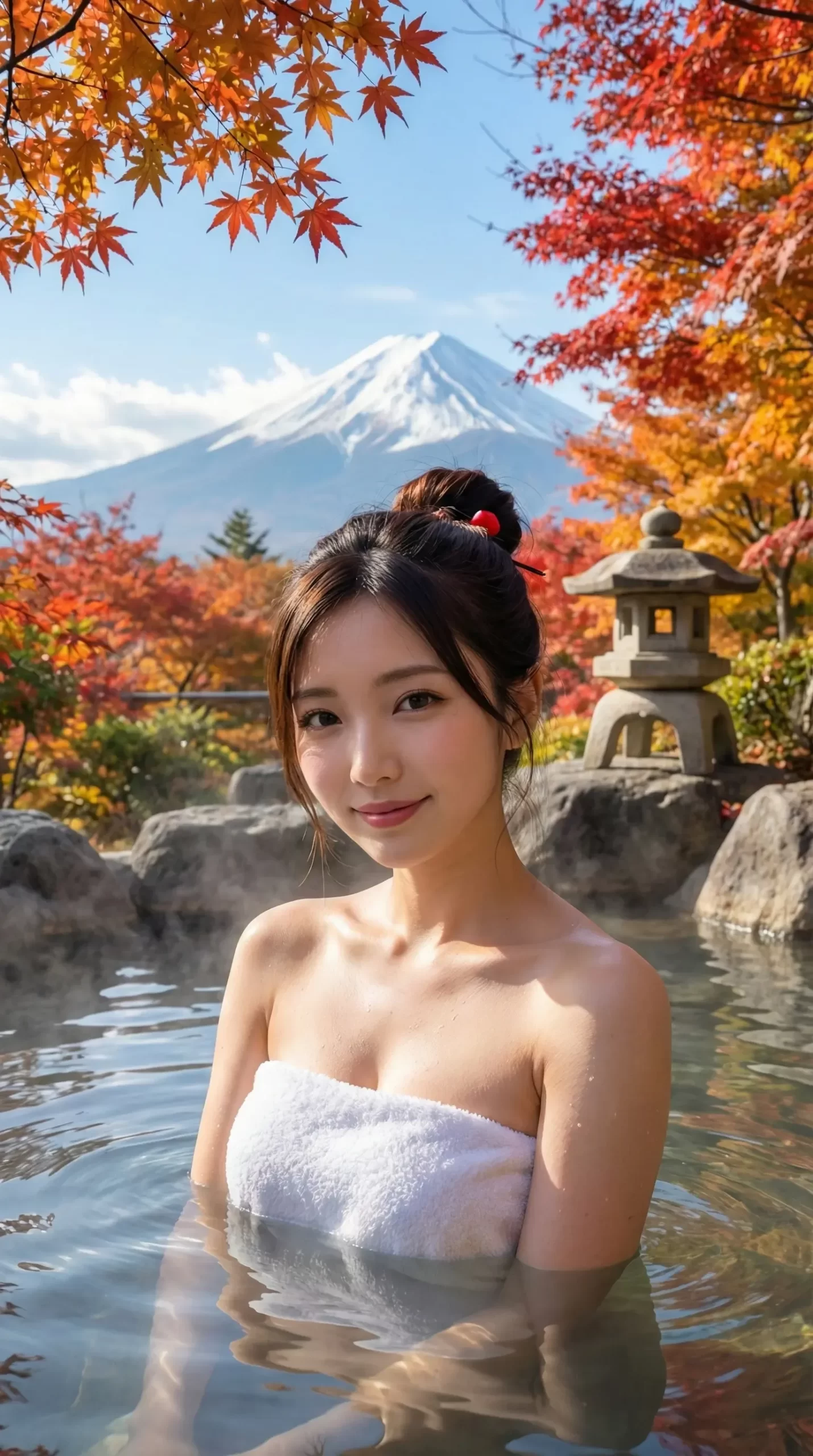 見てください、このロケーション! バックには壮大な富士山、そして鮮やかに色づいた紅葉。日本の秋の美しさが詰まった最高の露天風呂です。