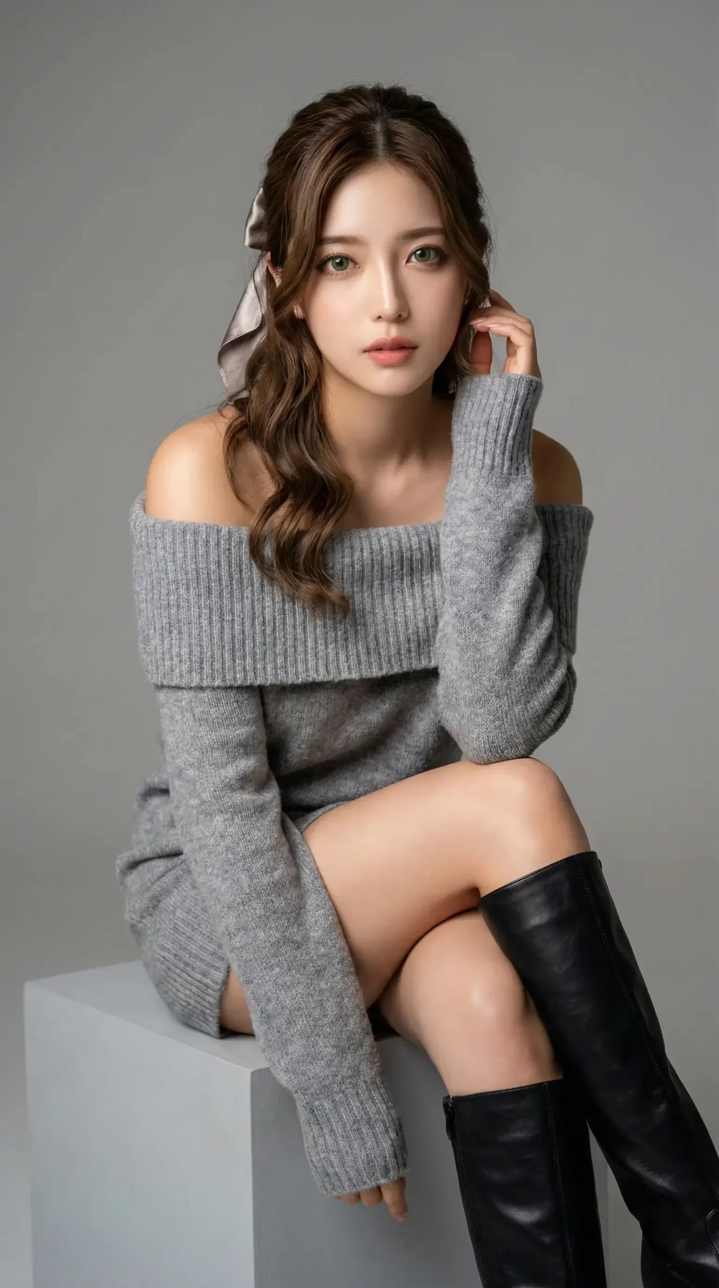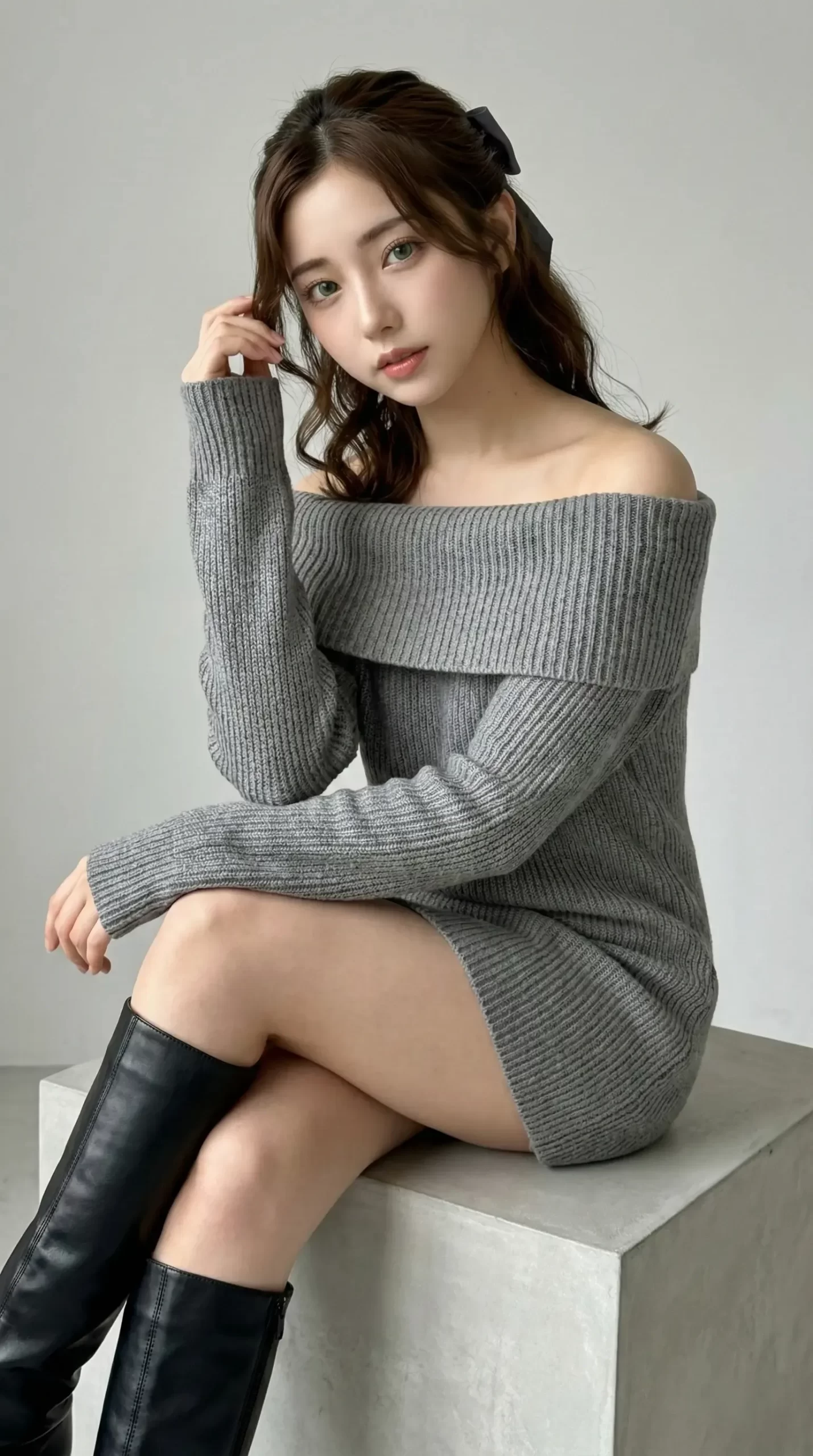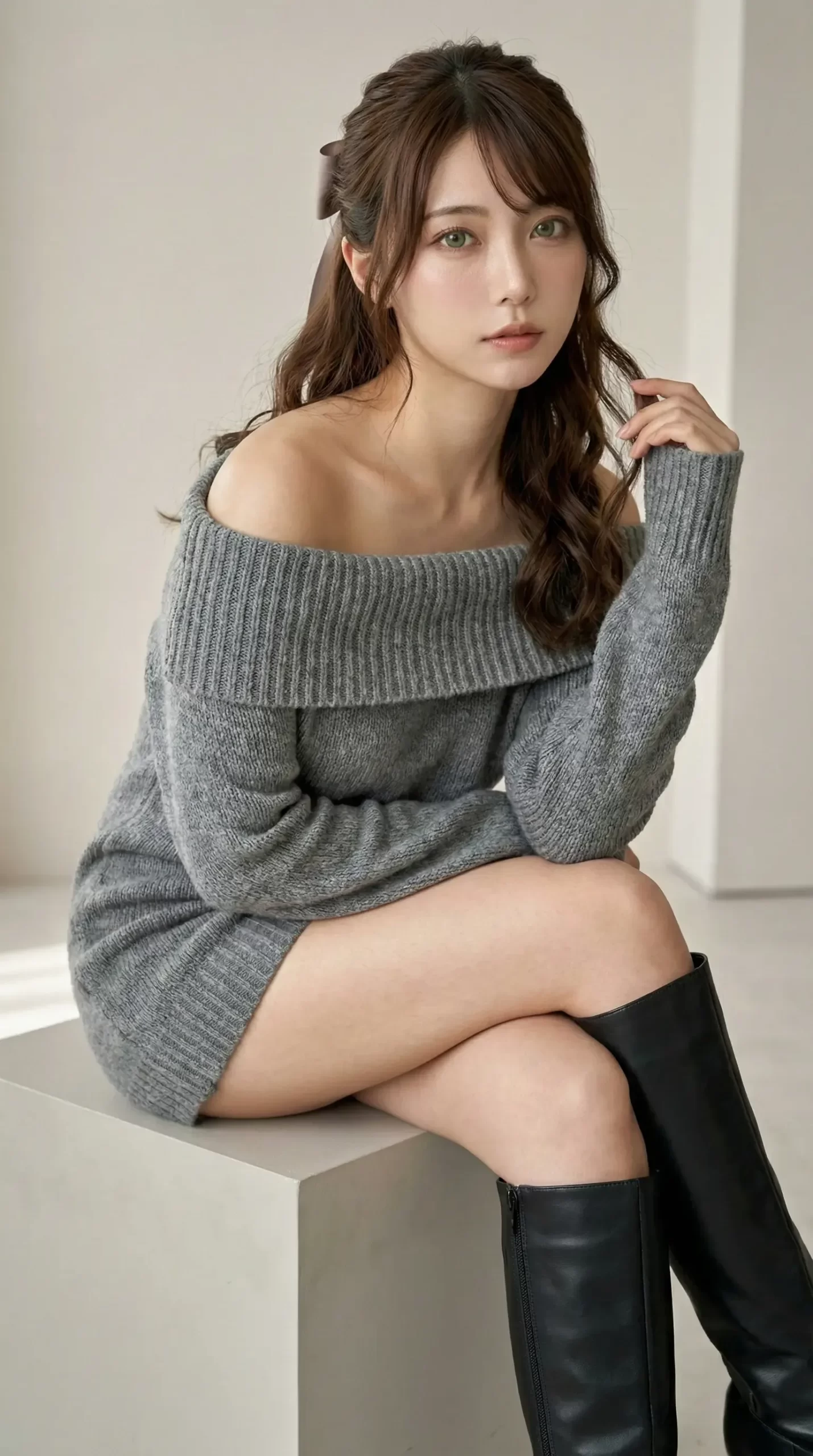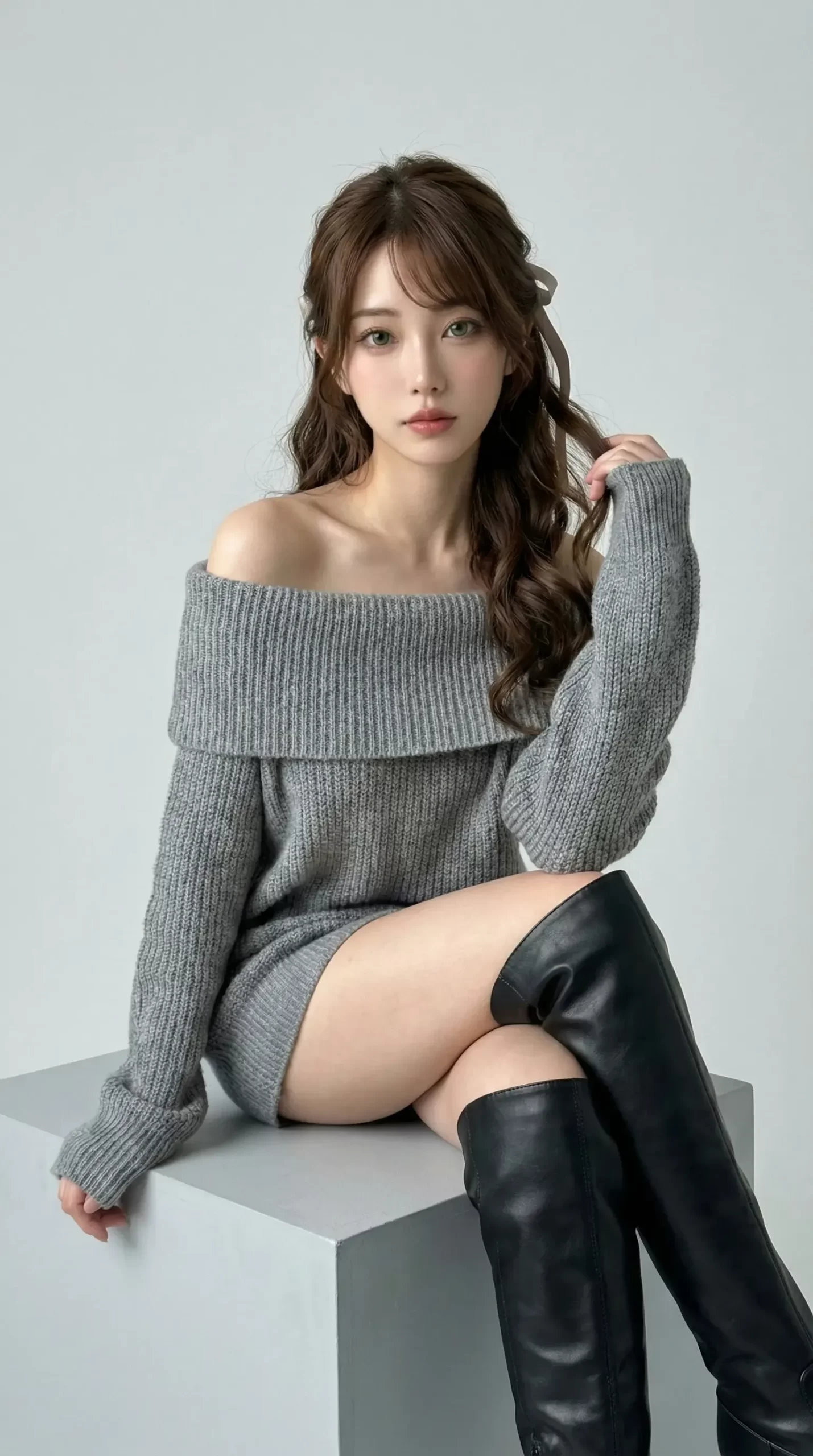 そして、なんといってもニットの裾からすらっと伸びる素肌の太ももと、黒ロングブーツの組み合わせ!この絶対的なコントラスト、たまらないですよね。少しクールなレザー調のブーツが全体の雰囲気を引き締めていて、セクシーなんだけど上品さもしっかり残っているのがポイント高いです。