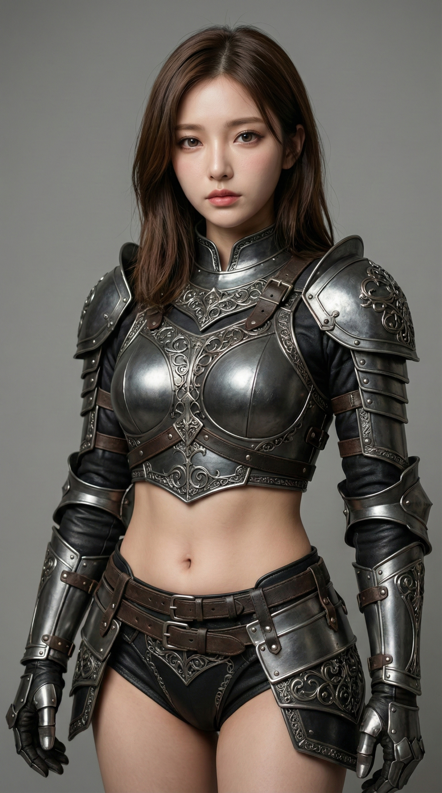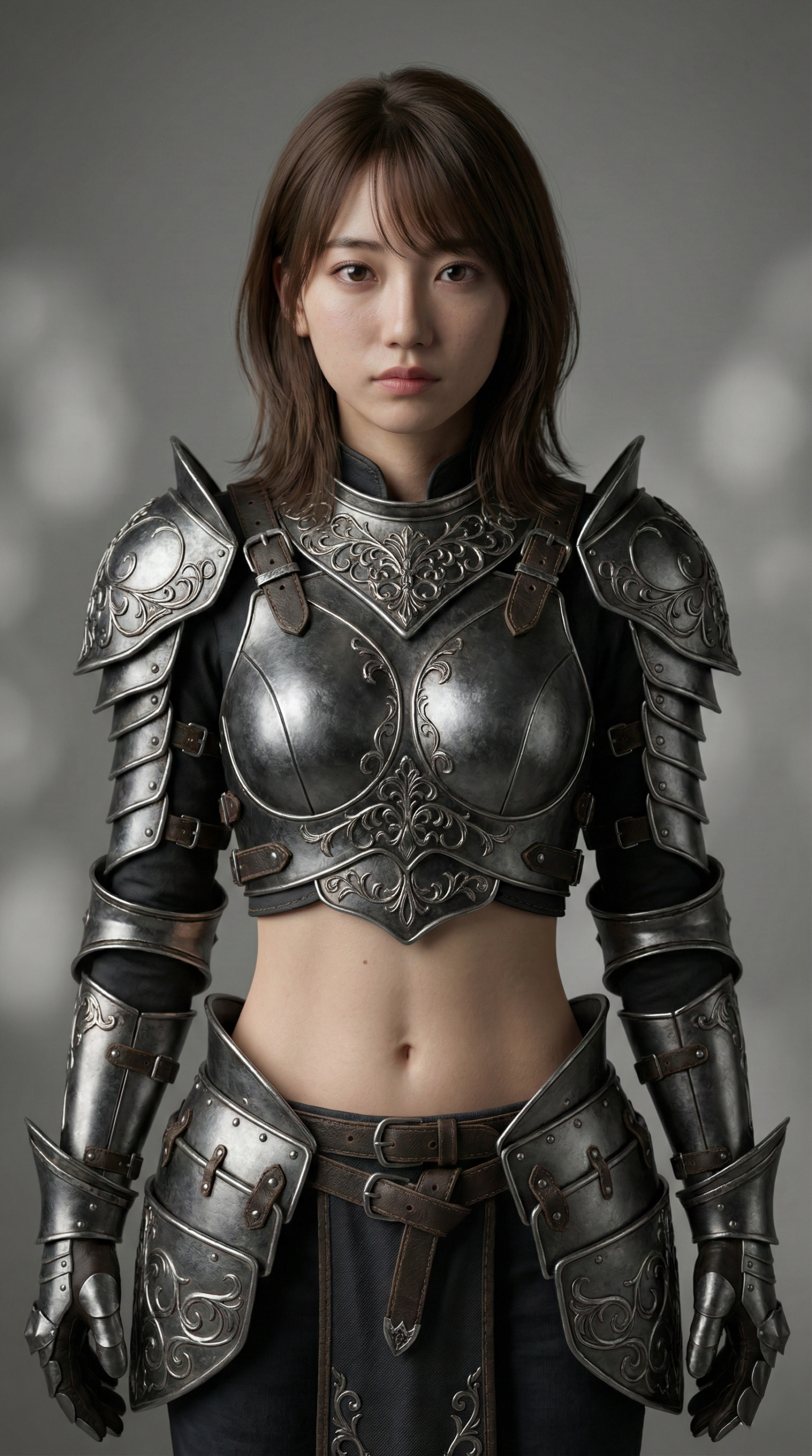 まず注目してほしいのが、この圧倒的なクオリティ。鎧に施された細かい装飾や、金属特有の冷たい光沢感、マジでリアルすぎませんか?まるで実写映画や、超大作RPGのヒロインがそのまま画面から出てきたような迫力です。