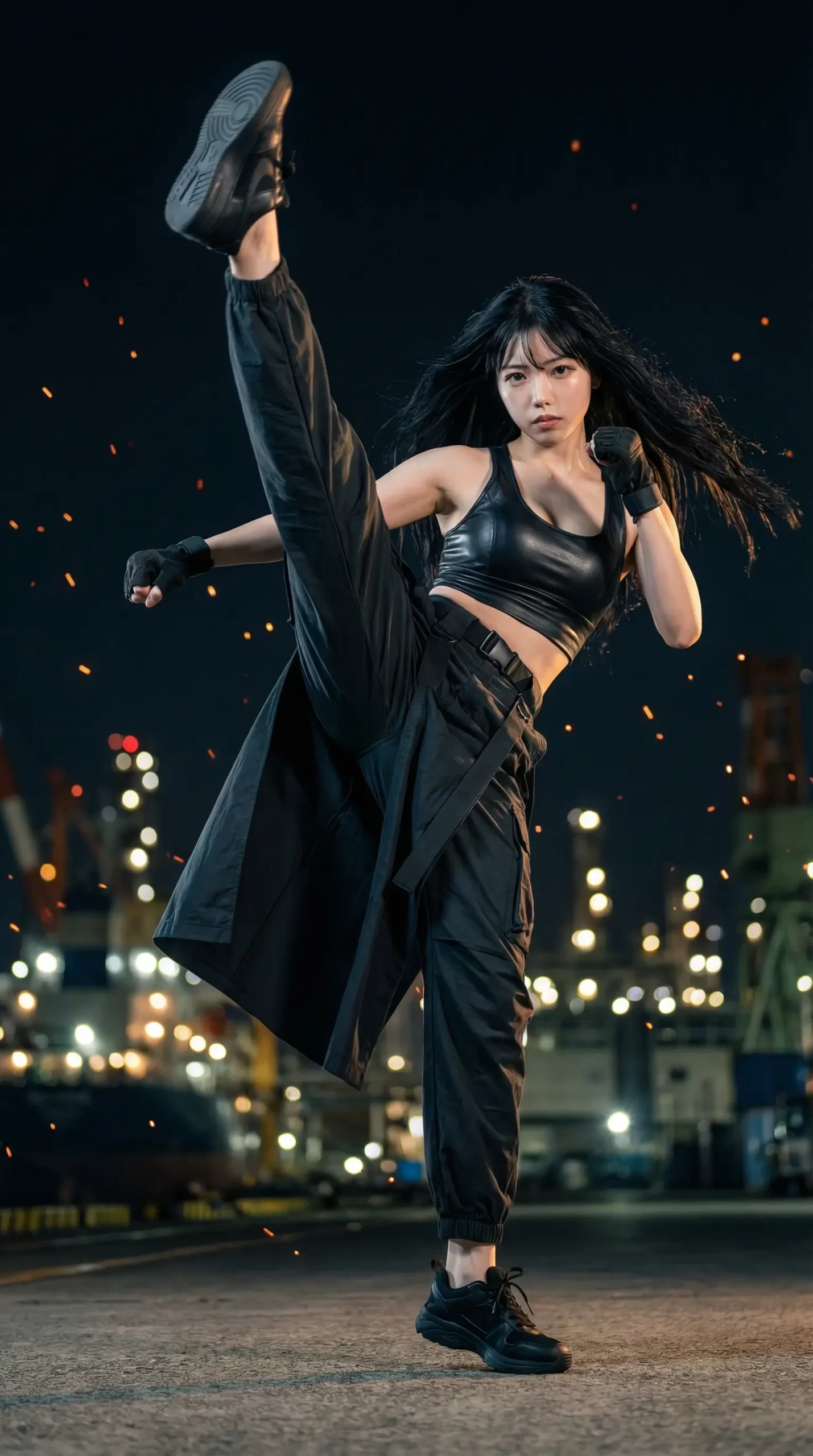 黒のレザー調ブラトップに、動きやすさとスタイリッシュさを兼ね備えたタクティカルな衣装が最高にクール。引き締まったお腹周りや、スリットから大胆に覗くしなやかで力強い脚のラインがマジで美しい……!健康的なセクシーさと、圧倒的な「強キャラ感」のバランスが絶妙すぎるよね。