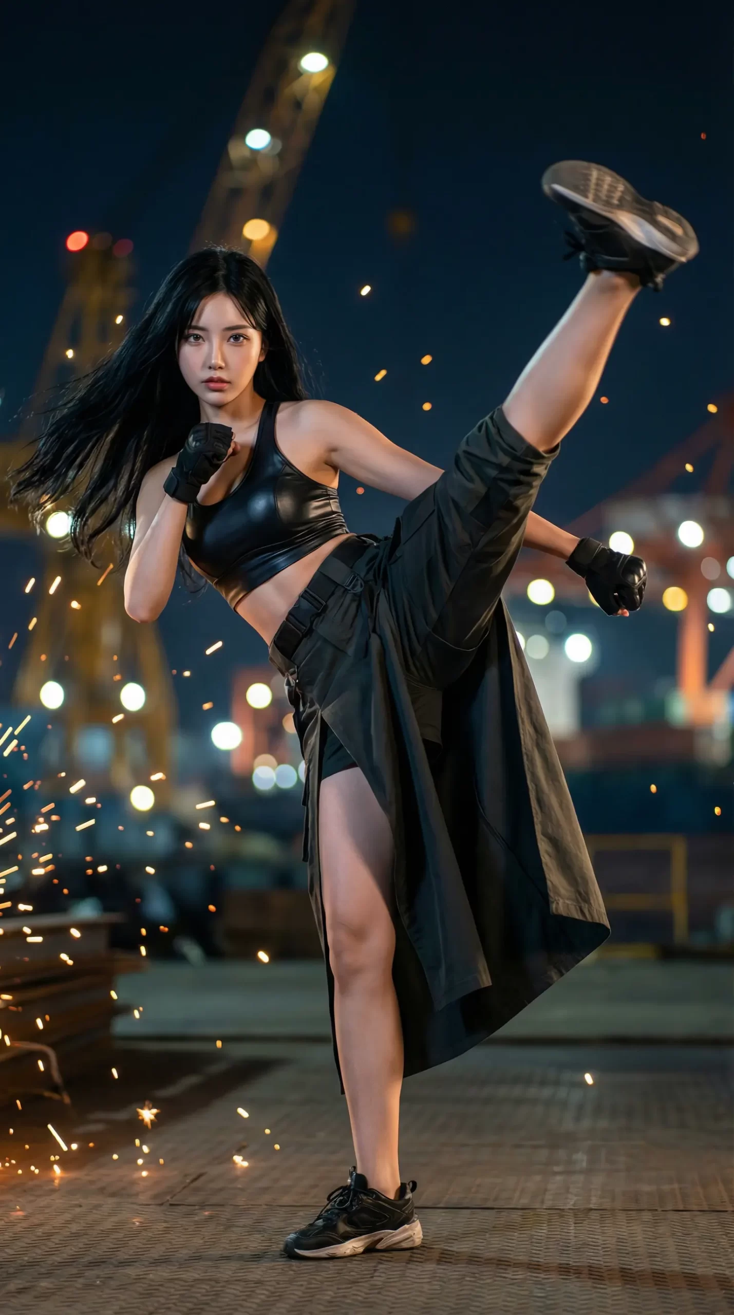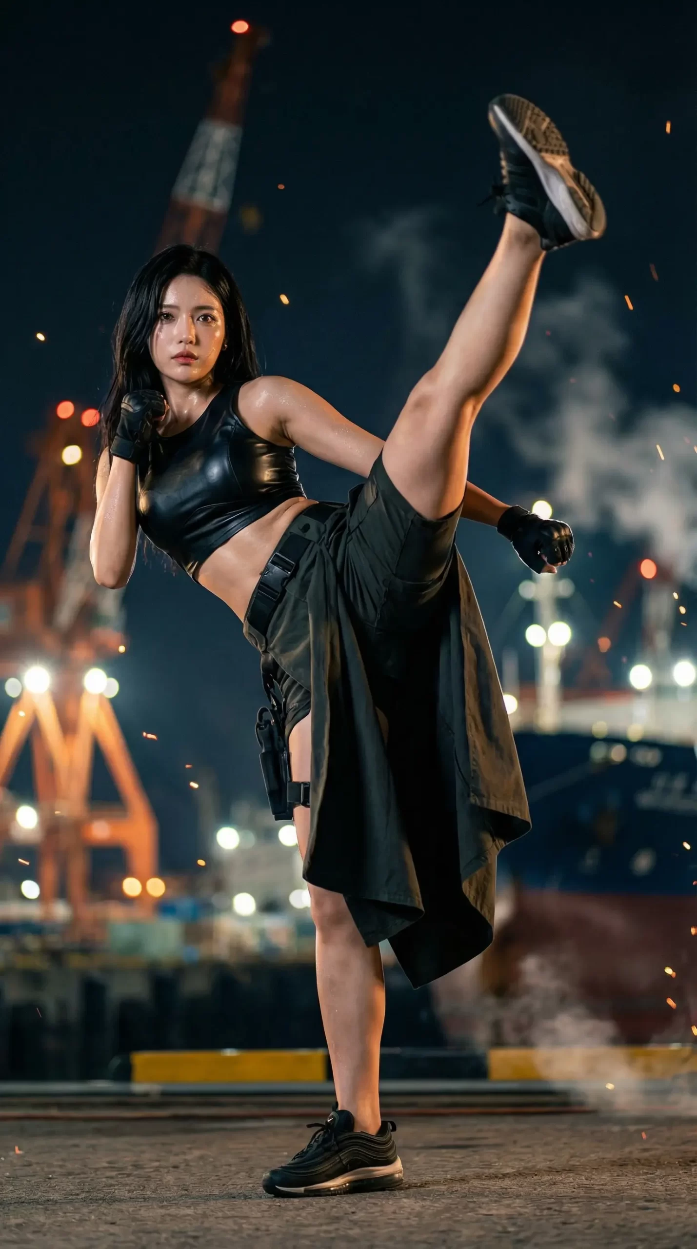 今回のシチュエーションは「夜の工場・港湾地帯」。 無骨なクレーンや鉄骨、ぼんやりと光る照明をバックに、バチバチと飛び散る火花……。これだけでアクション映画のクライマックスみたいで、めちゃくちゃテンション上がるよね!